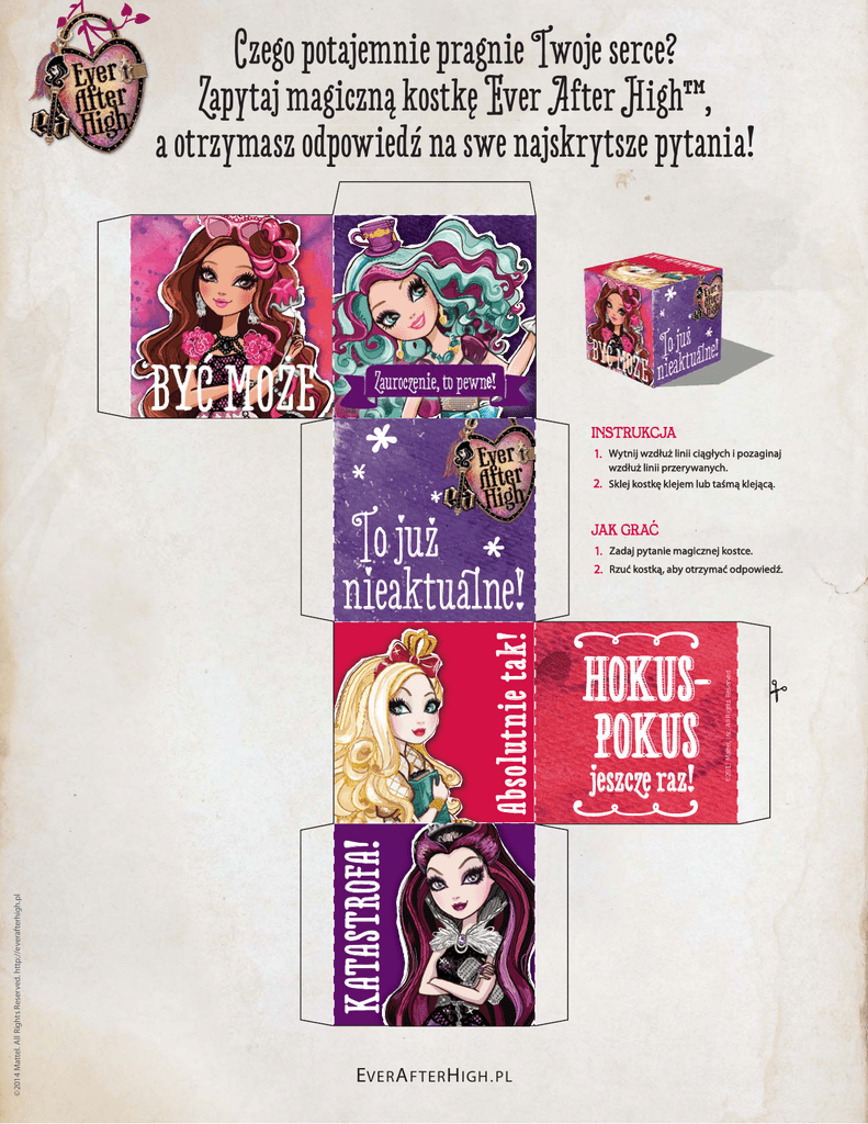 Czego potajemnie pragnie Twoje serce? Zapytaj magiczną kostkę Ever After High™, a otrzymasz odpowiedź na swe najskrytsze pytania! BYĆ MOŻE Zauroczenie, auroczenie, to pewne! INSTRUKCJA 1. Wytnij wzdłuż linii ciągłych i pozaginaj wzdłuż linii przerywanych. 2. Sklej kostkę klejem lub taśmą klejącą. KATASTROFA! ATASTROFA! ©2014 Mattel. All Rights Reserved. http://everafterhigh.pl EVER A FTER H IGH . PL JAK GRAĆ 1. Zadaj pytanie magicznej kostce. 2. Rzuć kostką, aby otrzymać odpowiedź. HOKUSPOKUS jeszcze raz! ©2013 ©201 ©20 2013 Ma Mat Matt M a el,, I nc nc. c A lll Ri R ghts ght hts Reser ese ser ved. v ve Absolutnie bsolutnie tak! Too już nieaktualne!