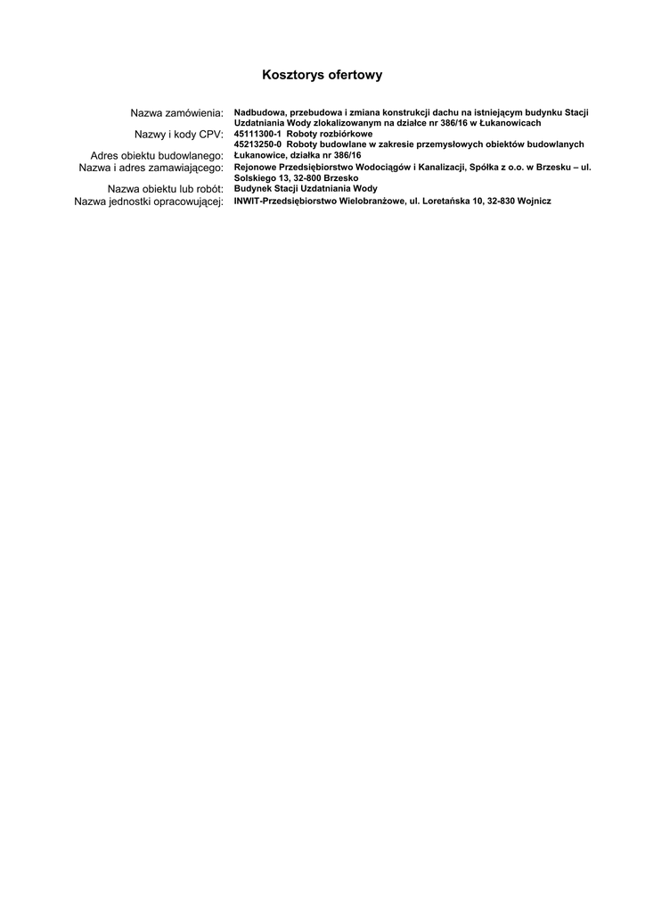 Kosztorys ofertowy Nazwa zamówienia: Nadbudowa, przebudowa i zmiana konstrukcji dachu na istniejącym budynku Stacji Uzdatniania Wody zlokalizowanym na działce nr 386/16 w Łukanowicach Nazwy i kody CPV: 45111300-1 Roboty rozbiórkowe 45213250-0 Roboty budowlane w zakresie przemysłowych obiektów budowlanych Adres obiektu budowlanego: Łukanowice, działka nr 386/16 Nazwa i adres zamawiającego: Rejonowe Przedsiębiorstwo Wodociągów i Kanalizacji, Spółka z o.o. w Brzesku – ul. Solskiego 13, 32-800 Brzesko Nazwa obiektu lub robót: Budynek Stacji Uzdatniania Wody Nazwa jednostki opracowującej: INWIT-Przedsiębiorstwo WielobranŜowe, ul. Loretańska 10, 32-830 Wojnicz SUW Łukanowice-RPWiK Jadowniki Zuzia10 (C) Datacomp 1994-2012(lic. 7378) strona nr: 2 Spis działów przedmiaru robót Nr 1 Nazwa działu robót Kody CPV: 45111300-1 Roboty rozbiórkowe Roboty robiórkowe Segment A 1.1 Rozebranie obróbek blacharskich: murów ogniowych, okapów kołnierzy, gzymsów itp. z blachy nie nadającej się do uŜytku 1.2 Rozebranie rur spustowych z blachy nadającej się do uŜytku 1.3 Rozebranie rynien z blachy nie nadającej się do uŜytku 1.4 Rozebranie pokrycia dachowego z blachy nie nadającej się do uŜytku 1.5 Roboty rozbiórkowe, betonowe czapki kominowe 1.6 Rozebranie konstrukcji więźb dachowych, ołacenie dachu 1.7 Rozebranie konstrukcji więźb dachowych, więźby ze stolcami 1.8 Rozebranie płyt dachowych Ŝelbetowych, przy grubości płyty do 10 cm 1.9 Rozebranie murów z cegły powyŜej terenu, w budynkach wysokości do 9·m (do 2 kondygnacji), na zaprawie cementowo-wapiennej 1.10 Wywiezienie gruzu z terenu rozbiórki przy ręcznym załadowaniu i mechanicznym wyładowaniu samochodem samowyładowczym, na odległość do 1·km Kody CPV: 45213250-0 Roboty budowlane w zakresie przemysłowych obiektów budowlanych 2 Roboty montaŜowe Segmant A 2.1 2.2 2.3 2.4 2.5 2.6 2.7 2.8 2.9 2.10 2.11 2.12 2.13 2.14 2.15 2.16 2.17 2.18 2.19 2.20 2.21 2.22 2.23 2.24 2.25 2.26 2.27 2.28 2.29 2.30 2.31 2.32 2.33 2.34 2.35 Ściany murowane, budynków wielokondygnacyjnych z bloczków z betonu komórkowego grub. 24 cm Belki i podciągi Ŝelbetowe, obwód/przekrój belki: do 8m/m2, beton podawany pompą - wieńce Zbrojenie konstrukcji Ŝelbetowych elementów budynków i budowli, pręty stalowe okrągłe Ŝebrowane, Fi 8-14·mm Zbrojenie konstrukcji Ŝelbetowych elementów budynków i budowli, pręty stalowe okrągłe gładkie, Fi do 7·mm Przemurowanie kominów z cegieł, ponad 0,5·m3/miejsce Deskowanie elementów betonowych i Ŝelbetowych, czapki kominowe Przygotowanie i montaŜ zbrojenia, pręty Fi do 6·mm, gładkie Uzupełnienie elementów konstrukcyjnych z betonu monolitycznego, czapki kominowe Docieplenie ścian budynków płytami styropianowymi i pokrycie wyprawami elewacyjnymi, przyklejenie styropianu i jednej warstwy siatki na powierzchni betonowej tynkowanej lub mozaice szklanej, ściany pełne /docieplenie kominów/ Obsadzenie drobnych elementów, w ścianach z cegieł, kratki wentylacyjne na kominie Uzupełnienie elementów wyposaŜenia dachu, wywietrzniki (dymniki)-deflektory typu Cagi Obróbki blacharskie z blachy powlekanej, szerokość w rozwinięciu ponad 25·cm - nadbudowa deflektorów z blachy Analogia. Izolacja wełną mineralną, rurociągi, grubość izolacji 100·mm, rurociąg Fi·65-254·mm Kalkulacja indywidualna. MontaŜ kontrkotew Fi 14 w istniejącym betonie długości 30 cm na kołku metalowym rozporowym Konstrukcje dachowe z tarcicy nasyconej, murłaty, przekrój poprzeczny drewna ponad 180·cm2 Konstrukcje dachowe z tarcicy nasyconej, murłaty, przekrój poprzeczny drewna do 180·cm2 - podwaliny 14 x7 Mechaniczne wykonanie ślepych otworów i wnęk w betonie, głębokość do 8·cm i średnicy do 20·mm Konstrukcje dachowe z tarcicy nasyconej: podwaliny długie, słupy - Ŝuraw, słupy do 2·m, przekrój poprzeczny drewna ponad 180·cm2 Konstrukcje dachowe z tarcicy nasyconej, ramy górne i płatwie ponad 3·m, przekrój poprzeczny drewna ponad 180·cm2 Konstrukcje dachowe z tarcicy nasyconej: miecze, kleszcze, krokwie - Ŝuraw, krokwie zwykłe do 4.5·m, przekrój do 180·cm2 - zastrzały Konstrukcje dachowe z tarcicy nasyconej: miecze, kleszcze, krokwie - Ŝuraw, krokwie zwykłe ponad 4.5·m, przekrój do 180·cm2 - krokowie Ołacenie połaci dachowych z tarcicy nasyconej, łaty 38x50·mm, rozstaw ponad 24·cm Analogia. Izolacja z folii paroprzepuszczalnej Analogia. Izolacja matami z wełny mineralnej pokrytej włókniną - grubość izolacji 200·mm Docieplenie ścian budynków płytami styropianowymi gr. 14 cm - metoda lekka ręcznie, na ścianie pod pokryciem Rura wywiewna z PVC o połączeniu wciskowym, Fi·110·mm Deskowanie połaci dachowych z tarcicy nasyconej - deska czołowa i koszowe Deskowanie połaci dachowych z tarcicy nasyconej - podbitka Obróbki blacharskie z blachy powlekanej, szerokość w rozwinięciu do 25·cm Obróbki blacharskie z blachy powlekanej, szerokość w rozwinięciu ponad 25·cm Pokrycie dachów o nachyleniu połaci do 85% blachą powlekaną trapezową na łatach, dachy ponad 100·m2 Rynny dachowe z blachy ocynkowanej, półokrągłe, Fi·15·cm malowane w kolorze niebieskim Rury spustowe z blachy ocynkowanej, okrągłe o średnicy 15·cm malowane w kolorze niebieskim Czyszczaki z PVC kanalizacyjne, o połączeniu wciskowym, Fi·160·mm Rynny dachowe z blachy ocynkowanej, półokrągłe, Fi·10·cm malowane w kolorze niebieskim Nadbudowa, przebudowa i zmiana konstrukcji dachu na istniejącym budynku Stacji Uzdatniania Wody zlokalizowanym na działce nr... SUW Łukanowice-RPWiK Jadowniki Nr 2.36 2.37 2.38 3 Zuzia10 (C) Datacomp 1994-2012(lic. 7378) strona nr: 3 Nazwa działu robót Rury spustowe z blachy ocynkowanej, okrągłe o średnicy 8·cm malowane w kolorze niebieskim Osadzenie okien w połaci dachowej, osadzenie włazu 0,7x0,7 Rusztowania zewnętrzne rurowe o wysokości do 10·m, nakłady podstawowe i czas pracy rusztowań Ko