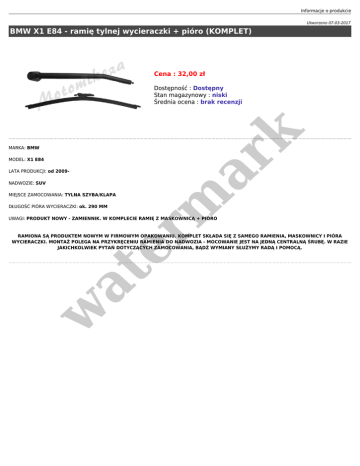 Informacje o produkcie Utworzono 07-03-2017 BMW X1 E84 - ramię tylnej wycieraczki + pióro (KOMPLET) Cena : 32,00 zł MARKA: BMW MODEL: X1 E84 LATA PRODUKCJI: od 2009NADWOZIE: SUV er m ar k Dostępność : Dostępny Stan magazynowy : niski Średnia ocena : brak recenzji MIEJSCE ZAMOCOWANIA: TYLNA SZYBA/KLAPA DŁUGOŚĆ PIÓRA WYCIERACZKI: ok. 290 MM UWAGI: PRODUKT NOWY - ZAMIENNIK. W KOMPLECIE RAMIĘ Z MASKOWNICĄ + PIÓRO w at RAMIONA SĄ PRODUKTEM NOWYM W FIRMOWYM OPAKOWANIU. KOMPLET SKŁADA SIĘ Z SAMEGO RAMIENIA, MASKOWNICY I PIÓRA WYCIERACZKI. MONTAŻ POLEGA NA PRZYKRĘCENIU RAMIENIA DO NADWOZIA - MOCOWANIE JEST NA JEDNĄ CENTRALNĄ ŚRUBĘ. W RAZIE JAKICHKOLWIEK PYTAŃ DOTYCZĄCYCH ZAMOCOWANIA, BĄDŻ WYMIANY SŁUŻYMY RADĄ I POMOCĄ.