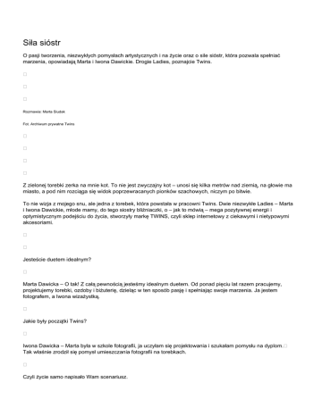 Siła sióstr O pasji tworzenia, niezwykłych pomysłach artystycznych i na życie oraz o sile sióstr, która pozwala spełniać marzenia, opowiadają Marta i Iwona Dawickie. Drogie Ladies, poznajcie Twins. Rozmawia: Marta Siudak Fot. Archiwum prywatne Twins Z zielonej torebki zerka na mnie kot. To nie jest zwyczajny kot – unosi się kilka metrów nad ziemią, na głowie ma miasto, a pod nim rozciąga się widok poprzewracanych pionków szachowych, niczym po bitwie. To nie wizja z mojego snu, ale jedna z torebek, która powstała w pracowni Twins. Dwie niezwykłe Ladies – Marta i Iwona Dawickie, młode mamy, do tego siostry bliźniaczki, o – jak to mówią – mega pozytywnej energii i optymistycznym podejściu do życia, stworzyły markę TWINS, czyli sklep internetowy z ciekawymi i nietypowymi akcesoriami. Jesteście duetem idealnym? Marta Dawicka – O tak! Z całą pewnością jesteśmy idealnym duetem. Od ponad pięciu lat razem pracujemy, projektujemy torebki, ozdoby i biżuterię, dzieląc w ten sposób pasję i spełniając swoje marzenia. Ja jestem fotografem, a Iwona wizażystką. Jakie były początki Twins? Iwona Dawicka – Marta była w szkole fotografii, ja uczyłam się projektowania i szukałam pomysłu na dyplom. Tak właśnie zrodził się pomysł umieszczania fotografii na torebkach. Czyli życie samo napisało Wam scenariusz. ID - Tak, a my poszłyśmy za ciosem. Pierwsze kroki stawiałyśmy w Wylęgarni, artystycznym sklepie internetowym. Pomysł na tyle się spodobał kobietom, że dziś mamy już swój sklep internetowy (www.twinsart.pl) i stacjonarny. Czy praca w takim duecie jest łatwa? Spotykacie się przecież nie tylko w życiu zawodowym, ale i prywatnym. Dużo czasu razem to więcej szans na spięcia? MD – W żadnym wypadku. Znamy się już tyle lat – nie ma co kryć, bo od urodzenia. I doskonale się dogadujemy. Coś niezwykłego jest w sile sióstr, że pozwala nam tworzyć owocnie. ID – Słyszałam, że z rodziną najlepiej wychodzi się na zdjęciu (śmiech). Jesteśmy totalnym zaprzeczeniem tej tezy. Polecam wszystkim robienie interesów z rodziną. Nie ma innej osoby, której ufałabym bardziej niż Marcie. A z obcymi ludźmi rożnie bywa, nawet ze znajomymi kontakty biznesowe bywają ryzykowne. MD – Żeby nie było sielankowo, to oczywiście, że bywają spory większe i mniejsze, ale zawsze wiadomo, że jesteśmy razem i nikt się z byle powodu nie wycofa. Właśnie przez to, że łączy nas tak wiele, mamy większą motywację, by znajdować rozwiązania, kompromisy, by działać i rozwijać się. Obie jesteście mamami. Jak godzicie macierzyństwo z pracą? ID – Tymon ma cztery latka, Oskar dwa. Często opiekujemy się dziećmi na zmianę, ale pomagają nam też mężowie. Staramy się dzielić opieką, jak tylko jest to możliwe, ale nie ukrywam, że babcie są nieocenione. Tymon uczęszcza do punktu przedszkolnego na kilka godzin dziennie, więc w tym czasie można trochę popracować. Wasze projekty są niezwykłe, nie mogłam się napatrzeć na torebki, śliniaczki dla dzieci, dodatki. Są piękne! ID - Masa kolorów i dziwnych, a przez to ciekawych, niebanalnych wzorów - to przyciąga kobiety do naszych projektów. Staramy się, by były wyjątkowe. Każdy dodatek żyje swoim życiem, aż dudni energią i zdecydowanie przyciąga uwagę czy to kolorem, czy fakturą. MD – Kobiety to lubią. Bo już jeden tak wyrazisty dodatek, w nawet bardzo prostej stylizacji, skutecznie wyróżni w tłumie. Nasze torebki są bardzo charakterystyczne, bardzo łatwo rozpoznać nasz styl i myślę, że to właśnie jest ich główny atut. Które z projektów Twins są najbardziej pożądane? MD – Najbardziej uwielbiane są modele z aktorkami – Marylin Monroe i Audrey Hepburn, te klasyczne, czarne, czyli kobiecość w najczystszym wydaniu. Nowa skórzana kolekcja torebek w rozmiarze XXL też cieszy się dużym powodzeniem. Z czego czerpiecie inspiracje? ID - Z podróży oraz polskiego folkloru. Uwielbiamy mocne kolory i niebanalne rozwiązania. Jakie, poza Twins, macie pasje? ID – Dla Marty ważna jest fotografia, w tym się rozwija. Dla mnie wizaż. Czyli nasze drugie zawody. Poza tym uwielbiamy czytać, to jest nasz wieczorny relaks i sposób na stres. Plany na przyszłość? MD – Chciałybyśmy mieć więcej dzieci. Co do firmy – chcemy się rozwijać. Jesteśmy właśnie w trakcie promowania naszej nowej skórzanej kolekcji, a kolejne pomysły już kiełkują w głowach. ID – Pomysłów jest wiele, tylko czasu na realizację wszystkich brak. Teraz marzymy o zasłużonych wakacjach. Piasek, słońce, jakieś ciepłe kraje i słodkie, błogie lenistwo na plaży. Poznaj projekty Twins - zobacz galerię pod artykułem! Torebki i inne projekty Twins możecie kupić na www.twinsart.pl.