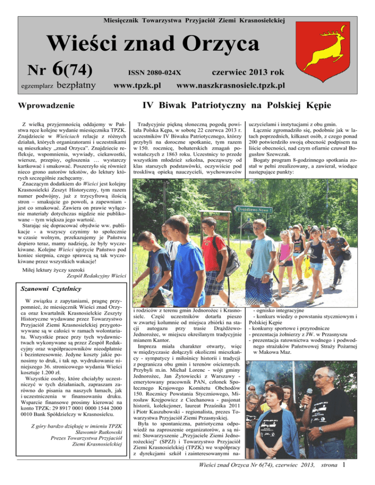 Miesięcznik Towarzystwa Przyjaciół Ziemi Krasnosielckiej Wieści znad Orzyca Nr 6(74) egzemplarz bezpłatny ISSN 2080-024X www.tpzk.pl Wprowadzenie Z wielką przyjemnością oddajemy w Państwa ręce kolejne wydanie miesięcznika TPZK. Znajdziecie w Wieściach relacje z różnych działań, których organizatorami i uczestnikami są mieszkańcy „znad Orzyca”. Znajdziecie refleksje, wspomnienia, wywiady, ciekawostki, wiersze, przepisy, ogłoszenia … wystarczy kartkować i smakować. Poszerzyło się również nieco grono autorów tekstów, do lektury których szczególnie zachęcamy. Znaczącym dodatkiem do Wieści jest kolejny Krasnosielcki Zeszyt Historyczny, tym razem numer podwójny, już z trzycyfrową ilością stron – smakujcie go powoli, a zapewniam jest co smakować. Zawiera on prawie wyłącznie materiały dotychczas nigdzie nie publikowane – tym większa jego wartość. Starając się dopracować obydwie ww. publikacje - a wszyscy czynimy to społecznie w czasie wolnym, przekazujemy je Państwu dopiero teraz, mamy nadzieję, że były wyczekiwane. Kolejne Wieści ujrzycie Państwo pod koniec sierpnia, czego sprawcą są tak wyczekiwane przez wszystkich wakacje! czerwiec 2013 rok www.naszkrasnosielc.tpzk.pl IV Biwak Patriotyczny na Polskiej Kępie Tradycyjnie piękną słoneczną pogodą powitała Polska Kępa, w sobotę 22 czerwca 2013 r. uczestników IV Biwaku Patriotycznego, którzy przybyli na doroczne spotkanie, tym razem w 150. rocznicę, bohaterskich zmagań powstańczych z 1863 roku. Uczestnicy to przede wszystkim młodzież szkolna, począwszy od klas starszych podstawówki, oczywiście pod troskliwą opieką nauczycieli, wychowawców uczycielami i instytucjami z obu gmin. Łącznie zgromadziło się, podobnie jak w latach poprzednich, kilkaset osób, z czego ponad 200 potwierdziło swoją obecność podpisem na liście obecności, nad czym ofiarnie czuwał Bogusław Szewczak. Bogaty program 8-godzinnego spotkania został w pełni zrealizowany, a zawierał, wiodące następujące punkty: i rodziców z terenu gmin Jednorożec i Krasnosielc. Część uczestników dotarła pieszo w zwartej kolumnie od miejsca zbiórki na stacji autogazu przy trasie DrążdżewoJednorożec, w miejscu określanym tradycyjnie mianem Kantor. Impreza miała charakter otwarty, więc w międzyczasie dołączyli okoliczni mieszkańcy - sympatycy i miłośnicy historii i tradycji z pogranicza obu gmin i terenów ościennych. Przybyli m.in. Michał Lorenc - wójt gminy Jednorożec, Jan Żytowiecki z Warszawy emerytowany pracownik PAN, członek Społecznego Krajowego Komitetu Obchodów 150. Rocznicy Powstania Styczniowego, Mirosław Krejpowicz z Ciechanowa - pasjonat historii, kolekcjoner, laureat Przaśnika 2011 i Piotr Kaszubowski - regionalista, prezes Towarzystwa Przyjaciół Ziemi Przasnyskiej. Była to spontaniczna, patriotyczna odpowiedź na zaproszenie organizatorów, a są nimi: Stowarzyszenie „Przyjaciele Ziemi Jednorożeckiej” (SPZJ) i Towarzystwo Przyjaciół Ziemi Krasnosielckiej (TPZK) we współpracy z dyrekcjami szkół i zainteresowanymi na- - ognisko integracyjne - konkurs wiedzy o powstaniu styczniowym i Polskiej Kępie - konkursy sportowe i przyrodnicze - prezentacja żołnierzy z JW. w Przasnyszu - prezentacja ratownictwa wodnego i podwodnego strażaków Państwowej Straży Pożarnej w Makowa Maz. Miłej lektury życzy szeroki Zespół Redakcyjny Wieści Szanowni Czytelnicy W związku z zapytaniami, pragnę przypomnieć, że miesięcznik Wieści znad Orzyca oraz kwartalnik Krasnosielckie Zeszyty Historyczne wydawane przez Towarzystwo Przyjaciół Ziemi Krasnosielckiej przygotowywane są w całości w ramach wolontariatu. Wszystkie prace przy tych wydawnictwach wykonywane są przez Zespół Redakcyjny oraz współpracowników nieodpłatnie i bezinteresownie. Jedyne koszty jakie ponosimy to druk, i tak np. wydrukowanie niniejszego 36. stronicowego wydania Wieści kosztuje 1.200 zł. Wszystkie osoby, które chciałyby uczestniczyć w tych działaniach, zapraszam zarówno do pisania na naszych łamach, jak i uczestniczenia w finansowaniu druku. Wsparcie finansowe prosimy kierować na konto TPZK: 29 8917 0001 0000 1544 2000 0010 Bank Spółdzielczy w Krasnosielcu. Z góry bardzo dziękuję w imieniu TPZK Sławomir Rutkowski Prezes Towarzystwa Przyjaciół Ziemi Krasnosielckiej Wieści znad Orzyca Nr 6(74), czerwiec 2013, strona 1 - pokaz grupy rekonstrukcyjnej 14 Pułku Strzelców Syberyjskich z Przasnysza - wystawa militariów - koncert zespołów: Unicorn z Jednorożca i gimnazjalistek z Krasnosielca - program słowno-muzyczny dzieci i młodzieży z Drążdżewa Nowego - Msza święta polowa - historia Polskiej Kępy - prelekcja - Apel poległych - występ zespołu „Kalina” - rozstrzygnięcie konkursu na wianek świętojański i puszczanie wianków na Orzycu. Wzrok przybywających na Polską Kępę kieruje się na wyniosły krzyż, biało-czerwoną flagę na maszcie, obelisk z inskrypcją ku czci powstańców i tablicę informacyjną: „Polska Kępa - tu w dniach 26-29 czerwca 1863 roku oddział powstańczy pod dowództwem kapitana Józefa Trąmpczyńskiego powstrzymał ofensywę wojsk rosyjskich”. Dalsza treść szczegółowo przedstawia przebieg bohaterskich zmagań z przeważającymi siłami wroga. Pierwsze trzy godziny biwaku upłynęły na różnotematycznych grach, zabawach prowadzonych profesjonalnie przez pracowników Nadleśnictw w Przasnyszu i w Parciakach oraz Krzysztofa Iwulskiego. Była okazja wykazać się wiedzą o lesie i jego mieszkańcach. Udział był premiowany sympatycznym gadżetem, nie mówiąc o nagrodach za zajęcie lokat punktowanych. Stąd nieustający komplet widzów, graczy i słuchaczy. Odbył się również konkurs wiedzy o Polskiej Kępie. Wzięło w nim udział 13 uczniów reprezentujących szkoły w Jednorożcu (9), Krasnosielcu (3) i Drążdżewie (1) zgrupowanych w trzy zespoły. Poziom wiedzy uczestników był bardzo wyró