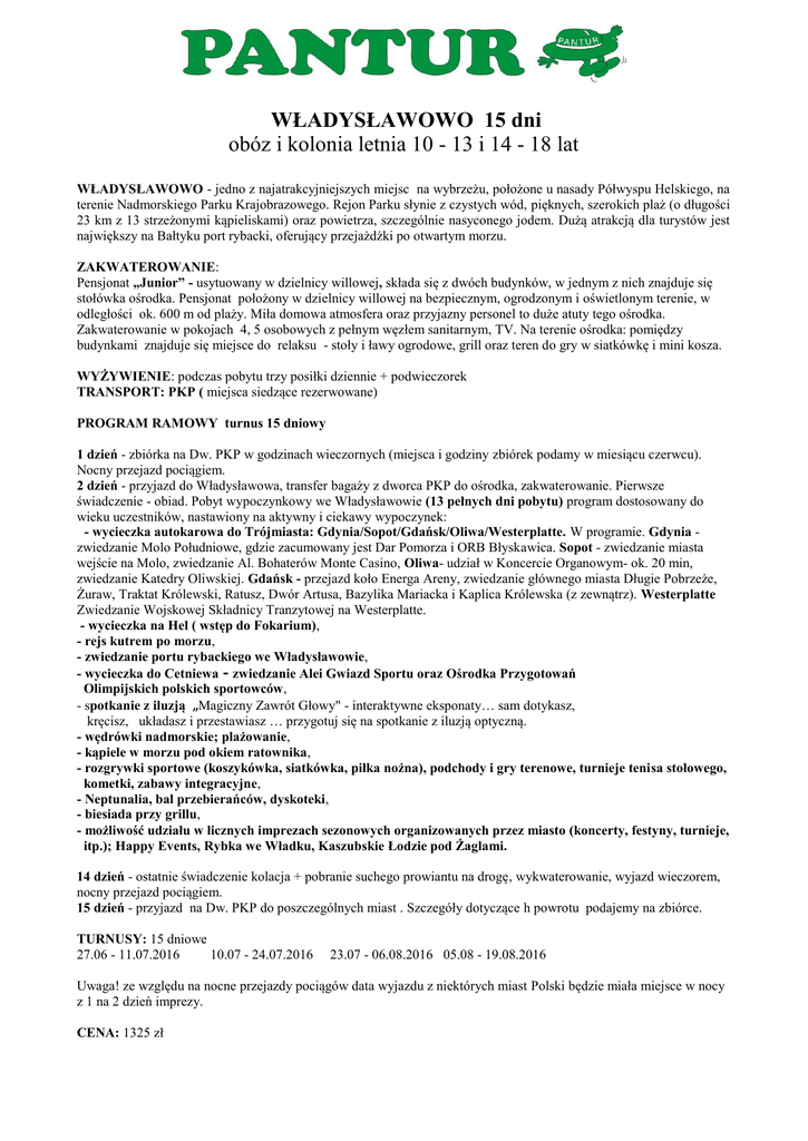 WŁADYSŁAWOWO 15 dni obóz i kolonia letnia 10 - 13 i 14 - 18 lat WŁADYSŁAWOWO - jedno z najatrakcyjniejszych miejsc na wybrzeżu, położone u nasady Półwyspu Helskiego, na terenie Nadmorskiego Parku Krajobrazowego. Rejon Parku słynie z czystych wód, pięknych, szerokich plaż (o długości 23 km z 13 strzeżonymi kąpieliskami) oraz powietrza, szczególnie nasyconego jodem. Dużą atrakcją dla turystów jest największy na Bałtyku port rybacki, oferujący przejażdżki po otwartym morzu. ZAKWATEROWANIE: Pensjonat „Junior” - usytuowany w dzielnicy willowej, składa się z dwóch budynków, w jednym z nich znajduje się stołówka ośrodka. Pensjonat położony w dzielnicy willowej na bezpiecznym, ogrodzonym i oświetlonym terenie, w odległości ok. 600 m od plaży. Miła domowa atmosfera oraz przyjazny personel to duże atuty tego ośrodka. Zakwaterowanie w pokojach 4, 5 osobowych z pełnym węzłem sanitarnym, TV. Na terenie ośrodka: pomiędzy budynkami znajduje się miejsce do relaksu - stoły i ławy ogrodowe, grill oraz teren do gry w siatkówkę i mini kosza. WYŻYWIENIE: podczas pobytu trzy posiłki dziennie + podwieczorek TRANSPORT: PKP ( miejsca siedzące rezerwowane) PROGRAM RAMOWY turnus 15 dniowy 1 dzień - zbiórka na Dw. PKP w godzinach wieczornych (miejsca i godziny zbiórek podamy w miesiącu czerwcu). Nocny przejazd pociągiem. 2 dzień - przyjazd do Władysławowa, transfer bagaży z dworca PKP do ośrodka, zakwaterowanie. Pierwsze świadczenie - obiad. Pobyt wypoczynkowy we Władysławowie (13 pełnych dni pobytu) program dostosowany do wieku uczestników, nastawiony na aktywny i ciekawy wypoczynek: - wycieczka autokarowa do Trójmiasta: Gdynia/Sopot/Gdańsk/Oliwa/Westerplatte. W programie. Gdynia zwiedzanie Molo Południowe, gdzie zacumowany jest Dar Pomorza i ORB Błyskawica. Sopot - zwiedzanie miasta wejście na Molo, zwiedzanie Al. Bohaterów Monte Casino, Oliwa- udział w Koncercie Organowym- ok. 20 min, zwiedzanie Katedry Oliwskiej. Gdańsk - przejazd koło Energa Areny, zwiedzanie głównego miasta Długie Pobrzeże, Żuraw, Traktat Królewski, Ratusz, Dwór Artusa, Bazylika Mariacka i Kaplica Królewska (z zewnątrz). Westerplatte Zwiedzanie Wojskowej Składnicy Tranzytowej na Westerplatte. - wycieczka na Hel ( wstęp do Fokarium), - rejs kutrem po morzu, - zwiedzanie portu rybackiego we Władysławowie, - wycieczka do Cetniewa - zwiedzanie Alei Gwiazd Sportu oraz Ośrodka Przygotowań Olimpijskich polskich sportowców, - spotkanie z iluzją „Magiczny Zawrót Głowy" - interaktywne eksponaty… sam dotykasz, kręcisz, układasz i przestawiasz … przygotuj się na spotkanie z iluzją optyczną. - wędrówki nadmorskie; plażowanie, - kąpiele w morzu pod okiem ratownika, - rozgrywki sportowe (koszykówka, siatkówka, piłka nożna), podchody i gry terenowe, turnieje tenisa stołowego, kometki, zabawy integracyjne, - Neptunalia, bal przebierańców, dyskoteki, - biesiada przy grillu, - możliwość udziału w licznych imprezach sezonowych organizowanych przez miasto (koncerty, festyny, turnieje, itp.); Happy Events, Rybka we Władku, Kaszubskie Łodzie pod Żaglami. 14 dzień - ostatnie świadczenie kolacja + pobranie suchego prowiantu na drogę, wykwaterowanie, wyjazd wieczorem, nocny przejazd pociągiem. 15 dzień - przyjazd na Dw. PKP do poszczególnych miast . Szczegóły dotyczące h powrotu podajemy na zbiórce. TURNUSY: 15 dniowe 27.06 - 11.07.2016 10.07 - 24.07.2016 23.07 - 06.08.2016 05.08 - 19.08.2016 Uwaga! ze względu na nocne przejazdy pociągów data wyjazdu z niektórych miast Polski będzie miała miejsce w nocy z 1 na 2 dzień imprezy. CENA: 1325 zł CENA ZAWIERA: Transport PKP, wyjazdy w cenie z: Katowic, Krakowa, Częstochowy, Łodzi, Warszawy, Kielc, Bydgoszczy (przedziały rezerwowane, miejsca siedzące), zakwaterowanie (12 noclegów), wyżywienie FB, suchy prowiant na drogę powrotną, program, kierownika, wychowawców, ratownika wodnego, doraźną opiekę medyczną, ubezpieczenie NNW do kwoty 10 000 PLN (wg umowy generalnej na warunkach ogólnych T.U AXA) i podatek VAT. ZA DODATKOWĄ OPŁATĄ: dojazd z Lublina + 50 zł, Opola + 50 zł, Wrocławia + 80 zł, Rzeszowa + 50 zł Uwaga ! Proponujemy zabrać z sobą ok. 100 zł kieszonkowego na własne potrzeby - pieniądze można zdeponować u wychowawców. Prosimy o zabranie karty kolonijno - obozowej z nr PESEL, obowiązkowo - legitymacji szkolnej, ponadto odpowiedniej odzieży i obuwia; kostiumu kąpielowego, klapek, nakrycia głowy, kremu z filtrem do opalania.