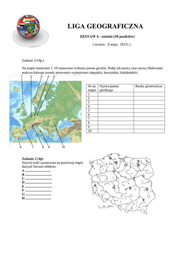 LIGA GEOGRAFICZNA ZESTAW 6 - ostatni (30 punktów) ( termin: 8 maja 2015r.) Zadanie 1(10p.) Na mapie numerami 1–10 oznaczono wybrane pasma górskie. Podaj ich nazwy oraz nazwę fałdowanie podczas którego zostały pierwotnie wypiętrzone (alpejskie, hercyńskie, kaledońskie) Nr na Nazwa pasma mapie górskiego 1 2 3 4 5 6 7 8 9 10 Zadanie 2 (4p) Nazwij rzeki zaznaczone na poniższej mapie dużymi literami alfabetu. A .............................. B ............................... C ............................... D ............................... E ............................... F ............................... G .............................. H .............................. Ruchy górotwórcze Lp 1. 2. 3. 4. 5. Zadanie 3 (5p) a) Uzupełnij tabelę: Nazwa kanału Połączenie śródlądowego Litera na mapie Wieprz - Krzna Augustowski Kłodnica - Odra Żerański J. Drwęckie – J. Druzno Zadanie 4 ( 5p) Na podstawie map konturowych i współrzędnych geograficznych stolic, rozpoznaj i zapisz nazwy państw i ich stolic. Zadanie 5 (6p) Uporządkuj podane nazwy geograficzne według kontynentów i kategorii wpisując je odpowiednio do tabeli. W każdej komórce tabeli może znaleźć się tylko jedna nazwa. Wszystkie nazwy powinny być wykorzystane. kontynent kraina geogr. szczyt górski półwysep rzeka jezioro Afryka Ameryka Pd. Ameryka Pn. Australia Azja Europa Nazwy do uporządkowania: Ahaggar, Andy, Apeniński, Arabski, Aconcagua, Bajkał, Brunswick, Dunaj, Eyre, G. Kościuszki, Harz, Jork, Jukon, Labrador, Lhotse, Matterhorn, Mekong, Murray, McKinley, Niger, Niz. Zatokowa, Niz. Nullarbor, Onega, Ontario, Orinoko, Ruwenzori, Somalijski, Tanganika, Titicaca, Tybet,