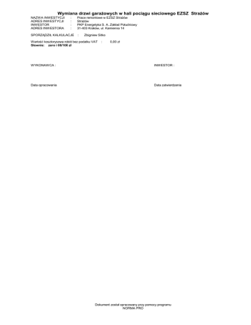 Wymiana drzwi garażowych w hali pociągu sieciowego EZSZ Strażów NAZWA INWESTYCJI ADRES INWESTYCJI INWESTOR ADRES INWESTORA : : : : SPORZĄDZIŁ KALKULACJE Prace remontowe w EZSZ Strażów Strażów PKP Energetyka S. A..Zakład Południowy 31-403 Kraków, ul. Kamienna 14 : Zbigniew Sitko Wartość kosztorysowa robót bez podatku VAT Słownie: zero i 00/100 zł : 0,00 zł WYKONAWCA : INWESTOR : Data opracowania Data zatwierdzenia Dokument został opracowany przy pomocy programu NORMA PRO Strażów - wymiana drzwi garażowych w hali pociagu sieciowego EZSZ Strażów przedmiar.kst Lp. Podstawa 1 1 KNR 4-01 d.1 0354-10 Opis jm Wymiana drzwi garażowych Wykucie z muru ościeżnic stalowych lub krat drzwiowych o powierzchni ponad 2 m2 obmiar = 20,880 m2 Nakłady -- R -robocizna r-g 0,63 r-g/m2 Razem koszty bezpośrednie: Razem z narzutami: Cena jednostkowa: 0,00 2 KNR 4-01 Wykonanie tynków zwykłych wewnętrznych kat. m d.1 0708-03 III z zaprawy cementowo-wapiennej na ościeżach szerokości do 40 cm obmiar = 10,950 m 2* 3* 4* 5* 6* -- R -robocizna 0,95 r-g/m -- M -cement portlandzki z dodatkami 25 0,0021 t/m wapno suchogaszone 0,0026 t/m piasek do zapraw 0,0106 m3/m woda z rurociągu 0,0027 m3/m materiały pomocnicze 1,5 %(od M) -- R -robocizna 4,22 r-g/m2 3* 13,1544 0,0000 0,0000 0,0000 0,00 0,0000 0,0000 0,0000 t 0,0230 0,0000 0,00 t 0,0285 0,0000 0,00 m3 0,1161 0,0000 0,00 m3 0,0296 0,0000 0,00 % 1,5000 0,0000 0,00 0,2190 0,0000 0,00 0,3285 0,0000 0,00 0,00 0,0000 0,0000 r-g 88,1136 0,0000 m2 20,8800 0,0000 m-g 3,1320 0,0000 -- M -Brama garażowa podnoszona segmentowa z drzwiami o wym. 4,35x4,80 w kolorze RAL 3011 lub pokrewnym 1 m2/m2 -- S -środek transportowy 0,15 m-g/m2 Razem koszty bezpośrednie: Razem z narzutami: Cena jednostkowa: S 10,4025 -- S -wyciąg jednomasztowy z napędem elektrycznym m-g 0,5 t 0,02 m-g/m 8* betoniarka wolnospadowa elektryczna m-g 0,03 m-g/m Razem koszty bezpośrednie: Razem z narzutami: Cena jednostkowa: 0,00 3 KNR-W 2-02 Bramy uchylne garażowe podnoszone mecham2 d.1 1032-01 nicznie z drzwiami - kolor RAL 3011 lub pokrewny do akceptacji przez inwestora obmiar = 20,880 m2 2* M r-g 7* 1* R m2 1* 1* Koszt jedn. 0,0000 0,0000 0,00 0,00 0,00 0,0000 0,00 0,0000 0,0000 0,0000 PODSUMOWANIE RAZEM Robocizna Wymiana drzwi garażowych Materiały Sprzęt RAZEM OGÓŁEM Słownie: zero i 00/100 zł -2- Norma PRO Wersja 4.45 Nr seryjny: 32340 Użytkownik: Zbignie Sitko Strażów - wymiana drzwi garażowych w hali pociagu sieciowego PODSUMOWANIE EZSZ Strażów przedmiar.kst RAZEM Robocizna Materiały CAŁY KOSZTORYS Sprzęt RAZEM OGÓŁEM Słownie: zero i 00/100 zł -3- Norma PRO Wersja 4.45 Nr seryjny: 32340 Użytkownik: Zbignie Sitko Strażów - wymiana drzwi garażowych w hali pociagu sieciowego ZESTAWIENIE EZSZ Strażów ROBOCIZNY przedmiar.kst Lp. 1. robocizna Nazwa Jm r-g Słownie: zero i 00/100 zł -4- Norma PRO Wersja 4.45 Nr seryjny: 32340 Użytkownik: Zbignie Sitko Ilość 111,6705 Cena jedn. 0,00 RAZEM Wartość 0,00 Strażów - wymiana drzwi garażowych w hali pociagu sieciowego ZESTAWIENIE EZSZ Strażów MATERIAŁÓW przedmiar.kst Lp. Nazwa 1. Brama garażowa podnoszona segmentowa z drzwiami o wym. 4,35x4,80 w kolorze RAL 3011 lub pokrewnym 2. cement portlandzki z dodatkami 25 3. piasek do zapraw 4. wapno suchogaszone 5. woda z rurociągu 6. materiały pomocnicze Jm Ilość Il. inw. Il. wyk. Cena jedn. Wartość m2 20,8800 20,8800 0,00 0,00 t m3 t m3 zł 0,0230 0,1161 0,0285 0,0296 0,0230 0,1161 0,0285 0,0296 0,00 0,00 0,00 0,00 0,00 0,00 0,00 0,00 0,00 RAZEM Słownie: zero i 00/100 zł -5- Norma PRO Wersja 4.45 Nr seryjny: 32340 Użytkownik: Zbignie Sitko Grupa DoCeRastaw- na do- bat ca stawcy maksymalny Rabat zastosowany Strażów - wymiana drzwi garażowych w hali pociagu sieciowego ZESTAWIENIE EZSZ Strażów SPRZĘTU przedmiar.kst Lp. Nazwa 1. betoniarka wolnospadowa elektryczna 2. środek transportowy 3. wyciąg jednomasztowy z napędem elektrycznym 0,5 t Jm m-g m-g m-g Słownie: zero i 00/100 zł -6- Norma PRO Wersja 4.45 Nr seryjny: 32340 Użytkownik: Zbignie Sitko Ilość Cena jedn. 0,3285 0,00 3,1320 0,00 0,2190 0,00 RAZEM Wartość 0,00 0,00 0,00