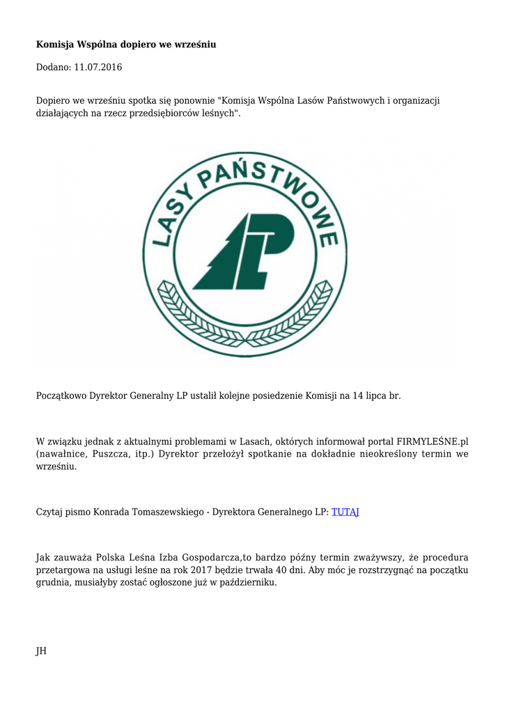 Komisja Wspólna dopiero we wrześniu Dodano: 11.07.2016 Dopiero we wrześniu spotka się ponownie "Komisja Wspólna Lasów Państwowych i organizacji działających na rzecz przedsiębiorców leśnych". Początkowo Dyrektor Generalny LP ustalił kolejne posiedzenie Komisji na 14 lipca br. W związku jednak z aktualnymi problemami w Lasach, októrych informował portal FIRMYLEŚNE.pl (nawałnice, Puszcza, itp.) Dyrektor przełożył spotkanie na dokładnie nieokreślony termin we wrześniu. Czytaj pismo Konrada Tomaszewskiego - Dyrektora Generalnego LP: TUTAJ Jak zauważa Polska Leśna Izba Gospodarcza,to bardzo późny termin zważywszy, że procedura przetargowa na usługi leśne na rok 2017 będzie trwała 40 dni. Aby móc je rozstrzygnąć na początku grudnia, musiałyby zostać ogłoszone już w październiku. JH Komentarze (0) Nie dodano jeszcze żadnego komentarza.