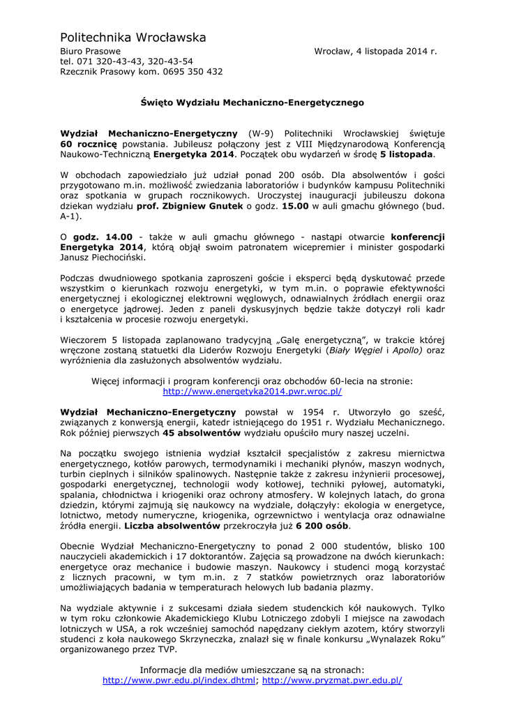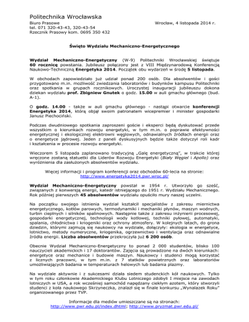 Politechnika Wrocławska Biuro Prasowe tel. 071 320-43-43, 320-43-54 Rzecznik Prasowy kom. 0695 350 432 Wrocław, 4 listopada 2014 r. Święto Wydziału Mechaniczno-Energetycznego Wydział Mechaniczno-Energetyczny (W-9) Politechniki Wrocławskiej świętuje 60 rocznicę powstania. Jubileusz połączony jest z VIII Międzynarodową Konferencją Naukowo-Techniczną Energetyka 2014. Początek obu wydarzeń w środę 5 listopada. W obchodach zapowiedziało już udział ponad 200 osób. Dla absolwentów i gości przygotowano m.in. możliwość zwiedzania laboratoriów i budynków kampusu Politechniki oraz spotkania w grupach rocznikowych. Uroczystej inauguracji jubileuszu dokona dziekan wydziału prof. Zbigniew Gnutek o godz. 15.00 w auli gmachu głównego (bud. A-1). O godz. 14.00 - także w auli gmachu głównego - nastąpi otwarcie konferencji Energetyka 2014, którą objął swoim patronatem wicepremier i minister gospodarki Janusz Piechociński. Podczas dwudniowego spotkania zaproszeni goście i eksperci będą dyskutować przede wszystkim o kierunkach rozwoju energetyki, w tym m.in. o poprawie efektywności energetycznej i ekologicznej elektrowni węglowych, odnawialnych źródłach energii oraz o energetyce jądrowej. Jeden z paneli dyskusyjnych będzie także dotyczył roli kadr i kształcenia w procesie rozwoju energetyki. Wieczorem 5 listopada zaplanowano tradycyjną „Galę energetyczną”, w trakcie której wręczone zostaną statuetki dla Liderów Rozwoju Energetyki (Biały Węgiel i Apollo) oraz wyróżnienia dla zasłużonych absolwentów wydziału. Więcej informacji i program konferencji oraz obchodów 60-lecia na stronie: http://www.energetyka2014.pwr.wroc.pl/ Wydział Mechaniczno-Energetyczny powstał w 1954 r. Utworzyło go sześć, związanych z konwersją energii, katedr istniejącego do 1951 r. Wydziału Mechanicznego. Rok później pierwszych 45 absolwentów wydziału opuściło mury naszej uczelni. Na początku swojego istnienia wydział kształcił specjalistów z zakresu miernictwa energetycznego, kotłów parowych, termodynamiki i mechaniki płynów, maszyn wodnych, turbin cieplnych i silników spalinowych. Następnie także z zakresu inżynierii procesowej, gospodarki energetycznej, technologii wody kotłowej, techniki pyłowej, automatyki, spalania, chłodnictwa i kriogeniki oraz ochrony atmosfery. W kolejnych latach, do grona dziedzin, którymi zajmują się naukowcy na wydziale, dołączyły: ekologia w energetyce, lotnictwo, metody numeryczne, kriogenika, ogrzewnictwo i wentylacja oraz odnawialne źródła energii. Liczba absolwentów przekroczyła już 6 200 osób. Obecnie Wydział Mechaniczno-Energetyczny to ponad 2 000 studentów, blisko 100 nauczycieli akademickich i 17 doktorantów. Zajęcia są prowadzone na dwóch kierunkach: energetyce oraz mechanice i budowie maszyn. Naukowcy i studenci mogą korzystać z licznych pracowni, w tym m.in. z 7 statków powietrznych oraz laboratoriów umożliwiających badania w temperaturach helowych lub badania plazmy. Na wydziale aktywnie i z sukcesami działa siedem studenckich kół naukowych. Tylko w tym roku członkowie Akademickiego Klubu Lotniczego zdobyli I miejsce na zawodach lotniczych w USA, a rok wcześniej samochód napędzany ciekłym azotem, który stworzyli studenci z koła naukowego Skrzyneczka, znalazł się w finale konkursu „Wynalazek Roku” organizowanego przez TVP. Informacje dla mediów umieszczane są na stronach: http://www.pwr.edu.pl/index.dhtml; http://www.pryzmat.pwr.edu.pl/