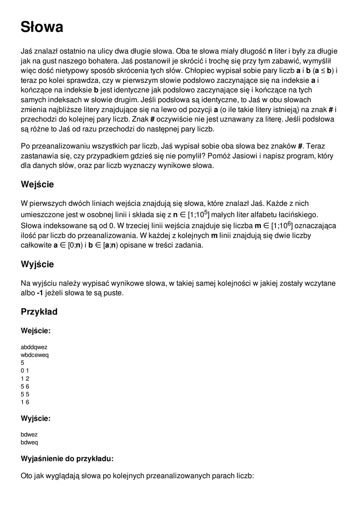 Słowa Jaś znalazł ostatnio na ulicy dwa długie słowa. Oba te słowa miały długość n liter i były za długie jak na gust naszego bohatera. Jaś postanowił je skrócić i trochę się przy tym zabawić, wymyślił więc dość nietypowy sposób skrócenia tych słów. Chłopiec wypisał sobie pary liczb a i b (a ≤ b) i teraz po kolei sprawdza, czy w pierwszym słowie podsłowo zaczynające się na indeksie a i kończące na indeksie b jest identyczne jak podsłowo zaczynające się i kończące na tych samych indeksach w słowie drugim. Jeśli podsłowa są identyczne, to Jaś w obu słowach zmienia najbliższe litery znajdujące się na lewo od pozycji a (o ile takie litery istnieją) na znak # i przechodzi do kolejnej pary liczb. Znak # oczywiście nie jest uznawany za literę. Jeśli podsłowa są różne to Jaś od razu przechodzi do następnej pary liczb. Po przeanalizowaniu wszystkich par liczb, Jaś wypisał sobie oba słowa bez znaków #. Teraz zastanawia się, czy przypadkiem gdzieś się nie pomylił? Pomóż Jasiowi i napisz program, który dla danych słów, oraz par liczb wyznaczy wynikowe słowa. Wejście W pierwszych dwóch liniach wejścia znajdują się słowa, które znalazł Jaś. Każde z nich umieszczone jest w osobnej linii i składa się z n ∈ [1;105] małych liter alfabetu łacińskiego. Słowa indeksowane są od 0. W trzeciej linii wejścia znajduje się liczba m ∈ [1;106] oznaczająca ilość par liczb do przeanalizowania. W każdej z kolejnych m linii znajdują się dwie liczby całkowite a ∈ [0;n) i b ∈ [a;n) opisane w treści zadania. Wyjście Na wyjściu należy wypisać wynikowe słowa, w takiej samej kolejności w jakiej zostały wczytane albo -1 jeżeli słowa te są puste. Przykład Wejście: abddqwez wbdceweq 5 01 12 56 55 16 Wyjście: bdwez bdweq Wyjaśnienie do przykładu: Oto jak wyglądają słowa po kolejnych przeanalizowanych parach liczb: 1. abddqwez wbdceweq 2. #bddqwez #bdceweq 3. #bdd#wez #bdc#weq 4. #bd##wez #bd##weq 5. #bd##wez #bd##weq