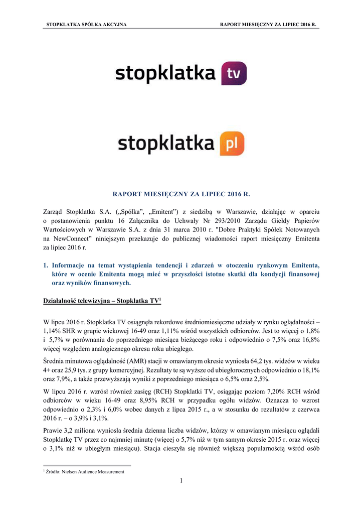 STOPKLATKA SPÓŁKA AKCYJNA RAPORT MIESIĘCZNY ZA LIPIEC 2016 R. RAPORT MIESIĘCZNY ZA LIPIEC 2016 R. Zarząd Stopklatka S.A. („Spółka”, „Emitent”) z siedzibą w Warszawie, działając w oparciu o postanowienia punktu 16 Załącznika do Uchwały Nr 293/2010 Zarządu Giełdy Papierów Wartościowych w Warszawie S.A. z dnia 31 marca 2010 r. "Dobre Praktyki Spółek Notowanych na NewConnect” niniejszym przekazuje do publicznej wiadomości raport miesięczny Emitenta za lipiec 2016 r. 1. Informacje na temat wystąpienia tendencji i zdarzeń w otoczeniu rynkowym Emitenta, które w ocenie Emitenta mogą mieć w przyszłości istotne skutki dla kondycji finansowej oraz wyników finansowych. Działalność telewizyjna – Stopklatka TV1 W lipcu 2016 r. Stopklatka TV osiągnęła rekordowe średniomiesięczne udziały w rynku oglądalności – 1,14% SHR w grupie wiekowej 16-49 oraz 1,11% wśród wszystkich odbiorców. Jest to więcej o 1,8% i 5,7% w porównaniu do poprzedniego miesiąca bieżącego roku i odpowiednio o 7,5% oraz 16,8% więcej względem analogicznego okresu roku ubiegłego. Średnia minutowa oglądalność (AMR) stacji w omawianym okresie wyniosła 64,2 tys. widzów w wieku 4+ oraz 25,9 tys. z grupy komercyjnej. Rezultaty te są wyższe od ubiegłorocznych odpowiednio o 18,1% oraz 7,9%, a także przewyższają wyniki z poprzedniego miesiąca o 6,5% oraz 2,5%. W lipcu 2016 r. wzrósł również zasięg (RCH) Stopklatki TV, osiągając poziom 7,20% RCH wśród odbiorców w wieku 16-49 oraz 8,95% RCH w przypadku ogółu widzów. Oznacza to wzrost odpowiednio o 2,3% i 6,0% wobec danych z lipca 2015 r., a w stosunku do rezultatów z czerwca 2016 r. – o 3,9% i 3,1%. Prawie 3,2 miliona wyniosła średnia dzienna liczba widzów, którzy w omawianym miesiącu oglądali Stopklatkę TV przez co najmniej minutę (więcej o 5,7% niż w tym samym okresie 2015 r. oraz więcej o 3,1% niż w ubiegłym miesiącu). Stacja cieszyła się również większą popularnością wśród osób 1 Źródło: Nielsen Audience Measurement 1 STOPKLATKA SPÓŁKA AKCYJNA RAPORT MIESIĘCZNY ZA LIPIEC 2016 R. korzystających z naziemnej telewizji cyfrowej. Wskaźnik AMR w tej grupie wyniósł 40,2 tys. widzów (all 4+), co przełożyło się na SHR na poziomie 2,27% (wzrost odpowiednio o 12,6% i 16,4% w stosunku do wyników z lipca 2015 r.). Dodatkowo, w porównaniu do analogicznego okresu ubiegłego roku, wydłużeniu o prawie 3 minuty uległ średni dzienny czas, spędzany na oglądaniu Stopklatki TV przez wszystkich widzów (ATS). W lipcu 2016 r. wyniósł on 28 minut i 22 sekundy. Informacja udzielona akcjonariuszowi poza walnym zgromadzeniem 8 lipca 2016 r. Zarząd Emitenta, działając na podstawie art. 428 §5 Kodeksu Spółek Handlowych, w załączniku do raportu bieżącego EBI nr 31/2016, przekazał do publicznej wiadomości odpowiedź Spółki na wniosek przedstawiony przez akcjonariusza Emitenta – Pana Sławomira Ziemskiego, podczas Zwyczajnego Walnego Zgromadzenia Stopklatka S.A. w dniu 27 czerwca 2016 r. Treść odpowiedzi: „W imieniu spółki Stopklatka S.A. dziękujemy za złożenie przedmiotowego Wniosku proponującego podjęcie działań zmierzających do przeniesienia akcji Spółki z Alternatywnego Systemu Obrotu NewConnect na rynek regulowany Giełdy Papierów Wartościowych w Warszawie. Rozważyliśmy argumenty przedstawione w Pana piśmie. Jednakże w obecnej chwili Zarząd Stopklatka S.A nie planuje działań związanych z przeniesieniem akcji Spółki z Alternatywnego Systemu Obrotu New Connect na rynek regulowany Giełdy Papierów Wartościowych w Warszawie.” 2. Zestawienie informacji opublikowanych przez Emitenta w okresie objętym raportem. RAPORTY EBI: Data Rodzaj Numer Temat raportu 14.07.2016 r. Bieżący 32/2016 08.07.2016 r. Bieżący 31/2016 Informacja udzielona akcjonariuszowi poza walnym zgromadzeniem Raport miesięczny Stopklatka S.A. za czerwiec 2016 r. W okresie objętym niniejszym raportem Spółka nie publikowała raportów ESPI. 3. Informacje na temat realizacji celów emisji, jeżeli taka realizacja choćby w części miała miejsce w okresie objętym raportem oraz informacje na temat działalności Emitenta w lipcu 2016 r. Informacje odnośnie najważniejszych wydarzeń, mających miejsce w lipcu 2016 r. zostały przedstawione w pkt 1 niniejszego raportu. 2 STOPKLATKA SPÓŁKA AKCYJNA RAPORT MIESIĘCZNY ZA LIPIEC 2016 R. 4. Kalendarz inwestora, obejmujący wydarzenia mające mieć miejsce w nadchodzącym miesiącu, które dotyczą Emitenta i są istotne z punktu widzenia interesów inwestorów, w szczególności daty publikacji raportów okresowych, planowanych walnych zgromadzeń, otwarcia subskrypcji, spotkań z inwestorami lub analitykami oraz oczekiwany termin publikacji raportu analitycznego. W związku z punktem 16 Załącznika do Uchwały Nr 293/2010 Zarządu Giełdy Papierów Wartościowych w Warszawie S.A. z dnia 31 marca 2010 r. "Dobre Praktyki Spółek Notowanych na NewConnect” do dnia 14 września 2016 r. Emitent przekaże raport miesięczny za sierpień 2016 r. Podstawa prawna: Punkt 16 Załącznika do Uchwały Nr 293/2010 Zarządu Giełdy Papierów Wartościowych w Warszawie S.A. z dnia 31 marca 2010 r. "Dobre Praktyki Spółek Notowanych na NewConnect”. Osoby reprezentujące Spółkę: Bogusław Kisielewski – Prezes Zarządu Agnieszka Sadowska – Członek Zarządu 3