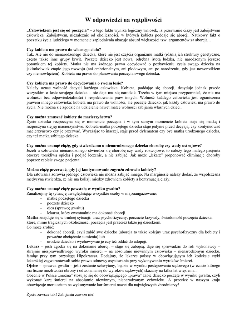 W odpowiedzi na wątpliwości „Człowiekiem jest się od poczęcia” – z tego faktu wynika logiczny wniosek, iŜ przerwanie ciąŜy jest zabójstwem człowieka. Zabójstwem, niezaleŜnie od okoliczności, w których kobieta poddaje się aborcji. Naukowy fakt o początku Ŝycia ludzkiego w momencie zapłodnienia ukazuje absurd większości tzw. argumentów za aborcją... Czy kobieta ma prawo do własnego ciała? Tak. Ale nie do nienarodzonego dziecka, które nie jest częścią organizmu matki (róŜnią ich struktury genetyczne, często takŜe inne grupy krwi). Poczęte dziecko jest nową, odrębną istotą ludzką, nie narodzonym jeszcze potomkiem tej kobiety. Matka nie ma Ŝadnego prawa decydować o pozbawieniu Ŝycia swego dziecka na jakimkolwiek etapie jego rozwoju (ani embrionalnym, ani płodowym, ani po narodzeniu, gdy jest noworodkiem czy niemowlęciem). Kobieta ma prawo do planowania poczęcia swego dziecka. Czy kobieta ma prawo do decydowania o swoim losie? NaleŜy uznać wolność decyzji kaŜdego człowieka. Kobieta, poddając się aborcji, decyduje jednak przede wszystkim o losie swojego dziecka – nie daje mu się narodzić. Trzeba w tym miejscu przypomnieć, Ŝe nie ma wolności bez odpowiedzialności i respektowania praw innych. Wolność kaŜdego człowieka jest ograniczona prawem innego człowieka: kobieta ma prawo do wolności, ale poczęte dziecko, jak kaŜdy człowiek, ma prawo do Ŝycia. Nie moŜna się zgodzić na udzielenie nawet matce wolności zabijania własnych dzieci. Czy moŜna zmuszać kobiety do macierzyństwa? śycie dziecka rozpoczyna się w momencie poczęcia i w tym samym momencie kobieta staje się matką i rozpoczyna się jej macierzyństwo. Kobieta-matka poczętego dziecka staje jedynie przed decyzją, czy kontynuować macierzyństwo czy je przerwać. WyraŜając to inaczej, staje przed dylematem czy być matką urodzonego dziecka, czy teŜ matką zabitego dziecka. Czy moŜna usunąć ciąŜę, gdy stwierdzono u nienarodzonego dziecka chorobę czy wady ustrojowe? JeŜeli u człowieka nienarodzonego stwierdza się chorobę czy wady rozwojowe, to naleŜy tego małego pacjenta otoczyć troskliwą opieką i podjąć leczenie, a nie zabijać. Jak moŜe „lekarz” proponować eliminację choroby poprzez zabicie swego pacjenta! MoŜna ciąŜę przerwać, gdy jej kontynuowanie zagraŜa zdrowiu kobiety? Dla ratowania zdrowia jednego człowieka nie moŜna zabijać innego. Na marginesie naleŜy dodać, Ŝe współczesna medycyna stwierdza, Ŝe nie ma kolizji między zdrowiem kobiety a kontynuacją ciąŜy. Czy moŜna usunąć ciąŜę powstałą w wyniku gwałtu? Zanalizujmy tę sytuację uwzględniając wszystkie osoby w nią zaangaŜowane: - matkę poczętego dziecka - poczęte dziecko - ojca (sprawcę gwałtu) - lekarza, który ewentualnie ma dokonać aborcji. Matka znajduje się w trudnej sytuacji: uraz psychofizyczny, poczucie krzywdy, świadomość poczęcia dziecka, które, mimo tragicznych okoliczności poczęcia jest przecieŜ takŜe jej dzieckiem. Co moŜe zrobić: - dokonać aborcji, czyli zabić swe dziecko (aborcja to takŜe kolejny uraz psychofizyczny dla kobiety i powaŜne obciąŜenie sumienia) lub - urodzić dziecko i wychowywać je czy teŜ oddać do adopcji. Lekarz – jeśli zgodzi się na dokonanie aborcji – staje się zabójcą, daje się sprowadzić do roli wykonawcy – skrajnie niesprawiedliwego wyroku śmierci – na absolutnie niewinnym człowieku – nienarodzonym dziecku, łamiąc przy tym przysięgę Hipokratesa. Dodajmy, Ŝe lekarze polscy w obowiązującym ich kodeksie etyki lekarskiej zagwarantowali sobie prawo odmowy asystowania przy wykonywaniu wyroków śmierci. Ojciec – sprawca gwałtu – jeśli zostanie schwytany, będzie w wyniku postępowania sądowego (w czasie którego ma liczne moŜliwości obrony i odwołania się do wyroków sądowych) skazany na kilka lat więzienia... Obecnie w Polsce „moŜna” stosując się do obowiązującego „prawa” zabić dziecko poczęte w wyniku gwałtu, czyli wykonać karę śmierci na absolutnie niewinnym, nienarodzonym człowieku. A przecieŜ w naszym kraju obowiązuje moratorium na wykonywanie kar śmierci nawet dla największych zbrodniarzy! śyciu zawsze tak! Zabijaniu zawsze nie!