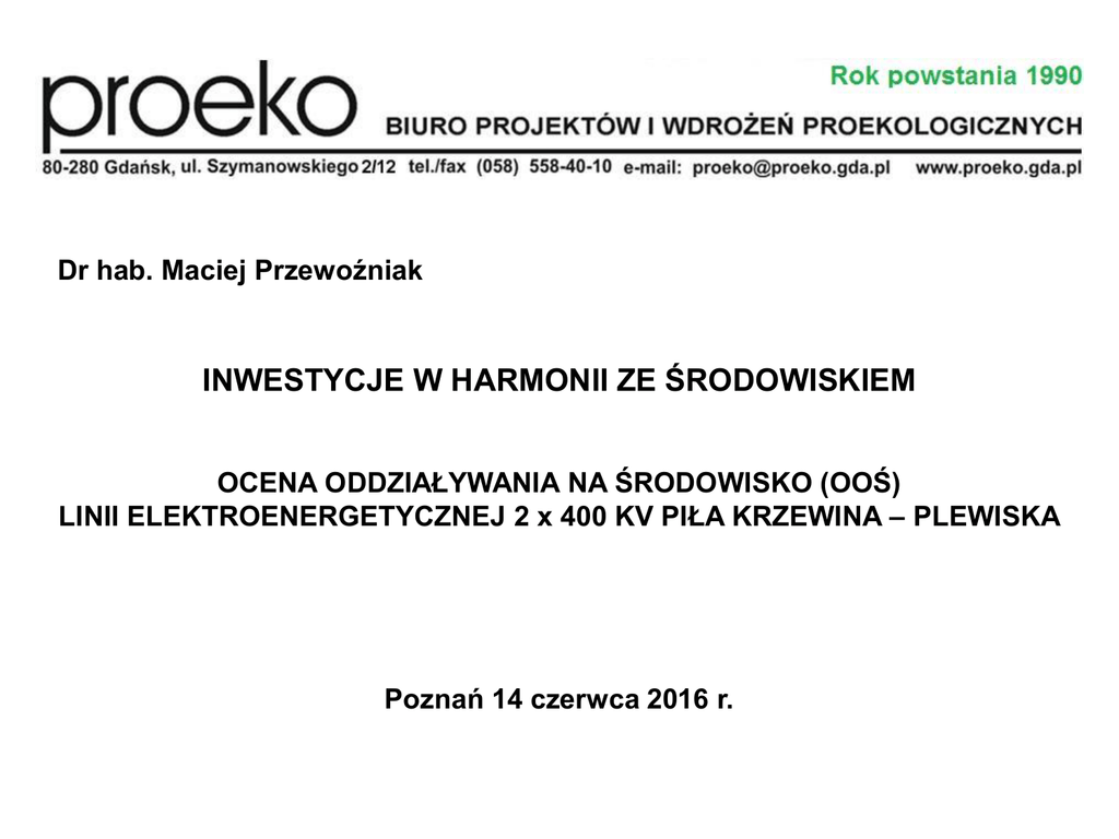 Dr hab. Maciej Przewoźniak INWESTYCJE W HARMONII ZE ŚRODOWISKIEM OCENA ODDZIAŁYWANIA NA ŚRODOWISKO (OOŚ) LINII ELEKTROENERGETYCZNEJ 2 x 400 KV PIŁA KRZEWINA – PLEWISKA Poznań 14 czerwca 2016 r. GŁÓWNE ZAGADNIENIA: 1. Uwarunkowania prawne i istota OOŚ 2. Raport o oddziaływaniu na środowisko 3. Zagadnienie wariantów przedsięwzięcia 4. Ochrona środowiska życia ludzi – ochrona przyrody 5. Udział społeczeństwa w procedurze OOŚ 6. Rola administracji państwowej 1. UWARUNKOWANIA PRAWNE I ISTOTA OOŚ Ustawa z dnia 3 października 2008 r. o udostępnianiu informacji o środowisku i jego ochronie, udziale społeczeństwa w ochronie środowiska oraz o ocenach oddziaływania na środowisko - t. j. obwieszczenie Marszałka Sejmu Rzeczypospolitej Polskiej z dnia 9 lutego 2016 r. Dz. U. 2016 poz. 353. Rozporządzenie Rady Ministrów z dnia 9 listopada 2010 r. w sprawie przedsięwzięć mogących znacząco oddziaływać na środowisko - t. j. obwieszczenie Prezesa Rady Ministrów z dnia 21 grudnia 2015 r. Dz. U. poz. 71. Dwie kategorie przedsięwzięć podlegających OOŚ: • przedsięwzięcia środowisko: mogące zawsze znacząco oddziaływać np. napowietrzne linie elektroenergetyczne, o napięciu znamionowym na nie mniejszym niż 220 kV, o długości nie mniejszej niż 15 km zawsze wymagane sporządzenie raportu o oddziaływaniu na środowisko • przedsięwzięcia mogące potencjalnie znacząco oddziaływać na środowisko: np. napowietrzne linie elektroenergetyczne, o napięciu znamionowym nie mniejszym niż 110 kV, inne niż wymienione powyżej może być wymagane sporządzenie raportu o oddziaływaniu na środowisko Przynależność przedsięwzięcia do kategorii mogących znacząco oddziaływać na środowisko, nie świadczy, że jest ono szkodliwe dla środowiska lub dla zdrowia i warunków życia ludzi, ale że podlega wzmożonej kontroli administracji państwowej i samorządowej w procedurze OOŚ … ISTOTA OOŚ Cele OOŚ: • ocena oddziaływania przedsięwzięcia na środowisko na etapie jego projektowania, w celu wykluczenia lub minimalizacji negatywnego oddziaływania na etapach budowy, przedsięwzięcia i dzięki temu: eksploatacji i likwidacji • zapewnienie korzystnych warunków środowiskowych życia ludzi • ochrona przyrody, dziedzictwa kulturowego i krajobrazu Istotą OOŚ jest zapobieganie potencjalnym zagrożeniom środowiska, w tym zagrożeniom zdrowia i warunków życia ludzi. ISTOTĄ OOŚ JEST PREWENCJA. Podstawowym dokumentem w procedurze oddziaływaniu przedsięwzięcia na środowisko. OOŚ jest raport o 2. RAPORT O ODDZIAŁYWANIU NA ŚRODOWISKO Podstawowe zasady sporządzania raportu OŚ • kompleksowość oceny: - ocena oddziaływania na ludzi i na wszystkie elementy środowiska w ich wzajemnych powiązaniach - ocena dla etapów budowy, eksploatacji i likwidacji przedsięwzięcia • udokumentowanie: - stan środowiska - prognoza oddziaływania • obiektywizm: - sformalizowane metody oceny - prawo ochrony środowiska • wariantowość: - wariant proponowany przez wnioskodawcę - co najmniej jeden racjonalny wariant alternatywny • przezorność: - przy braku pewności w ocenie wnioski z zapasem bezpieczeństwa Zakres raportu o oddziaływaniu na środowisko 1. Podstawy prawne 2. Opis projektowanego przedsięwzięcia (warianty) ANALIZA STANU ŚRODOWISKA 3. Struktura, stan sozologiczny i użytkowanie środowiska w rejonie lokalizacji przedsięwzięcia 4. Formy ochrony przyrody w rejonie lokalizacji przedsięwzięcia 5. Dziedzictwo kulturowe, w tym zabytki w rejonie lokalizacji przedsięwzięcia OCENA ODDZIAŁYWANIA 6. Ocena oddziaływania na środowisko wariantów przedsięwzięcia 6.1. Opis metod prognozowania 6.2. Etap budowy - oddziaływanie na: • przypowierzchniowa warstwa litosfery i gleby • stosunki wodne i jakość wód • warunki klimatyczne • zanieczyszczenie powietrza • hałas • pole elektromagnetyczne • gospodarka odpadami • szata roślinna, grzyby, zwierzęta i siedliska • krajobraz • formy ochrony przyrody • dobra kultury i dobra materialne • ludność, w tym zdrowie i warunki życia 6.3. Etap eksploatacji … 6.4. Etap likwidacji przedsięwzięcia … 7. Uzasadnienie wyboru wariantu do realizacji 8. Diagnoza potencjalnie znaczących oddziaływań projektowanego przedsięwzięcia na środowisko, w tym oddziaływań transgranicznych i skumulowanych oraz ich klasyfikacja ZALECENIA REALIZACYJNE 9. Proponowane działania mające na celu zapobieganie lub zmniejszenie szkodliwych oddziaływań na środowisko i kompensację przyrodniczą 10. Analiza możliwych konfliktów społecznych związanych z projektowanym przedsięwzięciem i uwarunkowania ich minimalizacji 11. Propozycja monitoringu oddziaływania projektowanego przedsięwzięcia na środowisko DANE FORMALNE 12. Wykaz trudności wynikających z niedostatków techniki lub luk we współczesnej wiedzy, jakie napotkano opracowując raport 13. Wykaz źródeł informacji stanowiących podstawę sporządzenia raportu STRESZCZENIE RAPORTU W JĘZYKU NIESPECJALISTYCZNYM Źródła informacji do sporządzenia raportu 1. Inwentaryzacja terenowa: • przyroda • zagospodarowanie i uzbrojenie techniczne 2. Rozpoznanie fizjograficzne, krajobrazowe i sozologiczne. 3. Materiały dokumentacyjne nt. środowiska: • administracji państwowej (GDOŚ, RDOŚ, Lasy Państwowe, WKZ, …) • administracji samorządowej (wojewódzkiej, powiatowej i gminnej) • instytucji kontrolnych (WIOŚ, PWIS, PPIS) • innych instytucji 4. Materiały publikowane nt. środowiska 5. Materiały metodyczne nt. OOŚ (GDOŚ, publikacje) 6. Akty prawa (prawo powszechne i miejscowe) Inwentaryzacja przyrodnicza 1. Problematyka: • siedliska przyrodnicze (tzw. siedliska Natura 2000) • rośliny naczyniowe i mszaki • grzyby zlichenizowane (porosty) i makroowocnikowe • zwierzęta: bezkręgowce ryby (o ile wystąpią ich siedliska) płazy gady ptaki ssaki, w tym nietoperze 2. Zakres terytorialny: pas