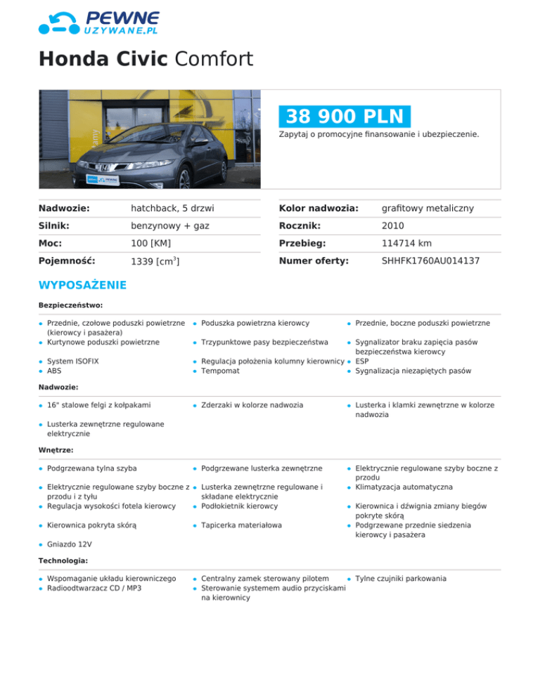 Honda Civic Comfort 38 900 PLN Zapytaj o promocyjne finansowanie i ubezpieczenie. Nadwozie: hatchback, 5 drzwi Kolor nadwozia: grafitowy metaliczny Silnik: benzynowy + gaz Rocznik: 2010 Moc: 100 [KM] Przebieg: 114714 km Pojemność: 1339 [cm ] Numer oferty: SHHFK1760AU014137 3 WYPOSAŻENIE Bezpieczeństwo: Przednie, czołowe poduszki powietrzne (kierowcy i pasażera) Kurtynowe poduszki powietrzne Poduszka powietrzna kierowcy Przednie, boczne poduszki powietrzne Trzypunktowe pasy bezpieczeństwa System ISOFIX ABS Regulacja położenia kolumny kierownicy Tempomat Sygnalizator braku zapięcia pasów bezpieczeństwa kierowcy ESP Sygnalizacja niezapiętych pasów Nadwozie: 16" stalowe felgi z kołpakami Zderzaki w kolorze nadwozia Lusterka i klamki zewnętrzne w kolorze nadwozia Podgrzewana tylna szyba Podgrzewane lusterka zewnętrzne Elektrycznie regulowane szyby boczne z przodu i z tyłu Regulacja wysokości fotela kierowcy Lusterka zewnętrzne regulowane i składane elektrycznie Podłokietnik kierowcy Elektrycznie regulowane szyby boczne z przodu Klimatyzacja automatyczna Kierownica pokryta skórą Tapicerka materiałowa Lusterka zewnętrzne regulowane elektrycznie Wnętrze: Kierownica i dźwignia zmiany biegów pokryte skórą Podgrzewane przednie siedzenia kierowcy i pasażera Gniazdo 12V Technologia: Wspomaganie układu kierowniczego Radioodtwarzacz CD / MP3 Centralny zamek sterowany pilotem Sterowanie systemem audio przyciskami na kierownicy Tylne czujniki parkowania Honda Civic Comfort DODATKOWE INFORMACJE: WESTMOTOR GRUPA PGD Autoryzowany dealer marki Opel wchodzący w skład sieci Pewne Używane. Zapraszamy do kontaktu z naszymi doradcami: +48 667 071 266 +48 667 071 265 +48 61 610 41 02 Na samochód wystawiamy fakturę VAT 23%. Kupujący nie ponosi opłaty skarbowej. Możliwość odliczenia VAT przy zakupie na firmę. Oferujemy korzystne formy finansowania zakupu samochodu oraz ubezpieczenia komunikacyjne. Miejsce ekspozycji: Autoryzowany Dealer Opel WESTMOTOR Grupa PGD ul. Obornicka 125 62-002 Suchy Las GPS: 52°28'37.4"N 16°52'12.9"E Pewne Używane Poznań, Suchy Las ul. Obornicka 125, tel.:61 610 41 02 www.blog.pgd.pl Nota prawna Dane zawarte w niniejszej propozycji handlowej mają wyłącznie charakter informacyjny. Podane informacje nie stanowią oferty ani zapewnienia, w szczególności w rozumieniu art. 66 § 1 oraz art. 5561 Kodeksu cywilnego. Wiążące ustalenie ceny, wyposażenia oraz specyfikacji samochodu następuje w pisemnej umowie sprzedaży/zamówienia samochodu. Ze względu na ograniczenia techniczne (np. odwzorowanie kolorów przez monitor lub sposób wydruku), kolory przedstawione w niniejszej propozycji handlowej mogą się różnić od rzeczywistych kolorów nadwozia i tapicerki. Niniejsza propozycja handlowa oraz wszelkie załączniki z nią związane są poufne i nie mogą być przekazywane osobom trzecim. Prezentowane zdjęcia mogą zawierać wyposażenie opcjonalne (akcesoryjne), dodatkowo płatne. Warunki oferty maja charakter orientacyjny i mogą zostać zmienione w momencie uaktualnienia cen lub warunków promocji.