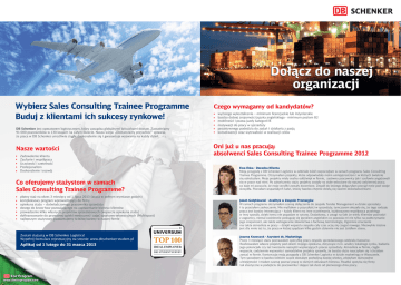 Dołącz do naszej organizacji Wybierz Sales Consulting Trainee Programme Buduj z klientami ich sukcesy rynkowe! DB Schenker jest operatorem logistycznym, który zarządza globalnymi łańcuchami dostaw. Zatrudniamy 91 000 pracowników w 130 krajach na całym świecie. Nasza wizja: „Dostarczamy przyszłość” sprawia, że praca w DB Schenker umożliwia ciągłe doskonalenie się i gwarantuje wyzwania na każdy dzień. Nasze wartości Zadowolenie klienta Zaufanie i współpraca Uczciwość i rzetelność Profesjonalizm Doskonalenie i rozwój Co oferujemy stażystom w ramach Sales Consulting Trainee Programme? płatny staż na okres 3 miesięcy od 1 lipca 2013 (praca w pełnym wymiarze godzin) kompleksowy program wprowadzający do firmy opiekuna stażu – doświadczonego pracownika sprzedaży dostęp do know-how pozwalającego na usprawnianie biznesu klientów prowadzenie kilku własnych projektów sprzedażowych (wsparcie opiekuna stażu) dofinansowanie do prywatnej opieki medycznej i zajęć sportowo-rekreacyjnych (Multisport) najlepszym stażystom gwarantujemy ścieżkę kariery w naszej firmie Zostań stażystą w DB Schenker Logistics! Wypełnij formularz rejestracyjny na stronie: www.dbschenker-student.pl Aplikuj od 1 lutego do 31 marca 2013 Czego wymagamy od kandydatów? wyższego wykształcenia – minimum licencjackie lub inżynierskie bardzo dobrej znajomości języka angielskiego - minimum poziom B2 mobilności i prawa jazdy kategorii B motywacji do pracy w sprzedaży proaktywnego podejścia do zadań i działania z pasją konsekwencji oraz wytrwałości w realizacji celów Oni już u nas pracują: absolwenci Sales Consulting Trainee Programme 2012 Ewa Ilska - Doradca Klienta Moją przygodę z DB Schenker Logistics w oddziale Łódź rozpoczęłam w ramach programu Sales Consulting Trainee Programme. Otrzymałam projekty, które odpowiadały moim umiejętnościom i w których świetnie się odnalazłam. Moje projekty miały realny oddźwięk w firmie, zarówno pracownicy jak i szefowie angażowali się w prace nad nimi. Po zakończeniu stażu projekty zostały na stałe wdrożone do naszej codziennej pracy, co daje mi poczucie, że moje wysiłki zostały docenione. Zespół do którego dołączyłam przyjął mnie pod swoje skrzydła. Poznałam wspaniałych ludzi, którzy bardzo chętnie dzielą się swoimi doświadczeniami. Jakub Gołębiowski - Analityk w Zespole Przetargów W ramach programu otrzymałem szansę dołączenia do zespołu Tender Management w dziale sprzedaży i tu przeżyłem zaskoczenie. Nie myślałem o przyszłości w sprzedaży, tymczasem okazało się, że tego rodzaju praca jest bardzo interesująca – każdy klient ma inne oczekiwania, każdorazowo współpraca przebiega w inny sposób, dzięki temu nie popadam w rutynę. Dodatkowo, z uwagi na fakt że wielu klientów pochodzi z zagranicy, niemal codziennie posługuję się językiem angielskim co pozwala mi nie tylko na podtrzymanie jego znajomości, ale także wzbogacanie słownictwa o fachową terminologię. Ogromne znaczenie ma także atmosfera w pracy – dzięki wsparciu zespołu cały czas uczę się czegoś nowego. Niezwykle istotne jest dla mnie też to, że praca w której spędzam kilka godzin dziennie nie jest źródłem stresu. Joanna Krawczyk - Asystent ds. Marketingu Przez 3 miesiące stażu poznawałam specyfikę pracy zespołu sprzedażowego oddziału Katowice. Realizowałam własne projekty pod okiem mojego opiekuna, dotyczące m.in. analizy lokalnego rynku, badania jego potencjału czy też tworzenia narzędzi wspierających proces sprzedaży. Atmosfera w firmie, ciągłe wsparcie, codziennie wyzwania i samodzielne projekty sprawiły, że bardzo dużo nauczyłam się i chciałam zostać w firmie. Kontynuuję moją przygodę z DB Schenker Logistics w dziale marketingu w Warszawie. Tym sposobem w bardzo krótkim czasie dostałam podwójną dawkę wiedzy, zdobyłam różnorodne umiejętności i miałam szansę poznać pracę w różnych obszarach biznesu. Rzadko spotyka się firmy tak elastyczne w podejściu do pracownika i dające tak dużo od pierwszego dnia pracy.