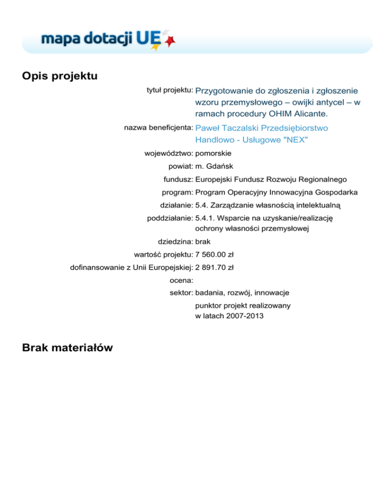 Opis projektu tytuł projektu: Przygotowanie do zgłoszenia i zgłoszenie wzoru przemysłowego – owijki antycel – w ramach procedury OHIM Alicante. nazwa beneficjenta: Paweł Taczalski Przedsiębiorstwo Handlowo - Usługowe "NEX" województwo: pomorskie powiat: m. Gdańsk fundusz: Europejski Fundusz Rozwoju Regionalnego program: Program Operacyjny Innowacyjna Gospodarka działanie: 5.4. Zarządzanie własnością intelektualną poddziałanie: 5.4.1. Wsparcie na uzyskanie/realizację ochrony własności przemysłowej dziedzina: brak wartość projektu: 7 560.00 zł dofinansowanie z Unii Europejskiej: 2 891.70 zł ocena: sektor: badania, rozwój, innowacje punktor projekt realizowany w latach 2007-2013 Brak materiałów