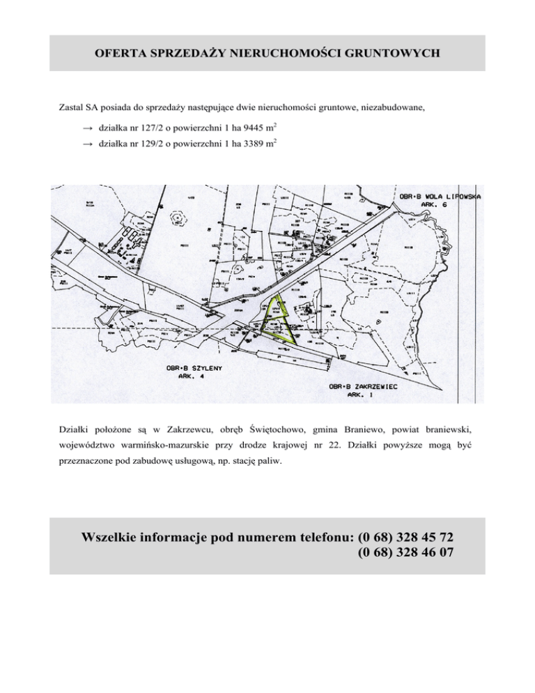OFERTA SPRZEDAśY NIERUCHOMOŚCI GRUNTOWYCH Zastal SA posiada do sprzedaŜy następujące dwie nieruchomości gruntowe, niezabudowane, → działka nr 127/2 o powierzchni 1 ha 9445 m2 → działka nr 129/2 o powierzchni 1 ha 3389 m2 Działki połoŜone są w Zakrzewcu, obręb Świętochowo, gmina Braniewo, powiat braniewski, województwo warmińsko-mazurskie przy drodze krajowej nr 22. Działki powyŜsze mogą być przeznaczone pod zabudowę usługową, np. stację paliw. Wszelkie informacje pod numerem telefonu: (0 68) 328 45 72 (0 68) 328 46 07