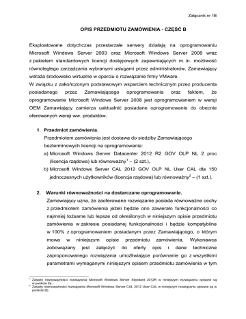 Załącznik nr 1B OPIS PRZEDMIOTU ZAMÓWIENIA - CZĘŚĆ B Eksploatowane dotychczas przestarzałe serwery działają na oprogramowaniu Microsoft Windows Server 2003 oraz Microsoft Windows Server 2008 wraz z pakietem standardowych licencji dostępowych zapewniających m. in. możliwość równoległego zarządzania wybranymi usługami przez administratorów. Zamawiający wdraża środowisko wirtualne w oparciu o rozwiązanie firmy VMware. W związku z zakończonym podstawowym wsparciem technicznym przez producenta posiadanego przez Zamawiającego oprogramowania oraz faktem, że oprogramowanie Microsoft Windows Server 2008 jest oprogramowaniem w wersji OEM Zamawiający zamierza uaktualnić posiadane oprogramowanie do obecnie oferowanych wersji ww. produktów. 1. Przedmiot zamówienia. Przedmiotem zamówienia jest dostawa do siedziby Zamawiającego bezterminowych licencji na oprogramowanie: a) Microsoft Windows Server Datacenter 2012 R2 GOV OLP NL 2 proc (licencja rządowa) lub równoważny1 – (2 szt.), b) Microsoft Windows Server CAL 2012 GOV OLP NL User CAL dla 150 jednoczesnych użytkowników (licencja rządowa) lub równoważny2 – (1 szt.). 2. Warunki równoważności na dostarczane oprogramowanie. Zamawiający uzna, że zaoferowane rozwiązanie posiada równoważne cechy z przedmiotem zamówienia jeżeli będzie ono zawierało funkcjonalności co najmniej tożsame lub lepsze od określonych w niniejszym opisie przedmiotu zamówienia w zakresie posiadanej funkcjonalności i będzie kompatybilne w 100% z oprogramowaniem posiadanym przez Zamawiającego, o którym mowa w zobowiązany niniejszym jest opisie załączyć przedmiotu do oferty zamówienia. opis i dane Wykonawca techniczne zaproponowanego rozwiązania umożliwiające porównanie go z wszystkimi parametrami wymaganymi niniejszym opisem przedmiotu zamówienia w tym 1 2 Zasady równoważności rozwiązania Microsoft Windows Server Standard 2012R w niniejszym rozwiązaniu opisane są w punkcie 2a. Zasady równoważności rozwiązania Microsoft Windows Server CAL 2012 User CAL w niniejszym rozwiązaniu opisane są w punkcie 2b. Załącznik nr 1B zgodność posiadanego oprogramowania z zaproponowanym rozwiązaniem. Dodatkowo Zamawiający zastrzega sobie prawo do zweryfikowania funkcjonalności, wydajności i kompatybilności zaoferowanego rozwiązania poprzez analizę jego możliwości. W przypadku skorzystania przez Zamawiającego z ww. uprawnienia wykonawca jest zobowiązany w terminie 5 dni od dnia otrzymania od Zamawiającego wezwania do dostarczenia oraz wdrożenia testowej wersji zaproponowanego rozwiązania. a) Licencja na system operacyjny dla serwerów w wersji dla jednostek rządowych (samorządowych). Licencja na oprogramowanie musi być przypisana do każdego procesora fizycznego na serwerze. Liczba rdzeni procesorów i ilość pamięci nie mogą mieć wpływu na liczbę wymaganych licencji. Licencja musi uprawniać do uruchamiania serwerowego systemu operacyjnego (SSO) w środowisku fizycznym i nieograniczonej ilości wirtualnych środowisk serwerowego systemu operacyjnego za pomocą wbudowanych mechanizmów wirtualizacji. Serwerowy system operacyjny (SSO) musi posiadać następujące, wbudowane cechy: 1. Możliwość wykorzystania, co najmniej 320 logicznych procesorów oraz co najmniej 4 TB pamięci RAM w środowisku fizycznym. 2. Możliwość wykorzystywania 64 procesorów wirtualnych oraz 1TB pamięci RAM i dysku o pojemności min. 64TB przez każdy wirtualny serwerowy system operacyjny. 3. Możliwość budowania klastrów składających się z 64 węzłów, z możliwością uruchamiania do 8000 maszyn wirtualnych. 4. Możliwość migracji maszyn wirtualnych bez zatrzymywania ich pracy między fizycznymi serwerami z uruchomionym mechanizmem wirtualizacji (hypervisor) przez sieć Ethernet, bez konieczności stosowania dodatkowych mechanizmów współdzielenia pamięci. 5. Wsparcie (na umożliwiającym to sprzęcie) dodawania i wymiany pamięci RAM bez przerywania pracy. 6. Wsparcie (na umożliwiającym to sprzęcie) dodawania i wymiany procesorów bez przerywania pracy. 7. Automatyczna weryfikacja cyfrowych sygnatur sterowników w celu Załącznik nr 1B sprawdzenia, czy sterownik przeszedł testy jakości przeprowadzone przez producenta systemu operacyjnego. 8. Możliwość dynamicznego obniżania poboru energii przez rdzenie procesorów niewykorzystywane w bieżącej pracy. Mechanizm ten musi uwzględniać specyfikę procesorów wyposażonych w mechanizmy HyperThreading. 9. Wbudowane wsparcie instalacji i pracy na wolumenach, które: a. pozwalają na zmianę rozmiaru w czasie pracy systemu, b. umożliwiają tworzenie w czasie pracy systemu migawek, dających użytkownikom końcowym (lokalnym i sieciowym) prosty wgląd w poprzednie wersje plików i folderów, c. umożliwiają kompresję "w locie" dla wybranych plików i/lub folderów, d. umożliwiają zdefiniowanie list kontroli dostępu (ACL). 10. Wbudowany mechanizm klasyfikowania i indeksowania plików (dokumentów) w oparciu o ich zawartość. 11. Wbudowane szyfrowanie dysków przy pomocy mechanizmów posiadających certyfikat FIPS 140-2 lub równoważny wydany przez NIST lub inną agendę rządową zajmującą się bezpieczeństwem informacji. 12. Możliwość uruchamiania aplikacji internetowych wykorzystujących technologię ASP.NET 13. Możliwość dystrybucji ruchu sieciowego HTTP pomiędzy kilka serwerów. 14. Wbudowana zapora internetowa (firewall) z obsługą definiowanych reguł dla ochrony połączeń internetowych i intranetowych. 15. Graficzny interfejs użytkownika. 16. Zlokalizowane w języku polskim, co najmniej następujące elementy: menu, przeglądarka internetowa, pomoc, komunikaty systemowe, 17. Możliwość zmiany języka interfejsu po zainstalowaniu systemu, dla co najmniej 10 języków poprzez wybór z listy dostępnych lokalizacji. 18. Wsparcie dla większości powszechnie używanych urządzeń peryferyjnych (drukarek, urządzeń sieciow