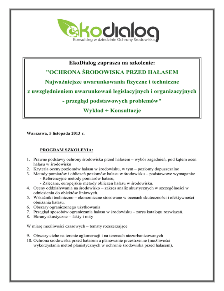 EkoDialog zaprasza na szkolenie: "OCHRONA ŚRODOWISKA PRZED HAŁASEM Najważniejsze uwarunkowania fizyczne i techniczne z uwzględnieniem uwarunkowań legislacyjnych i organizacyjnych - przegląd podstawowych problemów" Wykład + Konsultacje Warszawa, 5 listopada 2013 r. PROGRAM SZKOLENIA: 1. Prawne podstawy ochrony środowiska przed hałasem – wybór zagadnień, pod kątem ocen hałasu w środowisku 2. Kryteria oceny poziomów hałasu w środowisku, w tym – poziomy dopuszczalne 3. Metody pomiarów i obliczeń poziomów hałasu w środowisku – podstawowe wymagania: - Referencyjne metody pomiarów hałasu, - Zalecane, europejskie metody obliczeń hałasu w środowisku. 4. Oceny oddziaływania na środowisko – zakres analiz akustycznych w szczególności w odniesieniu do obiektów liniowych. 5. Wskaźniki techniczno – ekonomiczne stosowane w ocenach skuteczności i efektywności obniżania hałasu. 6. Obszary ograniczonego użytkowania 7. Przegląd sposobów ograniczania hałasu w środowisku – zarys katalogu rozwiązań. 8. Ekrany akustyczne – fakty i mity W miarę możliwości czasowych – tematy rozszerzające 9. Obszary ciche na terenie aglomeracji i na terenach niezurbanizowanych 10. Ochrona środowiska przed hałasem a planowanie przestrzenne (możliwości wykorzystania metod planistycznych w ochronie środowiska przed hałasem). Istnieje możliwość, w miarę potrzeb i ewentualnych rezerw czasowych przeprowadzenie wykładów na temat (opcjonalnie, do wyboru): Unijna polityka w zakresie ochrony środowiska przed hałasem – Dyrektywa 2002/40/WE, implementacja do warunków polskich. Długookresowe wskaźniki oceny hałasu Mapy akustyczne – wymagania formalne Etapy techniczno - organizacyjne realizacji map akustycznych. Programy ochrony środowiska przed hałasem jako konsekwencja map akustycznych – ogólny przewodnik metodyczny ich opracowywania. WYKŁADOWCA: dr inż. RADOSŁAW KUCHARSKI Absolwent Politechniki Warszawskiej. Doktorat z budownictwa ogólnego – akustyki architektoniczno budowlanej w Instytucie Techniki Budowlanej. Studia podyplomowe na Politechnice Warszawskiej z zakresu systemów jakości. Wieloletni pracownik (do chwili obecnej) Instytutu Ochrony Środowiska – Państwowego Instytutu Badawczego; Kierownik Zakładu Akustyki Środowiska, w ramach którego działa od ponad 10 lat Akredytowane Laboratorium badań hałasu transportowego i przemysłowego oraz pomiarowych ocen skuteczności ekranów akustycznych „in-situ”. Współpracownik Resortu Środowiska, a w szczególności – Głównego Inspektoratu Ochrony Środowiska. W ramach tej współpracy tworzył i tworzy merytoryczne podstawy przepisów prawnych w dziedzinie ochrony środowiska przed hałasem , sprawuje merytoryczny nadzór nad systemem monitorowania hałasu oraz prowadzi współpracę międzynarodową w szczególności w ramach sieci EIONET (współpraca z Europejską Agencją Środowiska) jako NRC (National Reference Center), lecz także – współpracując z grupami roboczymi powoływanymi przez KE. Biegły Ministra Ochrony Środowiska, Zasobów Naturalnych i Leśnictwa oraz Biegły Wojewody w zakresie sporządzania ocen oddziaływania na środowisko. Obecnie członek Krajowej Komisji Ochrony Środowiska przy Ministrze Środowiska oraz członek Mazowieckiej Komisji OOŚ. LOKALIZACJA: Warszawa, sala w dogodnej lokalizacji (szczegółowe informacje o miejscu szkolenia otrzymają Państwo na kilka dni przed szkoleniem). TERMIN: 5 listopada 10.00 - 16.00 KOSZT: 480 PLN netto (+ 23% VAT) za osobę 2013 r., zajęcia odbywają się w godzinach Szkolenie ma charakter usługi kształcenia zawodowego Dla instytucji zaświadczających, że szkolenie finansowane jest ze środków publicznych (w całości bądź w minimum 70%) zastosujemy stawkę VAT zw. W CENĘ SZKOLENIA WLICZONE SĄ: Materiały szkoleniowe, Certyfikat Obiad Serwis kawowy KONTAKT: [email protected] tel. 604 533 262 www.ekodialog.pl