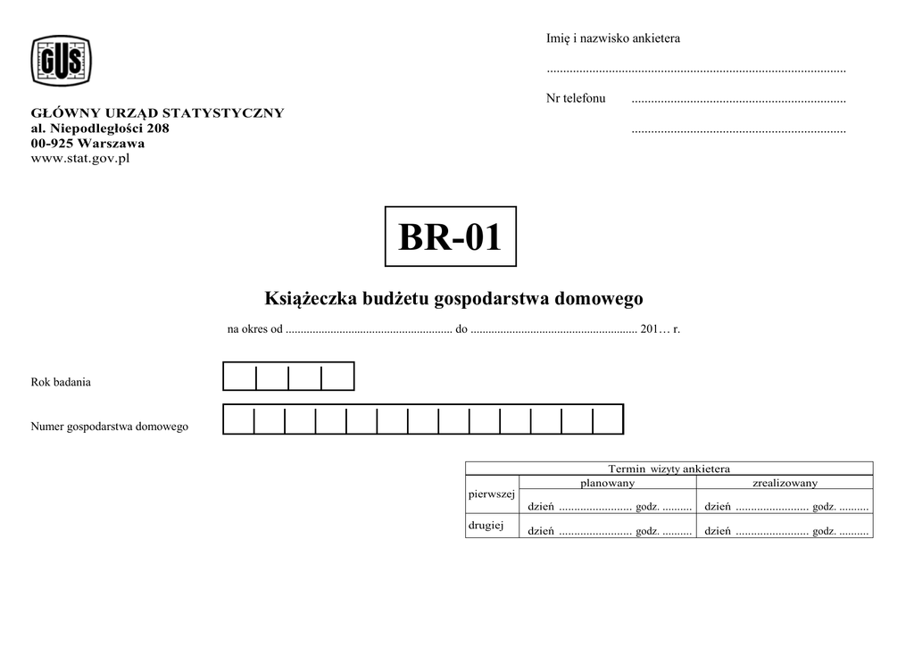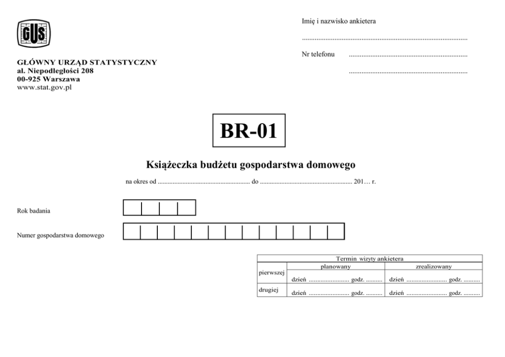 Imię i nazwisko ankietera ............................................................................................ Nr telefonu GŁÓWNY URZĄD STATYSTYCZNY al. Niepodległości 208 00-925 Warszawa www.stat.gov.pl .................................................................. .................................................................. BR-01 Książeczka budżetu gospodarstwa domowego na okres od ........................................................ do ........................................................ 201… r. Rok badania Numer gospodarstwa domowego Termin wizyty ankietera planowany pierwszej drugiej zrealizowany dzień ........................ godz. .......... dzień ........................ godz. .......... dzień ........................ godz. .......... dzień ........................ godz. .......... SPIS TREŚCI Strona Dział 1. Liczba spożytych posiłków .................................................................................................................................................................. 1 Dział 2. Rozchody gospodarstwa domowego .................................................................................................................................................... 2 Dział 3. Zakupy na kredyt na potrzeby gospodarstwa domowego .................................................................................................................. 26 Dział 4. Rozchody na gospodarstwo rolne ...................................................................................................................................................... 28 Dział 5. Zakupy na kredyt na potrzeby gospodarstwa rolnego........................................................................................................................ 32 Dział 6. Artykuły i usługi pobrane na potrzeby gospodarstwa domowego z gospodarstwa rolnego, działalności prowadzonej na własny rachunek oraz przekazane dary z gospodarstwa rolnego................................................................................................................... 34 Dział 7. Przychody pieniężne gospodarstwa domowego................................................................................................................................. 38 Dział 8. Uwagi respondenta ............................................................................................................................................................................ 40 Dział 9. Uwagi ankietera ................................................................................................................................................................................ 41 DZIAŁ 1. LICZBA SPOŻYTYCH POSIŁKÓW Prosimy o wpisywanie w rubr. 1, 2 i 3 (część A) liczby posiłków spożytych poza domem przez członków Pana/Pani gospodarstwa domowego, zaś w rubr. 5, 6 i 7 (część B) liczby posiłków spożytych w Pana/Pani domu przez osoby spoza gospodarstwa domowego. Zapisów prosimy dokonywać każdego dnia. Jeżeli zjawisko nie zaistniało, prosimy wpisać kreskę. A Liczba spożytych posiłków poza domem przez członków Pana/Pani gospodarstwa domowego (np. w przedszkolu, szkole, stołówce pracowniczej, w restauracji, barze, itp.) śniadania obiady kolacje 1 2 3 B Liczba spożytych posiłków w Pana/Pani domu przez osoby spoza gospodarstwa domowego W dniu 4 śniadania obiady kolacje 5 6 7 1/16 2/17 3/18 4/19 5/20 6/21 7/22 8/23 9/24 10/25 11/26 12/27 13/28 14/29 15/30 31 Suma 1 DZIAŁ 2. ROZCHODY GOSPODARSTWA DOMOWEGO W dziale tym prosimy notować rozchody związane z prowadzeniem gospodarstwa domowego, a więc: zakup towarów, opłaty za wykonane usługi, wpłaty gotówkowe związane ze spłatą kredytów i pożyczek zaciągniętych w poprzednich miesiącach, w tym kredytu hipotecznego, składki członkowskie, wpłaty oszczędnościowe, zakup akcji, obligacji, alimenty, opłaty ubezpieczeniowe, płacone podatki, kieszonkowe dla dzieci, udzielone pożyczki, wartość artykułów (usług) otrzymanych bezpłatnie (dary, prezenty), kwoty pieniężne przekazane w darze innym gospodarstwom domowym oraz wartość darów przekazanych z gospodarstwa domowego innemu gospodarstwu domowemu. Gdy będą Państwo notowali rozchody, prosimy dokładnie określać, na co wydano wykazaną kwotę pieniężną. W przypadku artykułów żywnościowych, napojów alkoholowych i wyrobów tytoniowych, sprzętu RTV i AGD, środków transportu i paliw, wyjazdów turystycznych, zakwaterowania, pobytu dziecka w żłobku prosimy wpisywać nazwę artykułu lub usługi, jego ilość i wartość, a w przypadku odzieży, bielizny i obuwia — określić, czy są one damskie, męskie czy dziecięce. Prosimy ponadto podać, czy artykuły i usługi zostały zakupione, otrzymane bezpłatnie (np. prezent) lub otrzymane częściowo bezpłatnie (np.: zniżki na bilet komunikacji miejskiej, kolejowy). W przypadku zakupu należy podać również formę płatności, tzn. zakup za gotówkę, przy użyciu karty płatniczej, kredytowej lub innej (np. z supermarketu). Jeżeli Państwo wytwarzają przetwory owocowe czy warzywne (np.: kompoty, mrożonki, kapustę kwaszoną), prosimy notować wyłącznie produkty wyjściowe (np.: wiśnie, ogórki, marchewka, groszek, kapusta świeża) oraz czy zostały one zakupione, czy otrzymane bezpłatnie (z wyjątkiem produktów pobranych z gospodarstwa rolnego/działki, które należy rejestrować w dziale 6). W przypadku płacenia zaliczki na podatek dochodowy od osób fizycznych oraz składek na ubezpieczenie społeczne i zdrowotne prosimy o określenie, jakiego rodzaju dochodów dotyczą te obciążenia (np.: podatek od emerytury, wynagrodzenia itp.). 2 Uwaga! 1. Jeżeli dokonano zakupu danego towaru/usługi przez Internet (np.: na Allegro, w sklepie internetowym), niezależnie od formy płatności i sposobu odbioru towaru, należy taką sytuację odnotować, wpisując symbol „1” w ostatnie