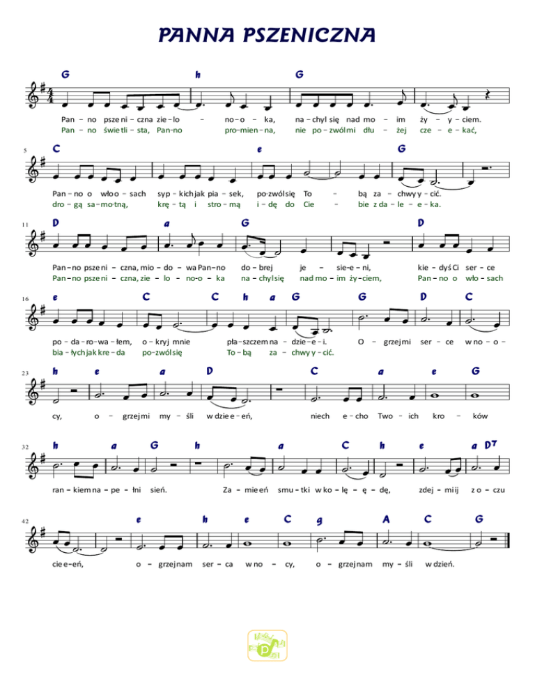 PANNA PSZENICZNA G 4 4 Pan Pan h G no psze ni no świe tli no o ka, pro mien na, czna zie lo sta, Pan no na chyl się nad mo nie po zwól mi dłu im żej y e C 5 e ży cze ciem. kać, G Pan no o wło o sach dro gą sa mo tną, syp kichjak pia sek, krę tą i stro mą po zwólsię To i dę do Cie D 11 a Pan no psze ni Pan no psze ni czna, mio czna, zie e 16 do lo bą za bie z da wa Pan no no o ka D do brej na chyl się je nad mo sie e ni, im ży ciem, C C h chwy y cić. le e ka. G a G pła szczem na To bą za dzie e i. chwy y cić. kie dyś Ci ser ce Pan no o wło sach G D C po da ro wa łem, bia łych jak kre da h e 23 o kryj mnie po zwól się a D O C grzej mi o ser a ce w no e G cy, o h 32 grzej mi śli a my G ran kiem na pe łni w dzie e eń, h a sień. e 42 Za h mie eń niech e cho Two ich ków C h smu tki w ko kro a D e lę dę, zdej miij C ę e C g A ser cy, o my zo czu G cie e eń, o grzejnam ca w no p grzejnam śli w dzień.