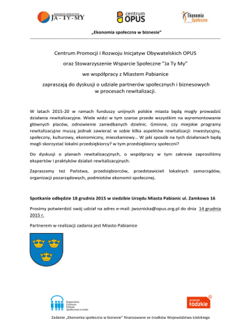 „Ekonomia społeczna w biznesie” _____________________________________________________________________________________________________ Centrum Promocji i Rozwoju Inicjatyw Obywatelskich OPUS oraz Stowarzyszenie Wsparcie Społeczne "Ja Ty My" we współpracy z Miastem Pabianice zapraszają do dyskusji o udziale partnerów społecznych i biznesowych w procesach rewitalizacji. W latach 2015-20 w ramach funduszy unijnych polskie miasta będą mogły prowadzić działania rewitalizacyjne. Wiele widzi w tym szanse przede wszystkim na wyremontowanie głównych placów, odnowienie zaniedbanych dzielnic. Gminne, czy miejskie programy rewitalizacyjne muszą jednak zawierać w sobie kilka aspektów rewitalizacji: inwestycyjny, społeczny, kulturowy, ekonomiczny, mieszkaniowy… W jaki sposób na tych działaniach będą mogli skorzystać lokalni przedsiębiorcy? w tym przedsiębiorcy społeczni? Do dyskusji o planach rewitalizacyjnych, o współpracy w tym zakresie zaprosiliśmy ekspertów i praktyków działań rewitalizacyjnych. Zapraszamy też Państwa, przedsiębiorców, przedstawicieli lokalnych samorządów, organizacji pozarządowych, podmiotów ekonomii społecznej. Spotkanie odbędzie 18 grudnia 2015 w siedzibie Urzędu Miasta Pabianic ul. Zamkowa 16 Prosimy potwierdzić swój udział na adres e-mail: [email protected] do dnia 14 grudnia 2015 r. Partnerem w realizacji zadania jest Miasto Pabianice Zadanie „Ekonomia społeczna w biznesie” finansowane ze środków Województwa Łódzkiego „Ekonomia społeczna w biznesie” _____________________________________________________________________________________________________ Program seminarium 10.30 - rejestracja osób uczestniczących 11.00 - powitanie osób uczestniczących 11.15 - 12.15 prezentacja: Czym jest rewitalizacja, podstawy prawne, rewitalizacja w dokumentach państwowych oraz mechanizmy finansowania działań rewitalizacyjnych przedstawiciel Ministerstwa Infrastruktury i Rozwoju Regionalnego 12.15 – 12.45 prezentacja: Wsparcie przedsiębiorczości w nowym okresie programowania 2014-2020 - przedstawiciel instytucji wparcia biznesu. 12.45- 13.00 przerwa 13.00 - 13.45 panel dyskusyjny: Lokalne Programy Rewitalizacyjne - jak włączać w ich realizację lokalnych przedsiębiorców i podmioty ekonomii społecznej? Paneliści: przedstawiciel Urzędu Miasta Pabianice przedstawiciel Ministerstwa Infrastruktury i Rozwoju przedstawiciel środowiska biznesu przedstawiciel Ośrodka Wsparcia Ekonomii Społecznej przy Centrum OPUS 14.00 podsumowanie i zakończenie seminarium Wydarzenie realizowane w ramach projektu "Ekonomia Społeczna w biznesie" finansowane ze środków Województwa Łódzkiego Zadanie „Ekonomia społeczna w biznesie” finansowane ze środków Województwa Łódzkiego