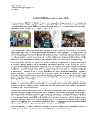 Szkoła Podstawowa z Oddziałami Integracyjnymi nr 14 W Krośnie Projekt UNICEF „MALI uczniowie idą do szkoły” W roku szkolnym 2015/2016 Szkoła Podstawowa z Oddziałami Integracyjnymi nr 14 znalazła się w licznym gronie szkół biorących udział w projekcie edukacyjno-pomocowym organizowanym i nadzorowanym przez Polski Komitet Narodowy UNICEF. Projekt pt. „MALI uczniowie idą do szkoły” realizowany był od listopada 2015 r. do końca marca 2016 r. Celem projektu była pomoc dzieciom w Mali, państwie w Afryce zachodniej, dotkniętym w swej historii politycznymi kryzysami i klęskami pogodowymi, skutkującymi biedą, ubóstwem i brakiem dostępu do edukacji dla wielu malijskich dzieci. Projekt edukacyjno-pomocowy pt. „MALI uczniowie idą do szkoły” jest odpowiedzią na trudną sytuację dzieci w tym kraju. Dlatego też nasza szkoła włączyła się do mądrego i szerokiego projektu UNICEF upowszechniania wiedzy o Afryce i jej problemach, połączonego z akcją pomocową i zbieraniem funduszy na zakup podstawowych wyprawek szkolnych dla uczniów w Mali. Przez okres kilku miesięcy, od grudnia do marca, uczniowie zaangażowani w projekt brali udział w zajęciach, podczas których zostały omówione zagadnienia związane z samą organizacją UNICEF i jej funkcjonowaniem, sytuacją dzieci w krajach Afryki, a szczególnie w Mali, przyczynami braku dostępu do edukacji i sposobami niesienia im pomocy. Wszystkie te informacje stały się punktem wyjścia do rozpoczęcia pisania książek, co było głównym zadaniem uczniów w projekcie. Wzięło w nim udział 33 uczniów z klas II i IV-VI, podejmując się trudu stworzenia (napisania i wydania) własnych książek. Dla większości dzieci był to literacki debiut. Na tę kolekcję złożyły się przede wszystkim powieści, opowiadania, przewodniki, komiksy, ale znalazły się również słowniki do nauki języków obcych, książki z kategorii fantasy, a nawet tomiki ciekawych i zabawnych wierszy. Wszystkie były niepowtarzalne i interesujące. Dlatego też w ramach projektu został zorganizowany konkurs „na najbardziej oryginalną książkę UNICEF”. Jej wyboru dokonali uczniowie klas II i IV-VI w drodze głosowania. Do każdej książki dołączono recenzję, ułatwiającą podjęcie decyzji. Najlepszym autorom zostały przyznane nagrody, wyróżnienia i dyplomy, a także wręczono upominki. Finałem projektu było uroczyste spotkanie pt. „Dzień Książki dla Afryki”, połączone ze sprzedażą książek, dzięki czemu zostały zebrane fundusze na wsparcie finansowe dzieci w Mali. Zaproszono na nie dyrekcję szkoły, nauczycieli oraz bliskich uczniów uczestniczących w projekcie: rodziców, rodzeństwo, dziadków. Goście mieli okazję poznać szczegóły projektu, jego szlachetne cele i dowiedzieli się o problemach dzieci w Mali, obejrzeli część artystyczną oraz indywidualne autorskie prezentacje książek, wystawionych później do sprzedaży. Wybierając książkę dla siebie, można było przekazać darowiznę w ramach akcji pomocowej UNICEF na rzecz potrzebujących malijskich dzieci. W sumie ze sprzedaży wszystkich książek zebrano kwotę 729,33 zł. i wpłacono na specjalnie utworzone konto UNICEF. Uczniowie pracujący w grupie projektowej wykazali się w trakcie realizacji wszystkich zadań ogromnym zaangażowaniem, chęcią współpracy, pracowitością, pomysłowością i poświęceniem. Wszystkie działania w projekcie przyniosły uczestnikom wiele radości, zadowolenia, a przede wszystkim dały im poczucie i świadomość, że realizując projekt niesienia pomocy na poziomie szkolnym – działają i wspierają UNICEF na szczeblu światowym. Renata Nowak Szkolny koordynator projektu Szkoła Podstawowa z Oddziałami Integracyjnymi nr 14 w Krośnie