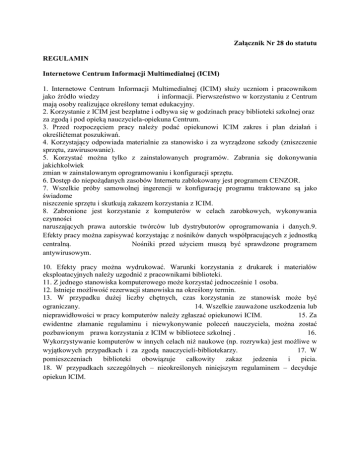 Załącznik Nr 28 do statutu REGULAMIN Internetowe Centrum Informacji Multimedialnej (ICIM) 1. Internetowe Centrum Informacji Multimedialnej (ICIM) służy uczniom i pracownikom jako źródło wiedzy i informacji. Pierwszeństwo w korzystaniu z Centrum mają osoby realizujące określony temat edukacyjny. 2. Korzystanie z ICIM jest bezpłatne i odbywa się w godzinach pracy biblioteki szkolnej oraz za zgodą i pod opieką nauczyciela-opiekuna Centrum. 3. Przed rozpoczęciem pracy należy podać opiekunowi ICIM zakres i plan działań i określićtemat poszukiwań. 4. Korzystający odpowiada materialnie za stanowisko i za wyrządzone szkody (zniszczenie sprzętu, zawirusowanie). 5. Korzystać można tylko z zainstalowanych programów. Zabrania się dokonywania jakichkolwiek zmian w zainstalowanym oprogramowaniu i konfiguracji sprzętu. 6. Dostęp do niepożądanych zasobów Internetu zablokowany jest programem CENZOR. 7. Wszelkie próby samowolnej ingerencji w konfigurację programu traktowane są jako świadome niszczenie sprzętu i skutkują zakazem korzystania z ICIM. 8. Zabronione jest korzystanie z komputerów w celach zarobkowych, wykonywania czynności naruszających prawa autorskie twórców lub dystrybutorów oprogramowania i danych.9. Efekty pracy można zapisywać korzystając z nośników danych współpracujących z jednostką centralną. Nośniki przed użyciem muszą być sprawdzone programem antywirusowym. 10. Efekty pracy można wydrukować. Warunki korzystania z drukarek i materiałów eksploatacyjnych należy uzgodnić z pracownikami biblioteki. 11. Z jednego stanowiska komputerowego może korzystać jednocześnie 1 osoba. 12. Istnieje możliwość rezerwacji stanowiska na określony termin. 13. W przypadku dużej liczby chętnych, czas korzystania ze stanowisk może być ograniczany. 14. Wszelkie zauważone uszkodzenia lub nieprawidłowości w pracy komputerów należy zgłaszać opiekunowi ICIM. 15. Za ewidentne złamanie regulaminu i niewykonywanie poleceń nauczyciela, można zostać pozbawionym prawa korzystania z ICIM w bibliotece szkolnej . 16. Wykorzystywanie komputerów w innych celach niż naukowe (np. rozrywka) jest możliwe w wyjątkowych przypadkach i za zgodą nauczycieli-bibliotekarzy. 17. W pomieszczeniach biblioteki obowiązuje całkowity zakaz jedzenia i picia. 18. W przypadkach szczególnych – nieokreślonych niniejszym regulaminem – decyduje opiekun ICIM.