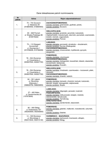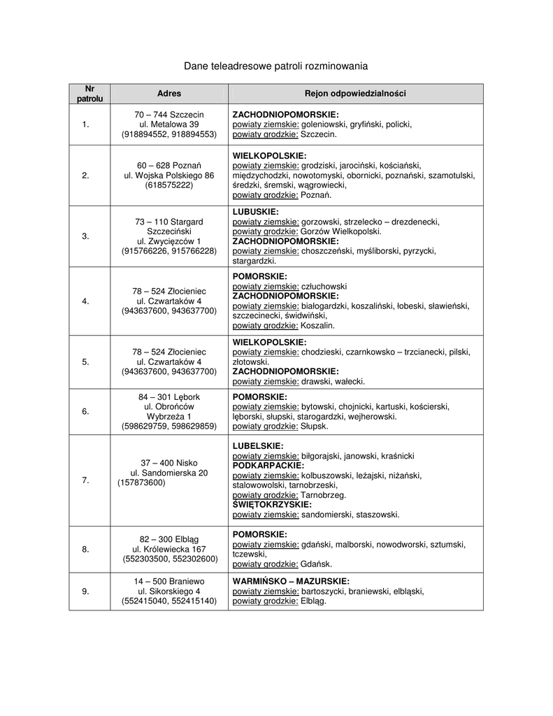 Dane teleadresowe patroli rozminowania Nr patrolu Adres Rejon odpowiedzialności ZACHODNIOPOMORSKIE: powiaty ziemskie: goleniowski, gryfiński, policki, powiaty grodzkie: Szczecin. 1. 70 – 744 Szczecin ul. Metalowa 39 (918894552, 918894553) 2. 60 – 628 Poznań ul. Wojska Polskiego 86 (618575222) 3. 73 – 110 Stargard Szczeciński ul. Zwycięzców 1 (915766226, 915766228) LUBUSKIE: powiaty ziemskie: gorzowski, strzelecko – drezdenecki, powiaty grodzkie: Gorzów Wielkopolski. ZACHODNIOPOMORSKIE: powiaty ziemskie: choszczeński, myśliborski, pyrzycki, stargardzki. 4. 78 – 524 Złocieniec ul. Czwartaków 4 (943637600, 943637700) POMORSKIE: powiaty ziemskie: człuchowski ZACHODNIOPOMORSKIE: powiaty ziemskie: białogardzki, koszaliński, łobeski, sławieński, szczecinecki, świdwiński, powiaty grodzkie: Koszalin. 5. 78 – 524 Złocieniec ul. Czwartaków 4 (943637600, 943637700) WIELKOPOLSKIE: powiaty ziemskie: chodzieski, czarnkowsko – trzcianecki, pilski, złotowski. ZACHODNIOPOMORSKIE: powiaty ziemskie: drawski, wałecki. 6. 84 – 301 Lębork ul. Obrońców Wybrzeża 1 (598629759, 598629859) POMORSKIE: powiaty ziemskie: bytowski, chojnicki, kartuski, kościerski, lęborski, słupski, starogardzki, wejherowski. powiaty grodzkie: Słupsk. 7. 37 – 400 Nisko ul. Sandomierska 20 (157873600) WIELKOPOLSKIE: powiaty ziemskie: grodziski, jarociński, kościański, międzychodzki, nowotomyski, obornicki, poznański, szamotulski, średzki, śremski, wągrowiecki, powiaty grodzkie: Poznań. LUBELSKIE: powiaty ziemskie: biłgorajski, janowski, kraśnicki PODKARPACKIE: powiaty ziemskie: kolbuszowski, leżajski, niżański, stalowowolski, tarnobrzeski, powiaty grodzkie: Tarnobrzeg. ŚWIĘTOKRZYSKIE: powiaty ziemskie: sandomierski, staszowski. 8. 82 – 300 Elbląg ul. Królewiecka 167 (552303500, 552302600) POMORSKIE: powiaty ziemskie: gdański, malborski, nowodworski, sztumski, tczewski, powiaty grodzkie: Gdańsk. 9. 14 – 500 Braniewo ul. Sikorskiego 4 (552415040, 552415140) WARMIŃSKO – MAZURSKIE: powiaty ziemskie: bartoszycki, braniewski, elbląski, powiaty grodzkie: Elbląg. Nr patrolu Adres Rejon odpowiedzialności 11 – 500 Giżycko ul. Wojska Polskiego 1 (874294320, 874294321) PODLASKIE: powiaty ziemskie: augustowski, sejneński, suwalski, powiaty grodzkie: Suwałki. WARMIŃSKO – MAZURSKIE: powiaty ziemskie: giżycki, gołdapski, kętrzyński, olecki, węgorzewski. 10 – 073 Olsztyn ul. Saperska 1 (895423428, 605727486) WARMIŃSKO – MAZURSKIE: powiaty ziemskie: działdowski, iławski, lidzbarski, nidzicki, nowomiejski, olsztyński, ostródzki, szczycieński, powiaty grodzkie: Olsztyn. 12 – 250 Orzysz ul. Wojska Polskiego 33 (874371933, 874371934) MAZOWIECKIE: powiaty ziemskie: ostrołęcki. PODLASKIE: powiaty ziemskie: grajewski, kolneński, łomżyński, powiaty grodzkie: Łomża, Ostrołęka. WARMIŃSKO – MAZURSKIE: powiaty ziemskie: ełcki, mrągowski, piski. 13. 86 – 200 Chełmno ul. 3 – go Maja 3 (566673220, 566673222) KUJAWSKO – POMORSKIE: powiaty ziemskie: brodnicki, bydgoski, chełmiński, golubsko – dobrzyński, grudziądzki, sępoleński, świecki, tucholski, wąbrzeski, powiaty grodzkie: Bydgoszcz, Grudziądz, POMORSKIE: powiaty ziemskie: kwidzyński 14. 88 – 100 Inowrocław ul. Dworcowa 56 (523596222, 523596671) KUJAWSKO – POMORSKIE: powiaty ziemskie: aleksandrowski, inowrocławski, lipnowski, mogileński, radziejowski, rypiński, toruński, włocławski, powiaty grodzkie: Toruń, Włocławek. 15. 88 – 100 Inowrocław ul. Dworcowa 56 (523596222, 523596671) KUJAWSKO – POMORSKIE: powiaty ziemskie: nakielski, żniński, WIELKOPOLSKIE: powiaty ziemskie: gnieźnieński, kaliski, kolski, koniński, pleszewski, słupecki, turecki, wrzesiński, powiaty grodzkie: Kalisz, Konin. 16. 15 – 601 Białystok ul. Kawaleryjska 70 (857498530) 10. 11. 12. 17. 05 – 076 Warszawa-Wesoła ul. Okuniewska 1 (226812180, 226812301) 18. 05-100 Nowy Dwór Maz. ul. Leśna 1 (523596222, 523596671) PODLASKIE: powiaty ziemskie: białostocki, bielski, hajnowski, moniecki, siemiatycki, sokólski, wysokomazowiecki, zambrowski, powiaty grodzkie: Białystok. LUBELSKIE: powiaty ziemskie: łukowski, MAZOWIECKIE: powiaty ziemskie: garwoliński, łosicki, miński, otwocki, ostrowski, siedlecki, sokołowski, węgrowski, wołomiński, powiaty grodzkie: Siedlce. MAZOWIECKIE: powiaty ziemskie: ciechanowski, makowski, mławski, płoński, przasnyski, pułtuski, sierpecki, wyszkowski, żuromiński. Nr patrolu Adres Rejon odpowiedzialności 19. 05-100 Nowy Dwór Maz. ul. Leśna 1 (523596222, 523596671) ŁÓDZKIE: powiaty ziemskie: kutnowski, MAZOWIECKIE: powiaty ziemskie: białobrzeski, gostyniński, grodziski, grójecki, nowodworski, piaseczyński, płocki, pruszkowski, sochaczewski, warszawski zachodni, żyrardowski, powiaty grodzkie: Płock. 20. 05-100 Nowy Dwór Maz. ul. Leśna 1 (523596222, 523596671) MAZOWIECKIE: powiaty ziemskie: legionowski, powiaty grodzkie: Warszawa. 21. 66 – 600 Krosno Odrzańskie ul. Piastów 7 (683672121, 683672111) LUBUSKIE: powiaty ziemskie: krośnieński, międzyrzecki, słubicki, sulęciński, świebodziński, żarski. 22. 67-200 Głogów ul. Wojska Polskiego 58 (768364303, 768364953) DOLNOŚLĄSKIE: powiaty ziemskie: górowski, milicki, trzebnicki, wołowski, LUBUSKIE: powiaty ziemskie: nowosolski, wschowski, zielonogórski, żagański, powiaty grodzkie: Zielona Góra, WIELKOPOLSKIE: powiaty ziemskie: gostyński, krotoszyński, leszczyński, ostrowski, rawicki, wolsztyński, powiaty grodzkie: Leszno. 23. 59 – 700 Bolesławiec al. Wojska Polskiego (756411505, 756411504) DOLNOŚLĄSKIE: powiaty ziemskie: bolesławiecki, jeleniogórski, kamiennogórski, lubański, lwówecki, zgorzelecki, złotoryjski, powiaty grodzkie: Jelenia Góra. 24. 67-200 Głogów ul. Wojska Polskiego 58 (768364303, 768364953) DOLNOŚLĄSKIE: powiaty ziemskie: głogowski, jaworski, legnicki, lubiński, polkowicki, średzki, świdnicki, wałbrzyski, powiaty grodzkie: Legnica. 2