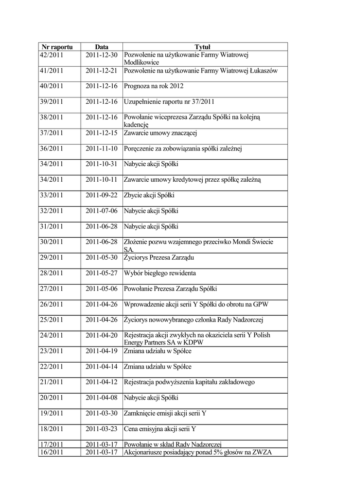 Nr raportu 42/2011 41/2011 Data Tytuł 2011-12-30 Pozwolenie na użytkowanie Farmy Wiatrowej Modlikowice 2011-12-21 Pozwolenie na użytkowanie Farmy Wiatrowej Łukaszów 40/2011 2011-12-16 Prognoza na rok 2012 39/2011 2011-12-16 Uzupełnienie raportu nr 37/2011 38/2011 37/2011 2011-12-16 Powołanie wiceprezesa Zarządu Spółki na kolejną kadencję 2011-12-15 Zawarcie umowy znaczącej 36/2011 2011-11-10 Poręczenie za zobowiązania spółki zależnej 34/2011 2011-10-31 Nabycie akcji Spółki 34/2011 2011-10-11 Zawarcie umowy kredytowej przez spółkę zależną 33/2011 2011-09-22 Zbycie akcji Spółki 32/2011 2011-07-06 Nabycie akcji Spółki 31/2011 2011-06-28 Nabycie akcji Spółki 30/2011 29/2011 2011-06-28 Złożenie pozwu wzajemnego przeciwko Mondi Świecie S.A. 2011-05-30 Życiorys Prezesa Zarządu 28/2011 2011-05-27 Wybór biegłego rewidenta 27/2011 2011-05-06 Powołanie Prezesa Zarządu Spółki 26/2011 2011-04-26 Wprowadzenie akcji serii Y Spółki do obrotu na GPW 25/2011 2011-04-26 Życiorys nowowybranego członka Rady Nadzorczej 24/2011 23/2011 2011-04-20 Rejestracja akcji zwykłych na okaziciela serii Y Polish Energy Partners SA w KDPW 2011-04-19 Zmiana udziału w Spółce 22/2011 2011-04-14 Zmiana udziału w Spółce 21/2011 2011-04-12 Rejestracja podwyższenia kapitału zakładowego 20/2011 2011-04-08 Nabycie akcji Spółki 19/2011 2011-03-30 Zamknięcie emisji akcji serii Y 18/2011 2011-03-23 Cena emisyjna akcji serii Y 17/2011 16/2011 2011-03-17 Powołanie w skład Rady Nadzorczej 2011-03-17 Akcjonariusze posiadający ponad 5% głosów na ZWZA 15/2011 14/2011 13/2011 2011-03-17 2011-03-17 2011-03-16 Nabycie akcji Spółki Warunki emisji akcji serii Y Uchwały ZWZA 12/2011 2011-03-09 Nabycie akcji Spółki 11/2011 2011-03-03 Nabycie akcji Spółki 10/2011 2011-03-01 Nabycie akcji Spółki 9/2011 2011-02-24 8/2011 2011-02-16 7/2011 2011-02-14 Uzupełnienie porządku obrad w wyniku żądań akcjonariuszy Zwyczajne Walne Zgromadzenie - 16.03.2011, godz. 10.00 Doręczenie Spółce odpisu pozwu 6/2011 2011-02-11 5/2011 2011-02-08 4/2011 2011-02-04 3/2011 2011-01-28 Stanowisko PEP dot. raportu bieżącego Mondi Świecie S.A. nr 3/2011 Nabycie nieruchomości przez spółkę zależną 2/2011 2011-01-25 Terminy raportów okresowych za rok 2011 1/2011 2011-01-13 Prognoza wyników na rok 2011 Data 2011-11-04 Stanowisko Zarządu dotyczące podziału zysku za rok 2010 Zestawienie raportów opublikowanych w roku 2010 Rodzaj raportu Raport kwartalny za III kwartał 2011 roku 2011-08-11 Skonsolidowany raport półroczny za I półrocze 2011 roku 2011-05-05 Raport kwartalny za I kwartał 2011 roku 2011-02-10 Skonsolidowany raport roczny za 2011 rok 2011-02-10 Raport roczny za 2011 rok Report No. 40/2011 Date Title Occupancy permit for Modlikowice wind 2011-12-30 farm 2011-12-21 Occupancy permit to operate the Łukaszów Wind Power Plant 2011-12-16 Volume projection for 2012 39/2011 2011-12-16 Supplement to the 37/2011 report 38/2011 37/2011 2011-12-16 Appointment of the Company’s Vice-President for the next term of office 2011-12-15 Execution of the reference agreement 36/2011 2011-11-10 Guarantee for liabilities of a subsidiary 35/2011 2011-10-31 Acquisition of the Company shares 34/2011 33/2011 2011-10-11 Execution of credit facility agreement by the Company’s subsidiary 2011-09-22 Disposal of the Company shares 32/2011 2011-07-06 Acquisition of the Company shares 31/2011 2011-06-28 Acquisition of the Company shares 30/2011 2011-06-28 PEP filed a statement of counterclaim against Mondi Świecie S.A. in the Court of Arbitration (…) 29/2011 2011-05-30 Resume of Zbigniew Prokopowicz 28/2011 2011-05-27 Appointment of the certified auditor 27/2011 26/2011 2011-05-06 Appointment of the President of the Company’s Board of Directors 2011-04-26 Introduction of series Y Shares to trading on the WSE 25/2011 2011-04-26 Resume of the newly elected Supervisory Board Member 24/2011 23/2011 2011-04-20 Registration of series Y ordinary bearer shares of PEP S.A. in the National Depository for Securities 2011-04-19 Shareholders structure change 22/2011 2011-04-14 Shareholders structure change 21/2011 2011-04-12 Registration of the increase in the share capital 20/2011 2011-04-08 Acquisition of Polish Energy Partners Spółka Akcyjna shares 19/2011 2011-03-30 Closing of series Y shares issue 18/2011 2011-03-23 Issue price of series Y shares 17/2011 16/2011 2011-03-17 The new member of the Supervisory Board 2011-03-17 Shareholders owning >5% shares at the General Assembly 42/2011 41/2011 15/2011 14/2011 13/2011 2011-03-17 2011-03-17 2011-03-16 Acquisition of the Company shares Terms of issue of series Y shares Resolutions of the Ordinary General Assembly 12/2011 2011-03-09 Acquisition of the Company shares 11/2011 2011-03-03 Acquisition of Polish Energy Partners Spółka Akcyjna shares 10/2011 2011-03-01 Acquisition of Polish Energy Partners Spółka Akcyjna shares 9/2011 2011-02-24 8/2011 2011-02-16 Supplement to General Assembly agenda due to shareholder’s request Ordinary General Assembly 16th March 2011, 10:00 7/2011 2011-02-14 Service of a copy of a statement of claim to the Company 6/2011 2011-02-11 5/2011 2011-02-08 Position of the Board of Directors towards the distribution of profit for 2010 List of current reports published in 2010 4/2011 2011-02-04 3/2011 2011-01-28 Position of PEP towards the Current Report 3/2011 of Mondi Świecie S.A. Acquisition of real property by a subsidiary 2/2011 2011-01-25 2011 periodical reports publication dates 1/2011 2011-01-13 The forecast results for 2011 Date 2011-11-04 Report type rd Consolidated quarterly report for 3 quarter of 2011 st 2011-08-11 Consolidated half-yearly report for 1 half-year of 2011 st 2011-05-05 Quarterly report for 1 quarter of 2011 2011-02-10 Consolidated yearly report for 2011 2011-02-10 Yearly report for 2011
