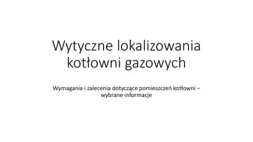 Wytyczne lokalizowania kotłowni gazowych Wymagania i zalecenia dotyczące pomieszczeń kotłowni – wybrane informacje Literatura • Rozporządzenie Ministra Infrastruktury z dn. 12 kwietnia 2002 r. w sprawie warunków technicznych, jakim powinny odpowiadać budynki i ich usytuowanie (Dz. U. nr 75, poz. 690 z późn. zm.) - tekst jednolity: http://www.snb.org.pl/warunki-techniczne-tekst-jednolity • PN-B-02431-1:1999 Ogrzewnictwo - Kotłownie wbudowane na paliwa gazowe o gęstości względnej mniejszej niż 1 - Wymagania • Komenda Główna Państwowej Straży Pożarnej, pismo BZ-III-0262/142-2/10 z dnia 20 stycznia 2011 r. http://www.katowice.kwpsp.gov.pl/htdoc/pub/File/rzeczoznawcy/pismo_KGPSP_4.pdf • Komenda Główna Państwowej Straży Pożarnej, pismo BZ-III-026/122-2/12 z dnia 19 listopada 2012 r. http://www.katowice.kwpsp.gov.pl/htdoc/pub/File/rzeczoznawcy/prewencja/BZ-III-026122-212.pdf • Komenda Główna Państwowej Straży Pożarnej, Interpretacje przepisów – 2012 r. http://www.straz.gov.pl/data/other/interpretacje_kg_2012.pdf • Mizielińska K., Olszak J., Gazowe i olejowe źródła ciepła małej mocy, Oficyna Wydawnicza Politechniki Warszawskiej, Warszawa 2011 Wybrane definicje Dz.U. nr 75, poz. 690 z późn. zm. • Poziom terenu – przyjęta w projekcie rzędna terenu w danym miejscu działki budowlanej; • Kondygnacja – pozioma, nadziemna lub podziemna część budynku, zawartą pomiędzy powierzchnią posadzki na stropie lub najwyżej położonej warstwy podłogowej na gruncie, a powierzchnią posadzki na stropie, bądź warstwy osłaniającej izolację cieplną stropu, znajdującego się nad tą częścią budynku, przy czym za kondygnację uważa się także poddasze z pomieszczeniami przeznaczonymi na pobyt ludzi oraz poziomą część budynku stanowiącą przestrzeń na urządzenia techniczne, mającą średnią wysokość w świetle większą niż 2 m; za kondygnację nie uznaje się nadbudówek ponad dachem, takich jak maszynownia dźwigu, centrala wentylacyjna, klimatyzacyjna lub kotłownia; • Kondygnacja podziemna – kondygnacja zagłębiona ze wszystkich stron budynku, co najmniej do połowy jej wysokości w świetle poniżej poziomu przylegającego do niego terenu, a także każda usytuowana pod nią kondygnacja; • Kondygnacja nadziemna – każda kondygnacja niebędąca kondygnacją podziemną; • Piwnica - kondygnacja podziemna lub najniższa nadziemna bądź ich część, w których poziom podłogi co najmniej z jednej strony budynku znajduje się poniżej poziomu terenu; Wybrane definicje Dz.U. nr 75, poz. 690 z późn. zm. • Mieszkanie - zespół pomieszczeń mieszkalnych i pomocniczych, mający odrębne wejście, wydzielony stałymi przegrodami budowlanymi, umożliwiający stały pobyt ludzi i prowadzenie samodzielnego gospodarstwa domowego; • Pomieszczenia mieszkalne - pokoje w mieszkaniu, a także sypialnie i pomieszczenia do dziennego pobytu ludzi w budynku zamieszkania zbiorowego; • Pomieszczenie pomocnicze – pomieszczenie znajdujące się w obrębie mieszkania lub lokalu użytkowego służące do celów komunikacji wewnętrznej, higieniczno-sanitarnych, przygotowywania posiłków, z wyjątkiem kuchni zakładów żywienia zbiorowego, a także do przechowywania ubrań, przedmiotów oraz żywności; • Pomieszczenie techniczne – pomieszczenie przeznaczone dla urządzeń służących do funkcjonowania i obsługi technicznej budynku; • Pomieszczenie gospodarcze – pomieszczenie znajdujące się poza mieszkaniem lub lokalem użytkowym, służące do przechowywania przedmiotów lub produktów żywnościowych użytkowników budynku, materiałów lub sprzętu związanego z obsługą budynku, a także opału lub odpadów stałych Wybrane definicje Dz.U. nr 75, poz. 690 z późn. zm. Podział budynków na grupy wysokości: 1) niskie (N) - do 12 m włącznie nad poziomem terenu lub mieszkalne o wysokości do 4 kondygnacji nadziemnych włącznie, 2) średniowysokie (SW) - ponad 12 m do 25 m włącznie nad poziomem terenu lub mieszkalne o wysokości ponad 4 do 9 kondygnacji nadziemnych włącznie, 3) wysokie (W) - ponad 25 m do 55 m włącznie nad poziomem terenu lub mieszkalne o wysokości ponad 9 do 18 kondygnacji nadziemnych włącznie, 4) wysokościowe (WW) - powyżej 55 m nad poziomem terenu. Kubatura pomieszczeń z kotłami na paliwa gazowe Dz.U. nr 75, poz. 690 z późn. zm. • § 172. 1. Maksymalne, łączne obciążenie cieplne przypadające na 1 m3 kubatury, służące do określania wymaganej kubatury pomieszczenia, w którym są zainstalowane urządzenia gazowe, pobierające powietrze do spalania z tego pomieszczenia, nie może przekraczać wartości określonych w poniższej tabeli: Kubatura pomieszczeń z kotłami na paliwa gazowe Dz.U. nr 75, poz. 690 z późn. zm. • § 172. 3. Kubatura pomieszczeń, w których instaluje się urządzenia gazowe, nie powinna być mniejsza niż: 1) 8 m3 - w przypadku urządzeń pobierających powietrze do spalania z tych pomieszczeń, 2) 6,5 m3 - w przypadku urządzeń z zamkniętą komorą spalania. Kubatura pomieszczeń z kotłami na paliwa gazowe Dz.U. nr 75, poz. 690 z późn. zm. Kotły z otwartą komorą spalania: • § 176. 6. Kubatura pomieszczeń z kotłami na paliwa gazowe o łącznej mocy cieplnej do 60 kW oraz z kotłami o mocy cieplnej powyżej 60 kW pobierającymi powietrze z pomieszczeń powinna odpowiadać wymaganiom określonym w § 172; Kotły z zamkniętą komorą spalania: • § 176. 7. Kubatura pomieszczeń z kotłami, o których mowa w ust. 4 i 5 (o łącznej mocy cieplnej powyżej 60 kW do 2000 kW oraz powyżej 2000 kW), z zamkniętą komorą spalania, powinna być określana indywidualnie, przy uwzględnieniu warunków technicznych i technologicznych, a także wymagań eksploatacyjnych. • Kubatura pomieszczenia kotłowni dla kotłów o łącznej mocy cieplnej do 60 kW nie może przekroczyć maksymalnego obciążenia cieplnego 4650 W/m3 (wg Mizielińsk