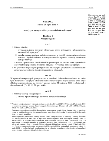 ©Kancelaria Sejmu s. 1/44 Opracowano na podstawie Dz. U. z 2005 r. Nr 180, poz. 1495, z 2008 r. Nr 223, poz. 1464, z 2009 r. Nr 79, poz. 666, Nr 215, poz. 1664, z 2011 r. Nr 63, poz. 322, Nr 106, poz. 622, Nr 152, poz. 897, Nr 171, poz. 1016, z 2013 r. poz. 21. USTAWA z dnia 29 lipca 2005 r. o zużytym sprzęcie elektrycznym i elektronicznym 1) Rozdział 1 Przepisy ogólne Art. 1. 1. Ustawa określa: 1) wymagania, jakim powinien odpowiadać sprzęt elektryczny i elektroniczny, zwany dalej „sprzętem”, 2) zasady postępowania ze zużytym sprzętem w sposób zapewniający ochronę zdrowia i życia ludzi oraz ochronę środowiska zgodnie z zasadą zrównoważonego rozwoju – w celu ograniczenia ilości odpadów powstałych ze sprzętu oraz zapewnienia odpowiedniego poziomu zbierania, odzysku i recyklingu zużytego sprzętu. 2. W sprawach dotyczących postępowania ze zużytym sprzętem w zakresie nieuregulowanym w ustawie stosuje się przepisy o odpadach. Art. 1a. W sprawach dotyczących postępowania z bateriami i akumulatorami oraz ze zużytymi bateriami i zużytymi akumulatorami stanowiącymi przynależność albo część składową sprzętu stosuje się przepisy ustawy z dnia 24 kwietnia 2009 r. o bateriach i akumulatorach (Dz. U. Nr 79, poz. 666). Art. 2. 1. Przepisy ustawy stosuje się do: 1) sprzętu wprowadzonego do obrotu na terytorium kraju; 1) Przepisy niniejszej ustawy wdrażają postanowienia dyrektywy 2002/96/WE z dnia 27 stycznia 2003 r. w sprawie zużytego sprzętu elektrycznego i elektronicznego (Dz.Urz. UE L 37 z 13.02.2003, str. 34 i L 345 z 31.12.2003, str. 106). Dane dotyczące aktu prawa Unii Europejskiej ogłoszonego przed dniem 1 maja 2004 r., zamieszczone w niniejszej ustawie, dotyczą ogłoszenia tego aktu w Dzienniku Urzędowym Unii Europejskiej – wydanie specjalne. Niniejszą ustawą zmienia się ustawy: ustawę z dnia 20 lipca 1991 r. o Inspekcji Ochrony Środowiska, ustawę z dnia 26 lipca 1991 r. o podatku dochodowym od osób fizycznych, ustawę z dnia 15 lutego 1992 r. o podatku dochodowym od osób prawnych, ustawę z dnia 13 września 1996 r. o utrzymaniu czystości i porządku w gminach, ustawę z dnia 26 listopada 1998 r. o finansach publicznych, ustawę z dnia 15 grudnia 2000 r. o Inspekcji Handlowej, ustawę z dnia 27 kwietnia 2001 r. – Prawo ochrony środowiska, ustawę z dnia 27 kwietnia 2001 r. o odpadach oraz ustawę z dnia 11 maja 2001 r. o obowiązkach przedsiębiorców w zakresie gospodarowania niektórymi odpadami oraz o opłacie produktowej i opłacie depozytowej. 2013-02-08 ©Kancelaria Sejmu s. 2/44 2) zużytego sprzętu. 2. Przepisy art. 21, art. 23, art. 24, art. 26, art. 27, art. 29 i art. 31 dotyczące wprowadzającego sprzęt stosuje się odpowiednio do przedsiębiorcy prowadzącego sprzedaż sprzętu przy wykorzystaniu środków porozumiewania się na odległość, o których mowa w art. 6 ustawy z dnia 2 marca 2000 r. o ochronie niektórych praw konsumentów oraz o odpowiedzialności za szkodę wyrządzoną przez produkt niebezpieczny (Dz. U. z 2012 r. poz. 1225), z terytorium kraju do państwa członkowskiego Unii Europejskiej innego niż Rzeczpospolita Polska lub do państwa członkowskiego Europejskiego Porozumienia o Wolnym Handlu (EFTA) – strony umowy o Europejskim Obszarze Gospodarczym. 2a. Do przedsiębiorcy prowadzącego sprzedaż sprzętu przy wykorzystaniu środków porozumiewania się na odległość, o którym mowa w ust. 2, stosuje się przepisy ustawy z dnia 14 grudnia 2012 r. o odpadach (Dz. U. z 2013 r. poz. 21) dotyczące wprowadzającego sprzęt. 3. Przepisów ustawy nie stosuje się do: 1) sprzętu służącego ochronie bezpieczeństwa Rzeczypospolitej Polskiej, jeżeli ten sprzęt jest przeznaczony wyłącznie do celów wojskowych; 2) odpadów promieniotwórczych w rozumieniu przepisów ustawy z dnia 29 listopada 2000 r. – Prawo atomowe (Dz. U. z 2004 r. Nr 161, poz. 1689 i Nr 173, poz. 1808); 3) sprzętu będącego częścią składową urządzenia, które nie jest sprzętem w rozumieniu przepisów ustawy. Art. 3. 1. Użyte w ustawie określenia oznaczają: 1) decyzje związane z gospodarką odpadami – decyzje, o których mowa w art. 41 ustawy z dnia 14 grudnia 2012 r. o odpadach oraz w art. 181 ust. 1 pkt 1 i 4 ustawy z dnia 27 kwietnia 2001 r. – Prawo ochrony środowiska (Dz. U. z 2008 r. Nr 25, poz. 150, z późn. zm. 2)); 2) import – przywóz sprzętu z terytorium państwa niebędącego państwem członkowskim Unii Europejskiej lub państwem członkowskim Europejskiego Porozumienia o Wolnym Handlu (EFTA) – stroną umowy o Europejskim Obszarze Gospodarczym w celu wprowadzenia do obrotu; 3) odzysk – odzysk w rozumieniu art. 3 ust. 1 pkt 14 ustawy z dnia 14 grudnia 2012 r. o odpadach; 4) ponowne użycie – użycie zużytego sprzętu lub jego części składowych w tym samym celu, dla jakiego były zaprojektowane i wykonane; 2) Zmiany tekstu jednolitego wymienionej ustawy zostały ogłoszone w Dz. U. z 2008 r. Nr 111, poz. 708, Nr 138, poz. 865, Nr 154, poz. 958, Nr 171, poz. 1056, Nr 199, poz. 1227, Nr 223, poz. 1464 i Nr 227, poz. 1505, z 2009 r. Nr 19, poz. 100, Nr 20, poz. 106, Nr 79, poz. 666, Nr 130, poz. 1070, Nr 215, poz.1664, z 2010 r. Nr 21, poz. 104, Nr 28, poz. 145, Nr 40, poz. 227, Nr 76, poz. 489, Nr 119, poz. 804, Nr 152, poz. 1018 i 1019, Nr 182, poz. 1228, Nr 229, poz. 1498 i Nr 249, poz. 1657, z 2011 r. Nr 32, poz. 159, Nr 63, poz. 322, Nr 94, poz. 551, Nr 99, poz. 569, Nr 122, poz. 695, Nr 152, poz. 897, Nr 178, poz. 1060 i Nr 224, poz. 1341, z 2012 r. poz. 460, 951, 1513 oraz z 2013 r. poz. 21. 2013-02-08 ©Kancelaria Sejmu s. 3/44 4a) przedsiębiorca – przedsiębiorcę w rozumieniu ustawy z dnia 2 lipca 2004 r. o swobodzie działalności gospodarczej (Dz. U. z 2007 r. Nr 155, poz. 1095, z późn. zm.3)); 5) przetwarzanie – wszystkie czynności podejmowane po przekazaniu zużytego sprzętu do przedsiębiorcy prowadzącego zakład przetwarzania w celu demontażu obejm