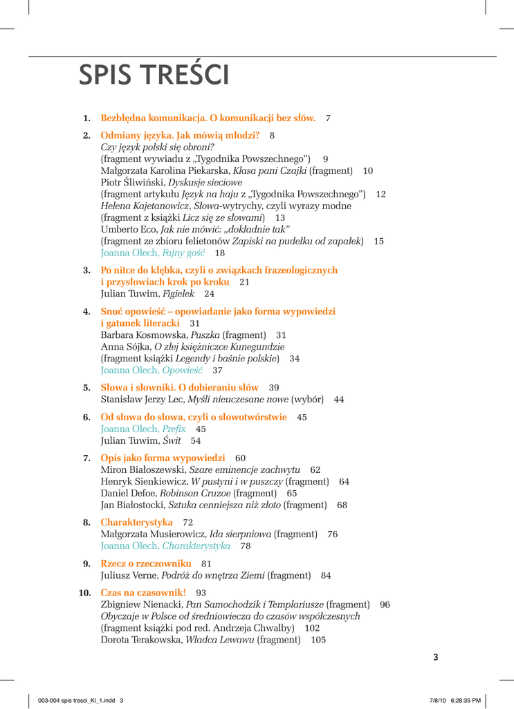 SPIS TREŚCI 1. Bezbłędna komunikacja. O komunikacji bez słów. 7 2. dmiany języka. Jak mówią młodzi? 8 O Czy język polski się obroni? (fragment wywiadu z „Tygodnika Powszechnego”) 9 Małgorzata Karolina Piekarska, Klasa pani Czajki (fragment) 10 Piotr Śliwiński, Dyskusje sieciowe (fragment artykułu Język na haju z „Tygodnika Powszechnego”) 12 Helena Kajetanowicz, Słowa-wytrychy, czyli wyrazy modne (fragment z książki Licz się ze słowami) 13 Umberto Eco, Jak nie mówić: „dokładnie tak” (fragment ze zbioru felietonów Zapiski na pudełku od zapałek) 15 Joanna Olech, Fajny gość 18 3. P o nitce do kłębka, czyli o związkach frazeologicznych i przysłowiach krok po kroku 21 Julian Tuwim, Figielek 24 4. nuć opowieść – opowiadanie jako forma wypowiedzi S i gatunek literacki 31 Barbara Kosmowska, Puszka (fragment) 31 Anna Sójka, O złej księżniczce Kunegundzie (fragment książki Legendy i baśnie polskie) 34 Joanna Olech, Opowieść 37 5. Słowa i słowniki. O dobieraniu słów 39 Stanisław Jerzy Lec, Myśli nieuczesane nowe (wybór) 44 6. Od słowa do słowa, czyli o słowotwórstwie 45 Joanna Olech, Prefix 45 Julian Tuwim, Świt 54 7. pis jako forma wypowiedzi 60 O Miron Białoszewski, Szare eminencje zachwytu 62 Henryk Sienkiewicz, W pustyni i w puszczy (fragment) 64 Daniel Defoe, Robinson Cruzoe (fragment) 65 Jan Białostocki, Sztuka cenniejsza niż złoto (fragment) 68 8. Charakterystyka 72 Małgorzata Musierowicz, Ida sierpniowa (fragment) 76 Joanna Olech, Charakterystyka 78 9. Rzecz o rzeczowniku 81 Juliusz Verne, Podróż do wnętrza Ziemi (fragment) 84 10. zas na czasownik! 93 C Zbigniew Nienacki, Pan Samochodzik i Templariusze (fragment) 96 Obyczaje w Polsce od średniowiecza do czasów współczesnych (fragment książki pod red. Andrzeja Chwalby) 102 Dorota Terakowska, Władca Lewawu (fragment) 105 3 003-004 spis tresci_Kl_1.indd 3 7/8/10 6:28:35 PM Lucy Maud Montgomery, Ania z Zielonego Wzgórza (fragment) 105 Friedmann Schulz von Thun, Sztuka rozmawiania (fragment) 107 Karol Olgierd Borchardt, Wuj Ignacy (fragment ze zbioru opowiadań Pod czerwoną różą) 108 11. Przymioty przymiotnika 111 Stanisław Lem, Dzienniki gwiazdowe (fragment) 112 Juliusz Słowacki, Beniowski (fragment Pieśni V poematu) 117 12. Liczymy z liczebnikiem 119 13. 14. zastępstwie... – czyli o zaimku 124 W Mark Twain, Przygody Tomka Sawyera (fragment) 125 O nieodmiennych częściach mowy 128 Zofia Kossak, Bursztyny (fragment) 133 15. Imiesłów 136 Clive Staples Lewis, Książę Kaspian (fragment) 137 Joanna Olech, Imiesłowy 141 16. Rodzaje wypowiedzeń 144 17. Ćwiczenia ortograficzne 148 18. Warsztat dziennikarski – Nic o nas bez nas – zakładamy szkolną gazetkę 158 19. W arsztat dziennikarski – Najtrudniejszy pierwszy krok – piszemy tekst do gazetki 164 Melchior Wańkowicz, Wodami Polski (fragment z książki Ziele na kraterze) 164 20. Warsztat dziennikarski – Szkolna gazetka krok po kroku 171 Joanna Olech, Gazetka szkolna 171 Melchior Wańkowicz, Karafka La Fontaine’a (fragment) 175 21. Warsztat dziennikarski – Prasowe ABC 176 Dziennikarstwo obrazkowe (fragment wywiadu z „Gazety Wyborczej”) 179 22. Warsztat dziennikarski – Informujemy 183 23. arsztat dziennikarski – Wyrażamy opinie 188 W Joanna Olech, Moc i przemoc (fragment artykułu z „Tygodnika Powszechnego”) 190 Adam Wajrak, Wątroba powiększona humanitarnie (fragment artykułu z „Gazety Wyborczej”) 191 24. arsztat dziennikarski – Porozmawiajmy... 193 W Porządny arabski grymas (fragment wywiadu Anny Stańczyk z Jakubem Sławkiem, „Gazeta Wyborcza”) 196 Czat z Małgorzatą Karoliną Piekarską (fragmenty z portalu „Wirtualna Polska”) 198 WAŻNE SŁOWA 201 NOTATKI 203 4 003-004 spis tresci_Kl_1.indd 4 7/8/10 6:28:35 PM
