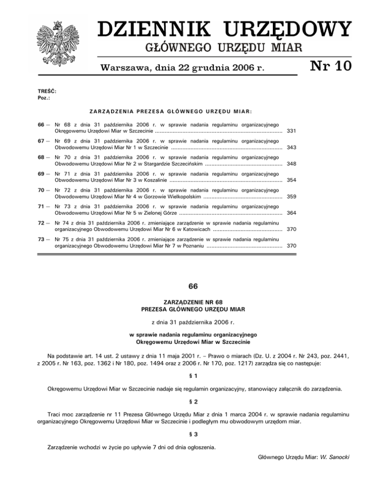 Warszawa, dnia 22 grudnia 2006 r. Nr 10 TREŚĆ: Poz.: ZARZĄDZENIA PREZESA GŁÓWNEGO URZĘDU MIAR: 66 — Nr 68 z dnia 31 października 2006 r. w sprawie nadania regulaminu organizacyjnego Okręgowemu Urzędowi Miar w Szczecinie ............................................................................... 331 67 — Nr 69 z dnia 31 października 2006 r. w sprawie nadania regulaminu organizacyjnego Obwodowemu Urzędowi Miar Nr 1 w Szczecinie ..................................................................... 343 68 — Nr 70 z dnia 31 października 2006 r. w sprawie nadania regulaminu organizacyjnego Obwodowemu Urzędowi Miar Nr 2 w Stargardzie Szczecińskim ................................................ 348 69 — Nr 71 z dnia 31 października 2006 r. w sprawie nadania regulaminu organizacyjnego Obwodowemu Urzędowi Miar Nr 3 w Koszalinie ...................................................................... 354 70 — Nr 72 z dnia 31 października 2006 r. w sprawie nadania regulaminu organizacyjnego Obwodowemu Urzędowi Miar Nr 4 w Gorzowie Wielkopolskim ................................................. 359 71 — Nr 73 z dnia 31 października 2006 r. w sprawie nadania regulaminu organizacyjnego Obwodowemu Urzędowi Miar Nr 5 w Zielonej Górze ................................................................ 364 72 — Nr 74 z dnia 31 października 2006 r. zmieniające zarządzenie w sprawie nadania regulaminu organizacyjnego Obwodowemu Urzędowi Miar Nr 6 w Katowicach ........................................... 370 73 — Nr 75 z dnia 31 października 2006 r. zmieniające zarządzenie w sprawie nadania regulaminu organizacyjnego Obwodowemu Urzędowi Miar Nr 7 w Poznaniu ............................................... 370 66 ZARZĄDZENIE NR 68 PREZESA GŁÓWNEGO URZĘDU MIAR z dnia 31 października 2006 r. w sprawie nadania regulaminu organizacyjnego Okręgowemu Urzędowi Miar w Szczecinie Na podstawie art. 14 ust. 2 ustawy z dnia 11 maja 2001 r. – Prawo o miarach (Dz. U. z 2004 r. Nr 243, poz. 2441, z 2005 r. Nr 163, poz. 1362 i Nr 180, poz. 1494 oraz z 2006 r. Nr 170, poz. 1217) zarządza się co następuje: §1 Okręgowemu Urzędowi Miar w Szczecinie nadaje się regulamin organizacyjny, stanowiący załącznik do zarządzenia. §2 Traci moc zarządzenie nr 11 Prezesa Głównego Urzędu Miar z dnia 1 marca 2004 r. w sprawie nadania regulaminu organizacyjnego Okręgowemu Urzędowi Miar w Szczecinie i podległym mu obwodowym urzędom miar. §3 Zarządzenie wchodzi w życie po upływie 7 dni od dnia ogłoszenia. Głównego Urzędu Miar: W. Sanocki Dziennik Urzędowy Głównego Urzędu Miar Nr 10 — 332 — Poz. 66 Załącznik do zarządzenia nr 68 Prezesa Głównego Urzędu Miar z dnia 31 października 2006 r. REGULAMIN ORGANIZACYJNY OKRĘGOWEGO URZĘDU MIAR W SZCZECINIE Rozdział 1 Postanowienia ogólne § 1. Okręgowy Urząd Miar w Szczecinie działa na podstawie: 1) ustawy z dnia 11 maja 2001 r. – Prawo o miarach (Dz. U. z 2004 r. Nr 243, poz. 2441, z późn. zm.); 2) rozporządzenia Ministra Gospodarki z dnia 20 grudnia 2002 r. w sprawie określenia obszaru działania i siedzib okręgowych i obwodowych urzędów miar (Dz. U. Nr 241, poz. 2083); 3) innych ustaw i rozporządzeń związanych z działalnością Okręgowego Urzędu Miar w Szczecinie; 4) regulaminu organizacyjnego Okręgowego Urzędu Miar w Szczecinie, zwanego dalej „regulaminem” oraz zarządzeń, wytycznych, decyzji i innych dokumentów wewnętrznych Prezesa Głównego Urzędu Miar i Dyrektora Okręgowego Urzędu Miar w Szczecinie. § 2. Użyte w regulaminie określenia oznaczają: 1) Prezes – Prezes Głównego Urzędu Miar; 2) Dyrektor – Dyrektor Okręgowego Urzędu Miar w Szczecinie; 3) GUM – Główny Urząd Miar; 4) Okręgowy Urząd – Okręgowy Urząd Miar w Szczecinie; 5) obwodowe urzędy – obwodowe urzędy miar mające siedziby na obszarze działania Okręgowego Urzędu; 6) komórki organizacyjne – komórki wymienione w § 3 ust. 1; 7) kierownik komórki organizacyjnej – naczelnik wydziału, kierownik laboratorium, kierownik referatu, kierownik Oddziału Kancelarii Tajnej. Rozdział 2 Organizacja wewnętrzna § 3. 1. W skład Okręgowego Urzędu wchodzą następujące komórki organizacyjne i samodzielne stanowiska pracy: 1) Wydział Metrologii Prawnej (MP); 2) Wydział Metrologii Przemysłowej (LW); 3) Wydział Nadzoru Metrologicznego i Polityki Rynkowej (WN); 4) Wydział Finansowo-Księgowy (WK); 5) Wydział Administracyjno-Gospodarczy (WA); 6) Referat Kadr (RK); 7) Radca Prawny (RP); 8) Stanowisko ds. Bezpieczeństwa, Higieny Pracy i Ochrony Ppoż. (BHP); 9) Oddział Kancelarii Tajnej GUM (KT); 10) Stanowisko ds. Obronnych (SO); 2. W Okręgowym Urzędzie działa Pełnomocnik Dyrektora ds. Jakości, odpowiedzialny za funkcjonowanie systemu zarządzania. 3. Schemat organizacyjny Okręgowego Urzędu określa załącznik nr 1 do regulaminu. § 4. 1. W skład komórek organizacyjnych, o których mowa w § 3 ust. 1 pkt 1–6, mogą wchodzić laboratoria, pracownie, referaty i stanowiska pracy. Dziennik Urzędowy Głównego Urzędu Miar Nr 10 — 333 — Poz. 66 2. Organizację wewnętrzną komórek organizacyjnych określają regulaminy wewnętrzne przyjęte zgodnie z art. 39 ust. 7 w związku z ust. 8 ustawy z dnia 8 sierpnia 1996 r. o Radzie Ministrów (Dz. U. z 2003 r. Nr 24, poz. 199 z późn. zm.). 3. Dyrektor może powoływać zespoły problemowe, zadaniowe i celowe o charakterze stałym albo doraźnym określając cel powołania, nazwę, skład osobowy oraz zakres i tryb ich działania. 4. W skład zespołów, o których mowa w ust. 3, mogą być powołani pracownicy obwodowych urzędów za zgodą właściwego naczelnika. Rozdział 3 Zakres działania Okręgowego Urzędu § 5. Okręgowy Urząd wykonuje czynności w zakresie prawnej kontroli metrologicznej przyrządów pomiarowych zgodnie z zakresem rzeczowym działania Okręgowego Urzędu, bez względu na miejsce użytkowania zgłosz