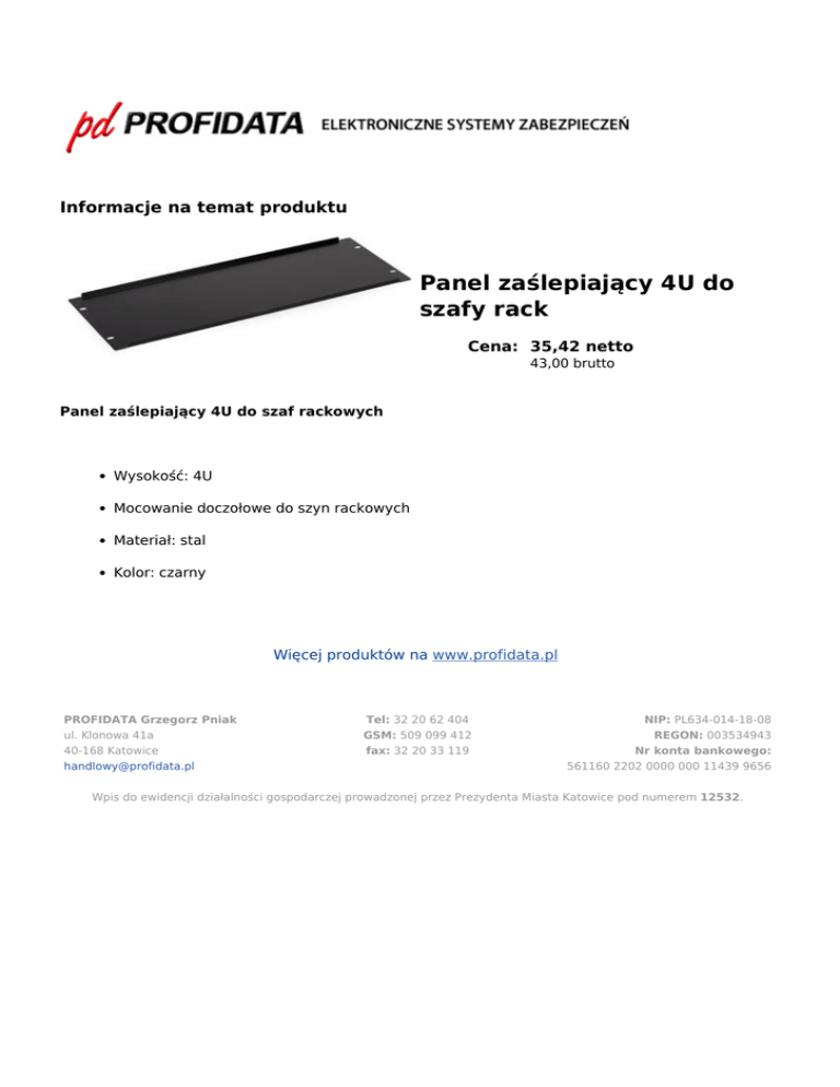 Informacje na temat produktu Panel zaślepiający 4U do szafy rack Cena: 35,42 netto 43,00 brutto Panel zaślepiający 4U do szaf rackowych Wysokość: 4U Mocowanie doczołowe do szyn rackowych Materiał: stal Kolor: czarny Więcej produktów na www.profidata.pl PROFIDATA Grzegorz Pniak ul. Klonowa 41a 40-168 Katowice [email protected] Tel: 32 20 62 404 GSM: 509 099 412 fax: 32 20 33 119 NIP: PL634-014-18-08 REGON: 003534943 Nr konta bankowego: 561160 2202 0000 000 11439 9656 Wpis do ewidencji działalności gospodarczej prowadzonej przez Prezydenta Miasta Katowice pod numerem 12532. Powered by TCPDF (www.tcpdf.org)