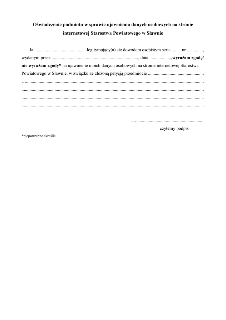 Oświadczenie podmiotu w sprawie ujawnienia danych osobowych na stronie internetowej Starostwa Powiatowego w Sławnie Ja,............................................. legitymujący(a) się dowodem osobistym seria......... nr .............., wydanym przez ............................................................................, dnia ...................,wyrażam zgodę/ nie wyrażam zgody* na ujawnienie moich danych osobowych na stronie internetowej Starostwa Powiatowego w Sławnie, w związku ze złożoną petycją przedmiocie ................................................. …............................................................................................................................................................ ................................................................................................................................................................ ................................................................................................................................................................ ................................................................................................................................................................ …............................................................. czytelny podpis *niepotrzebne skreślić