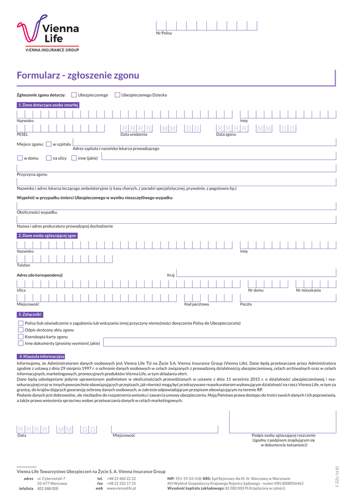 Nr Polisy Formularz - zgłoszenie zgonu Zgłoszenie zgonu dotyczy: £ Ubezpieczonego £ Ubezpieczonego Dziecka 1. Dane dotyczące osoby zmarłej Nazwisko Imię Data zgonu Data urodzenia PESEL Miejsce zgonu: £ w szpitalu Adres szpitala i nazwisko lekarza prowadzącego £ w domu £ na ulicy £ inne (jakie) Przyczyna zgonu Nazwisko i adres lekarza leczącego ambulatoryjnie (z kasy chorych, z poradni specjalistycznej, prywatnie, z pogotowia itp.) Wypełnić w przypadku śmierci Ubezpieczonego w wyniku nieszczęśliwego wypadku Okoliczności wypadku Nazwa i adres prokuratury prowadzącej dochodzenie 2. Dane osoby zgłaszającej zgon Nazwisko Imię Telefon Kraj Adres zdo korespondencji Ulica Nr domu Kod pocztowy Miejscowość Nr mieszkania Poczta 3. Załączniki £ Polisa (lub oświadczenie o zagubieniu lub wskazaniu innej przyczyny niemożności doręczenia Polisy do Ubezpieczyciela) £ Odpis skrócony aktu zgonu £ Kserokopia karty zgonu £ Inne dokumenty (prosimy wymienić jakie) 4. Klauzula informacyjna Klauzula informacyjna Informujemy, że Administratorem danych osobowych jest Vienna Life TU na Życie S.A. Vienna Insurance Group (Vienna Life). Dane będą przetwarzane przez Administratora zgodnie z ustawą z dnia 29 sierpnia 1997 r. o ochronie danych osobowych w celach związanych z prowadzoną działalnością ubezpieczeniową, celach archiwalnych oraz w celach informacyjnych, marketingowych, promocyjnych produktów Vienna Life, w tym składania ofert. Dane będą udostępniane jedynie uprawnionym podmiotom w okolicznościach przewidzianych w ustawie z dnia 11 września 2015 r. o działalności ubezpieczeniowej i reasekuracyjnej oraz w innych powszechnie obowiązujących przepisach, jak również mogą być przekazywane reasekuratorom wykonującym działalność na rzecz Vienna Life, w tym za granicę, do krajów dających gwarancję ochrony danych osobowych, w zakresie odpowiadającym przepisom obowiązującym na terenie RP. Podanie danych jest dobrowolne, ale niezbędne do rozpatrzenia wniosku i zawarcia umowy ubezpieczenia. Mają Państwo prawo dostępu do treści swoich danych i ich poprawiania, a także prawo wniesienia sprzeciwu wobec przetwarzania danych w celach marketingowych. Miejscowość Podpis osoby zgłaszającej roszczenie (zgodny z podpisem znajdującym się w dokumencie tożsamości) Vienna Life Towarzystwo Ubezpieczeń na Życie S. A. Vienna Insurance Group adres infolinia ul. Cybernetyki 7 02-677 Warszawa 801 888 000 tel. fax web +48 22 460 22 22 +48 22 332 17 55 www.viennalife.pl NIP: 951-19-33-418; KRS: Sąd Rejonowy dla M. St. Warszawy w Warszawie XIII Wydział Gospodarczy Krajowego Rejestru Sądowego - numer KRS 0000056463 Wysokość kapitału zakładowego: 82 000 000 PLN (opłacony w całości) F-ZZU-1610 Data