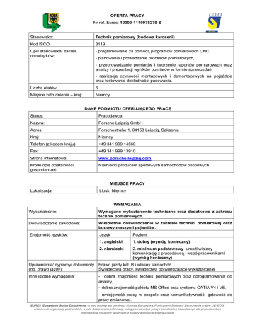 OFERTA PRACY Nr ref. Eures: 10000-1110978279-S Stanowisko: Technik pomiarowy (budowa karoserii) Kod ISCO: 3119 Opis stanowiska/ zakres obowiązków: - programowanie za pomocą programów pomiarowych CNC, - planowanie i prowadzenie procesów pomiarowych, - przeprowadzanie pomiarów i tworzenie raportów pomiarowych oraz analizy i prezentacji wyników pomiarów w formie sprawozdań, - realizacja czynności montażowych i demontażowych na pojeździe oraz testowanie dokładności pasowania. Liczba etatów: 5 Miejsce zatrudnienia – kraj: Niemcy DANE PODMIOTU OFERUJĄCEGO PRACĘ Status: Pracodawca Nazwa: Porsche Leipzig GmbH Adres: Porschestraße 1, 04158 Leipzig, Saksonia Kraj: Niemcy Telefon (z kodem kraju): +49 341 999 14560 Fax: +49 341 999 13910 Strona internetowa: www.porsche-leipzig.com Krótki opis działalności gospodarczej: Niemiecki producent sportowych samochodów osobowych. MIEJSCE PRACY Lokalizacja: Lipsk, Niemcy WYMAGANIA Wykształcenie: Wymagane wykształcenie techniczne oraz dodatkowe z zakresu technik pomiarowych. Doświadczenie zawodowe: Wieloletnie doświadczenie w zakresie techniki pomiarowej oraz budowy maszyn i pojazdów. Znajomość języków: Język Poziom 1. angielski 1. dobry (wymóg konieczny) 2. niemiecki 2. minimum podstawowy- umożliwiający komunikację z pracodawcą i współpracownikami (wymóg konieczny) Uprawnienia/ dyplomy/ dokumenty (np. prawo jazdy): Prawo jazdy kat. B i własny samochód Świadectwa pracy, świadectwa potwierdzające wykształcenie Inne istotne wymagania: - dobra znajomość technik pomiarowych oraz oprogramowania do analizy, - dobra znajomość pakietu MS Office oraz systemu CATIA V4 i V5, - umiejętność pracy w zespole oraz komunikatywność, gotowość do pracy zmianowej. EURES (Europejskie Służby Zatrudnienia) to sieć współpracy pomiędzy Komisją Europejską, Publicznymi Służbami Zatrudnienia krajów UE/ EOG oraz innych organizacji partnerskich, w celu dostarczania informacji, usług pośrednictwa pracy i poradnictwa zawodowego dla pracodawców i pracowników chcących skorzystać z zasady wolnego przepływu osób WYNAGRODZENIE I WARUNKI ZATRUDNIENIA Wysokość pensji brutto: 50 000 – 55 000 Euro brutto Waluta, w jakiej wypłacana jest pensja: Euro Rodzaj stawki wynagrodzenia: Roczna Premie: --- Dodatkowe świadczenia: Pracodawca pomaga w znalezieniu zakwaterowania. Koszty wynajmu ponosi pracownik. Nazwa firmy, z którą zostanie podpisana umowa: Porsche Leipzig GmbH Rodzaj umowy: Umowa o pracę Wymiar czasu pracy Pełen etat Czas trwania umowy: Na czas nieokreślony Liczba godzin tygodniowo: 38-40 Zmiany i praca w dni wolne: Praca zmianowa Data rozpoczęcia: Od zaraz SPOSÓB SKŁADANIA WNIOSKU Wymagane dokumenty: CV, list motywacyjny - tylko w j. niemieckim lub angielskim, świadectwa (w j. polskim - jeśli są ). Język, w którym muszą być sporządzone przedkładane dokumenty: Niemiecki lub angielski Do kogo należy wysłać dokumenty: Do Asystenta Eures – Joanna Szałęga Gdzie należy wysłać dokumenty: Na adres e-mail: [email protected] w tytule: ”Technik pomiarowy” lub pocztą tradycyjną na adres: Joanna Szałęga Dolnośląski Wojewódzki Urząd Pracy Al. Armii Krajowej 54 50-541 Wrocław z dopiskiem: „Technik pomiarowy” DODATKOWE INFORMACJE Rozmowy rekrutacyjne odbędą się 23.05.2014 r. we Wrocławiu podczas Targów Pracy i Informacji o Mobilności. Osoby zakwalifikowane do rozmów zostaną poinformowane o dokładnym miejscu i godzinie spotkania. WAŻNOŚĆ Data publikacji: 20.03.2014 Termin przedkładania podań o pracę / zakończenia ważności oferty: Do odwołania UWAGA: 1. Umowa z zagranicznym pracodawcą zostanie zawarta zgodnie z prawem kraju zatrudnienia. Oznacza to, że wszystkie roszczenia odnośnie do warunków, które obejmuje umowa, można kierować wyłącznie do odpowiedniego sądu w kraju EURES (Europejskie Służby Zatrudnienia) to sieć współpracy pomiędzy Komisją Europejską, Publicznymi Służbami Zatrudnienia krajów UE/ EOG oraz innych organizacji partnerskich, w celu dostarczania informacji, usług pośrednictwa pracy i poradnictwa zawodowego dla pracodawców i pracowników chcących skorzystać z zasady wolnego przepływu osób zatrudnienia. Publiczne służby zatrudnienia (EURES) nie mogą pośredniczyć ani reprezentować pracownika w sądzie kraju zatrudnienia w przypadku sporu z pracodawcą. 2. Publiczne służby zatrudnienia (EURES) dokładają wszelkich starań, aby zapewnić rzetelność i wiarygodność ofert pracy zgłoszonych w lokalnym urzędzie pracy. Należy wyjaśnić, że oferta pracy została zgłoszona przez stronę trzecią i EURES nie odpowiada za ewentualne rozbieżności między warunkami pracy określonymi w ofercie pracy i warunkami oferowanymi przez potencjalnego pracodawcę. 3. Publiczne służby zatrudnienia (EURES) informują, że będą zbierać, przetwarzać i przekazywać potencjalnym pracodawcom zgodnie z przepisami dotyczącymi ochrony danych osobowych wszystkie dane osobowe dostarczone przez osoby poszukujące pracy. EURES (Europejskie Służby Zatrudnienia) to sieć współpracy pomiędzy Komisją Europejską, Publicznymi Służbami Zatrudnienia krajów UE/ EOG oraz innych organizacji partnerskich, w celu dostarczania informacji, usług pośrednictwa pracy i poradnictwa zawodowego dla pracodawców i pracowników chcących skorzystać z zasady wolnego przepływu osób