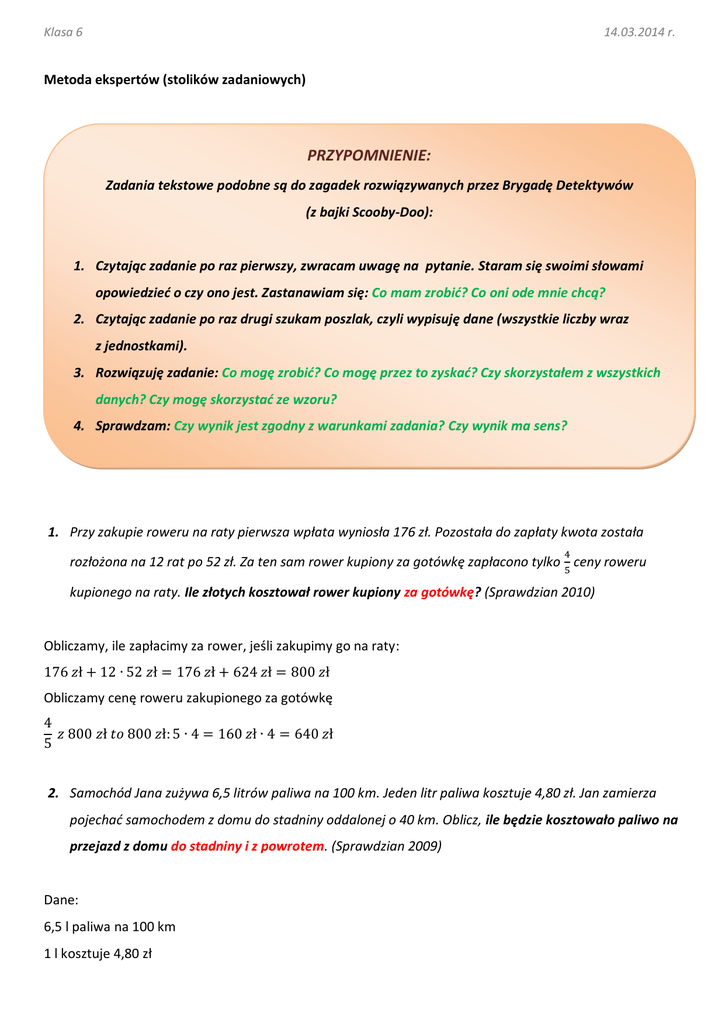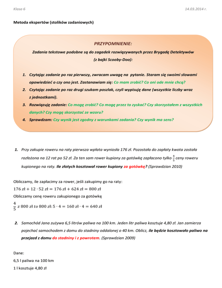 Klasa 6 14.03.2014 r. Metoda ekspertów (stolików zadaniowych) PRZYPOMNIENIE: Zadania tekstowe podobne są do zagadek rozwiązywanych przez Brygadę Detektywów (z bajki Scooby-Doo): 1. Czytając zadanie po raz pierwszy, zwracam uwagę na pytanie. Staram się swoimi słowami opowiedzieć o czy ono jest. Zastanawiam się: Co mam zrobić? Co oni ode mnie chcą? 2. Czytając zadanie po raz drugi szukam poszlak, czyli wypisuję dane (wszystkie liczby wraz z jednostkami). 3. Rozwiązuję zadanie: Co mogę zrobić? Co mogę przez to zyskać? Czy skorzystałem z wszystkich danych? Czy mogę skorzystać ze wzoru? 4. Sprawdzam: Czy wynik jest zgodny z warunkami zadania? Czy wynik ma sens? 1. Przy zakupie roweru na raty pierwsza wpłata wyniosła 176 zł. Pozostała do zapłaty kwota została rozłożona na 12 rat po 52 zł. Za ten sam rower kupiony za gotówkę zapłacono tylko ceny roweru kupionego na raty. Ile złotych kosztował rower kupiony za gotówkę? (Sprawdzian 2010) Obliczamy, ile zapłacimy za rower, jeśli zakupimy go na raty: Obliczamy cenę roweru zakupionego za gotówkę 2. Samochód Jana zużywa 6,5 litrów paliwa na 100 km. Jeden litr paliwa kosztuje 4,80 zł. Jan zamierza pojechać samochodem z domu do stadniny oddalonej o 40 km. Oblicz, ile będzie kosztowało paliwo na przejazd z domu do stadniny i z powrotem. (Sprawdzian 2009) Dane: 6,5 l paliwa na 100 km 1 l kosztuje 4,80 zł Klasa 6 14.03.2014 r. Obliczamy drogę jaką ma przejechać pan Jan: Sposób I: Skoro samochód pali 6,5 l na 100 km, to na przejechanie 10 km potrzebuje 0,65 l paliwa (bo, gdy dzielimy przez 10, przesuwamy przecinek o jedno miejsce w prawo). 10 km 0,65 zł 0,65 zł 0,65 zł 0,65 zł 0,65 zł 0,65 zł 0,65 zł 0,65 zł 0,65 zł 0,65 zł Zatem pan Jan spali 5,2 l paliwa. Zatem za paliwo zapłaci (koszt = cena * ilość) Sposób II (proporcje) litry km 6,5 ---------- 100 x ---------- 80 Mnożymy liczby, które stoją naprzeciw siebie, a dzielimy przez liczbę naprzeciw x. (l) Zatem pan Jan spali 5,2 l paliwa. Zatem za paliwo zapłaci (koszt = cena * ilość) 3. Klasa VI miała 5 lekcji, po 45 minut każda. Ile czasu upłynęło od rozpoczęcia pierwszej lekcji do końca piątej, jeśli jedna przerwa była 15-minutowa, a pozostałe 10-minutowe? (Sprawdzian 2007) 45 min 10 min 45 min 10 min 45 min 15 min 45 min 10 min 45 min 4. Magda ma 56 zł oszczędności, a Basia 20 zł. Dziewczynki postanowiły nadal oszczędzać. Magda będzie odkładać po 9 zł miesięcznie. Po ile złotych powinna odkładać co miesiąc Basia, aby po 8 miesiącach mieć tyle samo pieniędzy, ile Magda? (Sprawdzian 2011) Klasa 6 Co wiemy? Magda: 56 zł Basia: 20 zł Co możemy obliczyć? Magda po ośmiu miesiącach: Ile będzie brakowało Basi do Madzi po 8 miesiącach? Ile Basia musi oszczędzać, jeśli chce mieć po 8 miesiącach tyle samo pieniędzy co Magda? 14.03.2014 r.