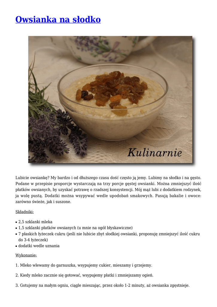 Owsianka na słodko Lubicie owsiankę? My bardzo i od dłuższego czasu dość często ją jemy. Lubimy na słodko i na gęsto. Podane w przepisie proporcje wystarczają na trzy porcje gęstej owsianki. Można zmniejszyć ilość płatków owsianych, by uzyskać potrawę o rzadszej konsystencji. Mój mąż lubi z dodatkiem rodzynek, ja wolę pustą. Dodatki można wsypywać wedle upodobań smakowych. Pasują bakalie i owoce: zarówno świeże, jak i suszone. Składniki: ■ ■ ■ ■ 2,5 szklanki mleka 1,5 szklanki płatków owsianych (u mnie na ogół błyskawiczne) 7 płaskich łyżeczek cukru (jeśli nie lubicie zbyt słodkiej owsianki, proponuję zmniejszyć ilość cukru do 3-4 łyżeczek) dodatki wedle uznania Wykonanie: 1. Mleko wlewamy do garnuszka, wsypujemy cukier, mieszamy i grzejemy. 2. Kiedy mleko zacznie się gotować, wsypujemy płatki i zmniejszamy ogień. 3. Gotujemy na małym ogniu, ciągle mieszając, przez około 1-2 minuty, aż owsianka zgęstnieje. 4. Przelewamy owsiankę do miseczek, dodajemy owoce.