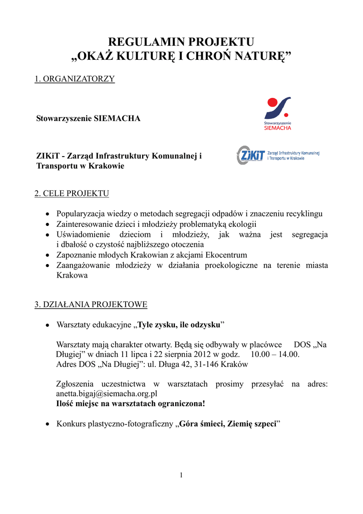 REGULAMIN PROJEKTU „OKAŻ KULTURĘ I CHROŃ NATURĘ” 1. ORGANIZATORZY Stowarzyszenie SIEMACHA ZIKiT - Zarząd Infrastruktury Komunalnej i Transportu w Krakowie 2. CELE PROJEKTU Popularyzacja wiedzy o metodach segregacji odpadów i znaczeniu recyklingu Zainteresowanie dzieci i młodzieży problematyką ekologii Uświadomienie dzieciom i młodzieży, jak ważna jest segregacja i dbałość o czystość najbliższego otoczenia Zapoznanie młodych Krakowian z akcjami Ekocentrum Zaangażowanie młodzieży w działania proekologiczne na terenie miasta Krakowa 3. DZIAŁANIA PROJEKTOWE Warsztaty edukacyjne „Tyle zysku, ile odzysku” Warsztaty mają charakter otwarty. Będą się odbywały w placówce DOS „Na Długiej” w dniach 11 lipca i 22 sierpnia 2012 w godz. 10.00 – 14.00. Adres DOS „Na Długiej”: ul. Długa 42, 31-146 Kraków Zgłoszenia uczestnictwa w warsztatach prosimy przesyłać na adres: [email protected] Ilość miejsc na warsztatach ograniczona! Konkurs plastyczno-fotograficzny „Góra śmieci, Ziemię szpeci” 1 4. REGULAMIN KONKURSU PLASTYCZNEGO „GÓRA ŚMIECI, ZIEMIĘ SZPECI” Konkurs trwa od 25 czerwca do 30 sierpnia 2012 roku Konkurs skierowany jest do uczniów szkół krakowskich oraz wychowanków Stowarzyszenia SIEMACHA w wieku od 7 do 18 lat W ramach konkursu dopuszcza się zgłaszanie prac plastycznych i fotograficznych Tematyka prac plastycznych i fotograficznych powinna dotyczyć szeroko pojętej tematyki ekologicznej ze szczególnym uwzględnieniem segregacji odpadów i dbania o przestrzeń publiczną w naszym najbliższym otoczeniu Prace plastyczne: technika wykonania: dowolna (rysunek kredkami, tuszem, węglem, collage, witraż, inne) format prac: nie mniejsze niż A4 i nie większe niż A3 Prace fotograficzne: format prac: plik cyfrowy w formacie jpg lub rav Sposób przekazania prac: Prace plastyczne: złożone osobiście lub przesłane listownie na adres: Stowarzyszenia SIEMACHA ul. Długa 42, 31-146 Kraków z dopiskiem „Góra śmieci, Ziemię szpeci” Prace fotograficzne: płyta CD złożona osobiście lub przesłana listownie na adres: Stowarzyszenia SIEMACHA ul. Długa 42, 31-146 Kraków z dopiskiem „Góra śmieci, Ziemię szpeci” e-mailem na adres: [email protected] Każda praca powinna zostać przekazana wraz z informacjami: Imię i nazwisko autora Rok urodzenia autora Adres kontaktowy Telefon kontaktowy Nazwa i numer szkoły oraz klasa albo nazwa ośrodka SIEMACHY Organizatorzy Konkursu nie zwracają przesłanych prac Prace, które nie spełniają określonych powyżej wymogów formalnych mogą nie zostać poddane ocenie przez Jury Konkursu. W skład Jury Konkursu oceniającego prace wchodzi: 2 przedstawicieli Stowarzyszenia SIEMACHA 2 przedstawicieli ZIKiT w Krakowie Jury Konkursu wybierze 2 najlepsze prace fotograficzne oraz 3 najlepsze prace plastyczne 2 Wyniki Konkursu zostaną ogłoszone w dniu 14 września 2012 roku o godz. 16 w trakcie happeningu na Małym Rynku w Krakowie. Rozdanie nagród nastąpi po ogłoszeniu wyników. Nagrody dla prac fotograficznych: I miejsce – akcesoria fotograficzne o wartości 700 zł II miejsce – akcesoria fotograficzne o wartości 500 zł Nagrody dla prac plastycznych: I miejsce – akcesoria plastyczne o wartości 200 zł II miejsce – akcesoria plastyczne o wartości 120 zł III miejsce – akcesoria plastyczne o wartości 80 zł W przypadku pytań dotyczących regulaminu prosimy o kontakt mailowy: [email protected] 3