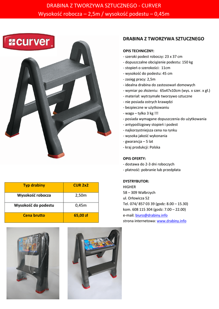 DRABINA Z TWORZYWA SZTUCZNEGO - CURVER Wysokośd robocza – 2,5m / wysokośd podestu – 0,45m DRABINA Z TWORZYWA SZTUCZNEGO OPIS TECHNICZNY: - szeroki podest roboczy: 23 x 37 cm - dopuszczalne obciążenie podestu: 150 kg - stopieo o szerokości: 11cm - wysokośd do podestu: 45 cm - zasięg pracy: 2,5m - idealna drabina do zastosowao domowych - wymiar po złożeniu: 65x47x10cm (wys. x szer. x gł.) - materiał: wytrzymałe tworzywo sztuczne - nie posiada ostrych krawędzi - bezpieczne w użytkowaniu - waga – tylko 3 kg !!! - posiada wymagane dopuszczenia do użytkowania - antypoślizgowy stopieo i podest - najkorzystniejsza cena na rynku - wysoka jakośd wykonania - gwarancja – 5 lat - kraj produkcji: Polska OPIS OFERTY: - dostawa do 2-3 dni roboczych - płatnośd: pobranie lub przedpłata Typ drabiny CUR 2x2 Wysokośd robocza 2,50m Wysokośd do podestu 0,45m Cena brutto 65,00 zł DYSTRYBUTOR: HIGHER 58 – 309 Wałbrzych ul. Orłowicza 52 Tel. 074/ 857 03 39 (godz: 8.00 – 15.30) kom. 608 115 304 (godz: 7.00 – 22.00) e-mail: [email protected] strona internetowa: www.drabiny.info