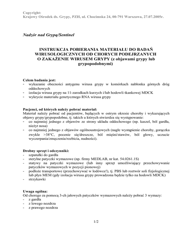 Copyright: Krajowy Ośrodek ds. Grypy, PZH, ul. Chocimska 24, 00-791 Warszawa, 27.07.2005r. Nadzór nad Grypą/Sentinel INSTRUKCJA POBIERANIA MATERIAŁU DO BADAŃ WIRUSOLOGICZNYCH OD CHORYCH PODEJRZANYCH O ZAKAŻENIE WIRUSEM GRYPY (z objawami grypy lub grypopodobnymi) Celem badania jest: - wykazanie obecności antygenu wirusa grypy w komórkach nabłonka górnych dróg oddechowych - izolacja wirusa grypy na 11-zarodkach kurzych i/lub hodowli tkankowej MDCK - wykrycie materiału genetycznego RNA wirusa grypy Pacjenci, od których należy pobrać materiał: Materiał należy pobrać od pacjentów, będących w ostrym okresie choroby i wykazujących objawy grypy/grypopodobne, tj. takich u których stwierdza się występowanie: - co najmniej jednego z objawów ze strony układu oddechowego (np. kaszel, ból gardła, nieżyt nosa) - co najmniej jednego z objawów ogólnoustrojowych (nagłe wystąpienie choroby, gorączka zwykle >38C, pocenie się/dreszcze, ból mięśni/stawów, ból głowy, uczucie wyczerpania/zmęczenia/rozbicia, nudności). Drobny sprzęt i odczynniki: - szpatułki do gardła - sterylne patyczki wymazowe (np. firmy MEDLAB, nr kat. 54.0261.1S) - statywy na patyczki wymazowe (lub inny sprzęt umożliwiający przechowywanie patyczków wymazowych w pozycji pionowej) - podłoże transportowe (przechowywać w lodówce!), tj. PBS lub roztwór soli fizjologicznej lub płyn MEM (gdy izolacja wirusa grypy prowadzona będzie tylko na hodowli MDCK) - strzykawki Uwaga ogólna: Od chorego za pomocą 3-ch jałowych patyczków wymazowych należy pobrać 3 wymazy: - z gardła - z lewego nozdrza - z prawego nozdrza 1/2 Copyright: Krajowy Ośrodek ds. Grypy, PZH, ul. Chocimska 24, 00-791 Warszawa, 27.07.2005r. POBRANIE WYMAZU Z GARDŁA: - - - należy poprosić pacjenta o szerokie otwarcie jamy ustnej używając szpatułki docisnąć język ku dołowi, co pozwoli uniknąć kontaminacji wymazu śliną za pomocą sterylnego patyczka wymazowego, wyjętego z probówki transportowej, energicznie potrzeć obie powierzchnie migdałków oraz tylną ścianę gardła (bez dotykania powierzchni jamy ustnej) zwracając szczególną uwagę na miejsca zapalnie zmienione patyczek wymazowy z pobranym materiałem umieścić w probówce transportowej (bez dotykania wacikiem jej ścianek), z którą został on dostarczony do próbówki nanieść za pomocą strzykawki maksymalnie 1,5 ml podłoża transportowego, tj. PBS lub soli fizjologicznej lub płynu MEM (UWAGA! – nie otwierać całkowicie butelki z podłożem transportowym, lecz przekłuć igłą strzykawki gumowy korek i w ten sposób nabierać płyn, by ograniczyć możliwość kontaminacji podłoża transportowego) probówkę zakręcić i podpisać (nazwisko pacjenta, data pobrania wymazu) POBRANIE WYMAZU Z NOSA (z obu nozdrzy): - - należy upewnić się czy przed pobraniem materiału pacjent nie wydmuchiwał nosa w celu pobrania wymazu należy delikatnie odchylić głowę pacjenta do tyłu i przytrzymać za podbródek drugą ręką umieścić koniec sterylnego (nowego) patyczka wymazowego w prawym nozdrzu pacjenta wymaz powinien być pobrany energicznie, aby mieć pewność, iż zawiera on zarówno komórki, jak i śluz z wnętrza nozdrza koniec patyczka wymazowego (ten tuż przy zakrętce) odłamać lub uciąć nożyczkami patyczek wymazowy z pobranym materiałem umieścić następnie w probówce, w której jest już wymaz z gardła (bez dotykania wacikiem jej ścianek) probówkę zakręcić wg tej samej procedury za pomocą nowego sterylnego patyczka wymazowego należy pobrać wymaz z lewego nozdrza i umieścić ten patyczek w probówce, w której znajduje się już wymaz z gardła i wymaz z prawego nozdrza (w jednej probówce znajdują się zatem trzy patyczki wymazowe) probówkę zakręcić do czasu transportu probówkę z wymazami umieścić w pozycji pionowej w lodówce (nie zamrażać!) Transport pobranych wymazów: Wymazy należy jak najszybciej, tj. najpóźniej w ciągu 24h od momentu pobrania, przesłać (w pozycji pionowej!) wraz z wypełnionym formularzem „DANE PACJENTA” do odpowiedniej WSSE (lub Krajowego Ośrodka ds. Grypy w PZH), przy zapewnieniu podczas transportu temperatury lodówki. 2/2