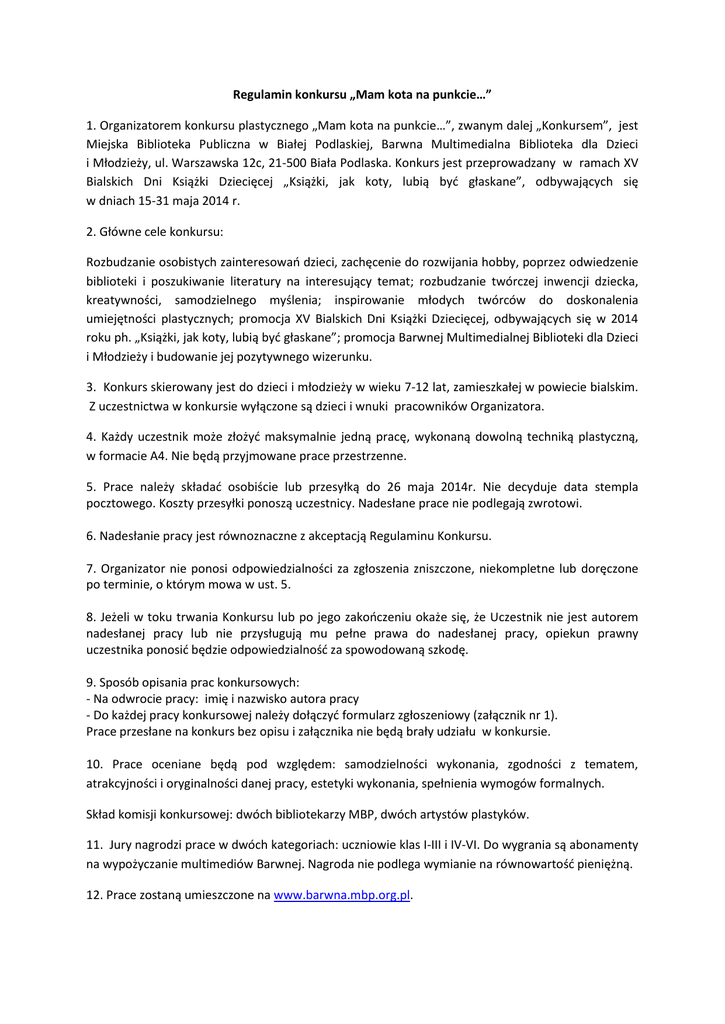 Regulamin konkursu „Mam kota na punkcie…” 1. Organizatorem konkursu plastycznego „Mam kota na punkcie…”, zwanym dalej „Konkursem”, jest Miejska Biblioteka Publiczna w Białej Podlaskiej, Barwna Multimedialna Biblioteka dla Dzieci i Młodzieży, ul. Warszawska 12c, 21-500 Biała Podlaska. Konkurs jest przeprowadzany w ramach XV Bialskich Dni Książki Dziecięcej „Książki, jak koty, lubią być głaskane”, odbywających się w dniach 15-31 maja 2014 r. 2. Główne cele konkursu: Rozbudzanie osobistych zainteresowań dzieci, zachęcenie do rozwijania hobby, poprzez odwiedzenie biblioteki i poszukiwanie literatury na interesujący temat; rozbudzanie twórczej inwencji dziecka, kreatywności, samodzielnego myślenia; inspirowanie młodych twórców do doskonalenia umiejętności plastycznych; promocja XV Bialskich Dni Książki Dziecięcej, odbywających się w 2014 roku ph. „Książki, jak koty, lubią być głaskane”; promocja Barwnej Multimedialnej Biblioteki dla Dzieci i Młodzieży i budowanie jej pozytywnego wizerunku. 3. Konkurs skierowany jest do dzieci i młodzieży w wieku 7-12 lat, zamieszkałej w powiecie bialskim. Z uczestnictwa w konkursie wyłączone są dzieci i wnuki pracowników Organizatora. 4. Każdy uczestnik może złożyć maksymalnie jedną pracę, wykonaną dowolną techniką plastyczną, w formacie A4. Nie będą przyjmowane prace przestrzenne. 5. Prace należy składać osobiście lub przesyłką do 26 maja 2014r. Nie decyduje data stempla pocztowego. Koszty przesyłki ponoszą uczestnicy. Nadesłane prace nie podlegają zwrotowi. 6. Nadesłanie pracy jest równoznaczne z akceptacją Regulaminu Konkursu. 7. Organizator nie ponosi odpowiedzialności za zgłoszenia zniszczone, niekompletne lub doręczone po terminie, o którym mowa w ust. 5. 8. Jeżeli w toku trwania Konkursu lub po jego zakończeniu okaże się, że Uczestnik nie jest autorem nadesłanej pracy lub nie przysługują mu pełne prawa do nadesłanej pracy, opiekun prawny uczestnika ponosić będzie odpowiedzialność za spowodowaną szkodę. 9. Sposób opisania prac konkursowych: - Na odwrocie pracy: imię i nazwisko autora pracy - Do każdej pracy konkursowej należy dołączyć formularz zgłoszeniowy (załącznik nr 1). Prace przesłane na konkurs bez opisu i załącznika nie będą brały udziału w konkursie. 10. Prace oceniane będą pod względem: samodzielności wykonania, zgodności z tematem, atrakcyjności i oryginalności danej pracy, estetyki wykonania, spełnienia wymogów formalnych. Skład komisji konkursowej: dwóch bibliotekarzy MBP, dwóch artystów plastyków. 11. Jury nagrodzi prace w dwóch kategoriach: uczniowie klas I-III i IV-VI. Do wygrania są abonamenty na wypożyczanie multimediów Barwnej. Nagroda nie podlega wymianie na równowartość pieniężną. 12. Prace zostaną umieszczone na www.barwna.mbp.org.pl. 13. Ogłoszenie wyników konkursu nastąpi 30.05.2014r. o godz. 17.00. Lista laureatów zostanie opublikowana na stronie internetowej Organizatora. 14. Przekazanie prac konkursowych jest równoznaczne z: - udzieleniem Organizatorowi zgody na nieodpłatne wykorzystanie w/w prac bezterminowo, bez żadnych ograniczeń terytorialnych na wszystkich polach eksploatacji, o których mowa w art. 50 Ustawy z dnia 4 lutego 1994 roku o prawie autorskim i prawach pokrewnych (Dz. U. Z 2000r., Nr 80, poz. 904 z późniejszymi zmianami). - zrzeczeniem się praw autorskich do swoich prac na rzecz Organizatora Konkursu. Organizator nie bierze na siebie odpowiedzialności za niezgodne z prawem wykorzystanie przez Uczestników złożonej pracy konkursowej cudzej własności intelektualnej. 15. Regulamin Konkursu oraz załącznik są dostępne na: www.barwna.mbp.org.pl Szczegółowych informacji na temat konkursu udziela Barwna Multimedialna Biblioteka dla Dzieci i Młodzieży tel. 83 341 64 53, 83 341 60 18, e-mail: [email protected] 16. Organizator Konkursu zastrzega sobie prawo do zmiany czasu trwania Konkursu i warunków udziału w Konkursie oraz do jego odwołania bez podania przyczyny. 17. W sprawach nieuregulowanych w niniejszym Regulaminie rozstrzyga Organizator. 28. Nadesłanie prac na Konkurs oznacza akceptację jego warunków, wyrażonych w niniejszym Regulaminie.