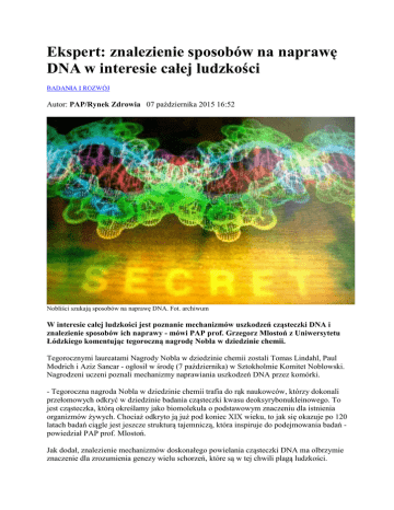Ekspert: znalezienie sposobów na naprawę DNA w interesie całej ludzkości BADANIA I ROZWÓJ Autor: PAP/Rynek Zdrowia 07 października 2015 16:52 Nobliści szukają sposobów na naprawę DNA. Fot. archiwum W interesie całej ludzkości jest poznanie mechanizmów uszkodzeń cząsteczki DNA i znalezienie sposobów ich naprawy - mówi PAP prof. Grzegorz Mlostoń z Uniwersytetu Łódzkiego komentując tegoroczną nagrodę Nobla w dziedzinie chemii. Tegorocznymi laureatami Nagrody Nobla w dziedzinie chemii zostali Tomas Lindahl, Paul Modrich i Aziz Sancar - ogłosił w środę (7 października) w Sztokholmie Komitet Noblowski. Nagrodzeni uczeni poznali mechanizmy naprawiania uszkodzeń DNA przez komórki. - Tegoroczna nagroda Nobla w dziedzinie chemii trafia do rąk naukowców, którzy dokonali przełomowych odkryć w dziedzinie badania cząsteczki kwasu deoksyrybonukleinowego. To jest cząsteczka, którą określamy jako biomolekuła o podstawowym znaczeniu dla istnienia organizmów żywych. Chociaż odkryto ją już pod koniec XIX wieku, to jak się okazuje po 120 latach badań ciągle jest jeszcze strukturą tajemniczą, która inspiruje do podejmowania badań powiedział PAP prof. Mlostoń. Jak dodał, znalezienie mechanizmów doskonałego powielania cząsteczki DNA ma olbrzymie znaczenie dla zrozumienia genezy wielu schorzeń, które są w tej chwili plagą ludzkości. - Ci trzej naukowcy dokonali odkryć w trzech obszarach poznawania cząsteczki DNA. Chodzi zarówno o stwierdzenie tego, że jest ona strukturą bardzo nietrwałą i nawet w warunkach fizjologicznych ulega degradacji. Stąd też, chociaż ma sama doskonale wykształcony mechanizm naprawy uszkodzeń, to jednak w interesie całej ludzkości jest poznanie mechanizmów uszkodzeń, ich powstawania i znalezienie sposobów ich naprawy - dodał ekspert. Jak tłumaczył, tegoroczni laureaci nagrody Nobla ustalili, że naprawy uszkodzonej cząsteczki DNA można dokonywać zarówno metodami biochemicznymi, jak i fotochemicznymi, przy użyciu światła. - Jest to olbrzymie osiągnięcie, które bardzo daleko posuwa do przodu naukę w dziedzinie terapii, poszukiwania metod zwalczania wielu powszechnych chorób mających swoje podłoże w uszkodzeniu struktury cząsteczki DNA - podkreślił. Komórki stale się dzielą, ponieważ muszą być wymieniane, a podczas tych podziałów powstają błędy w DNA. Komórki narażone są również na uszkodzenia materiału genetycznego pod wpływem czynników środowiskowych. W każdej z nich codziennie powstaje wiele tysięcy takich zaburzeń. Dlatego stosowane są w nich skomplikowane mechanizmu naprawcze, inaczej w organizmie powstawałyby błędy uniemożliwiające jego sprawne funkcjonowanie. Badania nad mechanizmami naprawczymi nie tylko dostarczyły fundamentalnej wiedzy na temat funkcjonowania komórek i wyjaśniły podłoże rzadkich chorób genetycznych, ale mogą też posłużyć do udoskonalenia terapii przeciwnowotworowych. Obecnie wykorzystywane radioterapia i chemioterapia unieczynniają mechanizmy naprawy DNA w szybko dzielących się komórkach nowotworu, co prowadzi do ich zniszczenia. Nasze DNA jest codziennie narażone na uszkodzenia spowodowane przez promieniowanie UV, wolne rodniki i inne czynniki rakotwórcze. Jednak nawet bez tych zewnętrznych czynników cząsteczka DNA jest niestabilna. Codziennie w genomie komórki zachodzą tysiące spontanicznych zmian w genomie komórki. Defekty mogą się również pojawić podczas podziału komórki, kiedy to DNA jest kopiowane. A w ludzkim organizmie codziennie dzielą się miliony komórek.