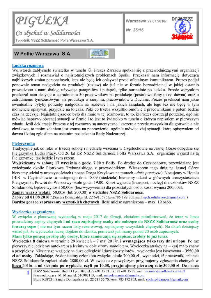 PIGUŁKA Co słychać w Solidarności Warszawa 29.07.2016r. Nr. 26/16 Tygodnik NSZZ Solidarność Polfa Warszawa S.A. W Polfie Warszawa S.A. Ludzka rozmowa We wtorek zabłysnęło światełko w tunelu . Prezes Zarządu spotkał się z przewodniczącymi organizacji związkowych i rozmawiał o najistotniejszych problemach Spółki. Przekazał nam informację dotyczącą najbliższych zmian personalnych, lecz nie będę ich opisywał przed oficjalnym komunikatem. Prezes podjął ponownie temat nadgodzin na produkcji (rozlew) ale już nie w formie beznadziejnej w jakiej ostatnio prowadzono z nami dialog, używając paragrafów i pułapek, tylko normalnie po ludzku. Przede wszystkim przekazał nam decyzje o zatrudnieniu 30 pracowników na produkcję (postulowaliśmy to od dawna) oraz o zatrudnieniu tymczasowym na produkcji w sierpniu, pracowników z Duchnic. Prezes przekazał nam jakie ewentualnie byłyby potrzeby nadgodzin na rozlewie i na jakich zasadach, ale tego też nie będę w tym momencie opisywał, przyjdzie na to czas. Póki co trzeba wszystko omówić z pracownikami a potem będzie czas na decyzje. Najistotniejsze co było dla mnie w tej rozmowie, to to, iż Prezes dostrzegł potrzebę, ogólnie mówiąc naprawy obecnej sytuacji w firmie i to jest to światełko w tunelu o którym napisałem w pierwszym zdaniu. Jeśli deklaracje Prezesa z tej rozmowy są autentyczne i szczere a przede wszystkim długotrwałe a nie chwilowe, to moim zdaniem jest szansa na poprawienie ogólnie mówiąc złej sytuacji, którą opisywałem od dawna i którą zgłosiłem na ostatnim posiedzeniu Rady Nadzorczej. Pielgrzymka Tradycyjnie jak co roku w trzecią sobotę i niedzielę września w Częstochowie na Jasnej Górze odbędzie się Pielgrzymka Ludzi Pracy. Od 26 lat KZ NSZZ Solidarność Polfa Warszawa S.A. organizuje wyjazd na tą Pielgrzymkę, tak będzie i tym razem. Wyjeżdżamy w sobotę 17 września o godz. 7.00 z Polfy. Po drodze do Częstochowy, przewidziane jest zwiedzanie okolic Piotrkowa Trybunalskiego z przewodnikiem. Wieczorem tego dnia na Jasnej Górze bierzemy udział w uroczystościach ( nocna Droga Krzyżowa na murach - duże przeżycie). Nocujemy w Hotelu IBIS w Częstochowie a następnego dnia 18.09 (niedziela) bierzemy udział w głównych uroczystościach Pielgrzymki. Powrót do Warszawy około godz. 19.00. Koszt wyjazdu (transport, nocleg) dla członków NSZZ Solidarność, będzie wynosił 50,00zł (bez wyżywienia) dla pozostałych osób, koszt wynosi 200,00zł. Zapisy wraz z wpłatą 50,00zł (lub 200,00) w siedzibie NSZZ Solidarność. Zapisy od 01.08 2016 r.(Sandra Domagalska tel. 22 6913575;kom:785 192 803;mail: [email protected] ) Bardzo gorąco zapraszamy wszystkich chętnych. Ilość miejsc ograniczona – max. 19 osób. Wycieczka zagraniczna W związku z planowaną wycieczką w maju 2017 do Gruzji, chciałem poinformować, że teraz w lipcu prowadzimy zapisy chętnych i od razu zapisujemy osoby nie należące do NSZZ Solidarność oraz osoby towarzyszące ( nie ma tym razem listy rezerwowej, zapisujemy wszystkich chętnych). Na dzień dzisiejszy widać już, że wycieczka raczej dojdzie do skutku, ponieważ już mamy ponad 20 osób zapisanych. Mam tylko gorącą prośbę aby osoby, które zamierzają się zapisać, zrobiły to już teraz. Wycieczka 8 dniowa w terminie 29 kwiecień – 7 maj 2017r. i wymagająca tylko trzy dni urlopu. Po raz pierwszy nie jedziemy autokarem a lecimy w obie strony samolotem. Wycieczka atrakcyjna – kraj mało znany a przepiękny. Niestety ze względy na dużą odległość i duże koszty lotów, wycieczka jest kosztowna – 3550,00 zł od osoby. Zakładając, że dopłacimy członkom związku około 700,00 zł , wychodzi, iż pracownik, członek NSZZ Solidarność zapłaci około 2800,00 zł. W związku z powyższym przyjmujemy zgłoszenia chętnych w lipcu 2016r. a od sierpnia po wypłacie, czyli po 10.08, przyjmujemy pierwszą ratę 300,00 zł. Do marca 1 NSZZ Solidarność: Bud. D I p.p109; tel.22 691 35 21; fax 22 691 35 22; mail: [email protected] Przewodniczący: M. Miara tel. 510992113; mail: [email protected] Biuro KSPCH: Sandra Domagalska tel. 22 691 35 75; kom: 785 192 803; mail: [email protected] 2017r. włącznie, co miesiąc wpłacamy po 300,00 zł co pozwoli każdemu uzbierać 2400,00 zł. W kwietniu zostałoby do dopłacenia około 400,00 zł. Reasumując od 15 lipca 2016r. rozpoczęliśmy zapisy w siedzibie NSZZ Solidarność (Sandra Domagalska tel. 22 691 35 75; kom: 785 192 803; mail: [email protected] ). Od sierpnia przyjmujemy pierwszą ratę 300,00 zł. Polfa II w budowie Po raz kolejny odwiedziłem budowę Polfy II, używam tej nazwy, bo przyjętą nazwę projektu „DuchCzasu” uważałem i uważam za idiotyczną ( nie mam tu na myśli autora, bo była dowolność, można było zgłosić każdą nawet najdziwniejszą nazwę) i tak jak pisałem swego czasu, zrobiono według mnie to tylko po to, żeby nie było w nazwie słowa Polfa, takie jest moje zdanie. Natomiast muszę przyznać uczciwie, że ta wizyta zrobiła na mnie bardzo duże wrażenie. Jak byłem ostatnio na budowie, to owszem ruch pracowników był ogromny, ale wykonywano wówczas prace na poziomie gruntu i nie robiło to żadnego wrażenia. Teraz zobaczyłem całe budynki a właściwie kompleks budynków i naprawdę zrobiło to na mnie duże wrażenie, widać powstającą dużą, ładną, nowoczesną firmę. Trzy spore budynki połączone z sobą specjalnymi łącznikami, tak aby można było się poruszać po całej fabryce bez wychodzenia z budynku, robią wrażenie, na mnie zrobiły. Odjeżdżając zauważyłem ponadto, że jakiś kilometr przed powstającą fabryką buduje się osiedle mieszkaniowe w którym teoretycznie mogą zamieszkać pracownicy Polfy II. Wszystko co napisałem do tej pory brzmi pięknie prawda, niestety odjechałem zasmucony, bo ilu tam będzie pracowało naszych pracowników ? Niestety mam tutaj osobiste przemyślenia, że to