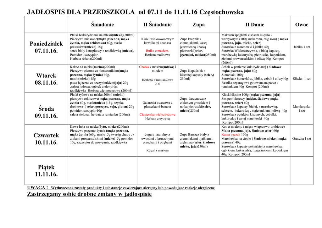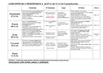 JADŁOSPIS DLA PRZEDSZKOLA od 07.11 do 11.11.16 Częstochowska Śniadanie Poniedziałek 07.11.16. Wtorek 08.11.16. Środa 09.11.16. Czwartek 10.11.16. Płatki Kukurydziane na mleku(mleko)(200ml) Pieczywo mieszane(mąka pszenna, mąka żytnia, mąka orkiszowa) 60g, masło prawdziwe(mleko) 15g, serek biały kanapkowy z rzodkiewką (mleko), Pomidor , szczypior, Herbata różana(200ml) Kakao na mleku(mleko)(200ml) Pieczywo ciemne ze słonecznikiem(mąka pszenna, mąka żytnia) 60g, masło(mleko) 15g pasta jajeczna ze szczypiorkiem(jaja) 20g ,sałata lodowa, ogórek zielony10g , rzodkiewka Herbata wieloowocowa (200ml) Płatki ryżowe na mleku 200ml (mleko) pieczywo orkiszowe(mąka pszenna, mąka żytnia 60g, masło(mleko )15g, szynka drobiowa ( seler, gorczyca, soja, gluten) 20g pomidor, szczypior10g sałata zielona, herbata z rumianku (200ml) Kawa Inka na mleku(żyto, mleko)(200ml) Pieczywo pszenno-żytnie (mąka pszenna, mąka żytnia )60g, masło15g twaróg chudy , z ziołami prowansalskimi (mleko)15g pomidor 10g, szczypior do posypania, rzodkiewka II Śniadanie Zupa Kisiel wieloowocowy z kawałkami ananasa Zupa krupnik z ziemniakami, kaszą jęczmienną i natką pietruszki(seler, jęczmień, mleko)(250ml) Bułka z masłem. Herbata malinowa Chałka z masłem(mleko) i miodem Herbata z rumiankowa 200 Galaretka owocowa z plasterkami banana Zupa Kapuśniak z kiszonej kapusty (seler,) 250ml) Zupa Jarzynowa z zielonym groszkiem i natką pietruszki(seler, mleko)250ml Ciasteczka wielozbożowe Herbata z cytryną Jogurt naturalny z owocami , kruszonymi orzechami i otrębami Zupa Barszcz biały z ziemniakami , jajkiem i zieleniną (seler, śladowo mleko, jaja)250ml) Rogal z masłem Piątek 11.11.16. UWAGA ! Wytłuszczone zostały produkty i substancje zawierające alergeny lub powodujące reakcje alergiczne Zastrzegamy sobie drobne zmiany w jadłospisie II Danie Makaron spaghetti z sosem mięsno warzywnym (100g makaronu, 60g sosu) ( mąka pszenna, jaja, mleko, seler) Surówka z marchewki i jabłka 40g Surówka Wielowarzywna, z białą kapustą, marchewką kukurydzą, pietruszką, koperkiem, ziołami prowansalskimi i oliwą 40g Kompot (200ml) Schab w panierce kukurydzianej ( śladowo mąka pszenna, jaja) 60g Ziemniaki 100g Surówka z buraczków, jabłka, cebuli i oliwy40g Fasolka szparagowa gotowana na parze z tymiankiem 40g Kompot (200ml) Kluski śląskie 100g (mąka pszenna, jaja) Sos pomidorowy (mleko, śladowo mąka pszenna, seler) 60g Surówka z kapusty białej, z marchewką, selerem, kukurydzą , majerankiem i oliwą 40g Surówka z ogórków kiszonych, cebulki, kukurydzy i tartej marchewki 40g Kompot 200ml Kotlet mielony ( mięso wieprzowo-drobiowe) Mąka pszenna, jaja, śladowo seler )60g Kasza pęczak 100g Marchewka na ciepło ( śladowo mleko i mąka pszenna) 40g Surówka z kapusty pekińskiej z marchewką, ogórkiem, kukurydzą, majerankiem i koperkiem 40g Kompot 200ml Owoc Jabłko 1 szt Śliwka 1 szt Mandarynka 1 szt Gruszka 1 szt JADŁOSPIS DLA PRZEDSZKOLA Śniadanie Poniedziałek 14.11.16. Wtorek 15.11.16. Środa 16.11.16. Czwartek 17.11.16. Płatki zbożowe na mleku(mleko)(200ml) Pieczywo mieszane(mąka pszenna, mąka żytnia, mąka orkiszowa) 60g, masło prawdziwe(mleko) 15g, Ser żółty (mleko) 20g Pomidor , szczypior,rzodkiewka Herbata różana(200ml) Kakao na mleku(mleko)(200ml) Pieczywo ciemne ze słonecznikiem(mąka pszenna, mąka żytnia) 60g, masło(mleko) 15g wędlina drobiowa 20g,sałata lodowa, ogórek zielony 10g rzodkiewka, szczypior Herbata wieloowocowa (200ml) Płatki kukurydziane z orzechami na mleku(mleko)(200ml) pieczywo żytnie(mąka pszenna, mąka żytnia 60g, masło(mleko )15g,szynka wieprzowa 20g pomidor, szczypior10g, rzodkiewka, herbata z cytryną (200ml) STÓŁ SZWEDZKI Herbata z owoców leśnych 200ml Pieczywo mieszane(mąka pszenna, mąka żytnia, mąka orkiszowa) 60g jajko gotowane 10g Ogórek kiszony, (10g), szynka gotowana(10g), pasztet drobiowy (wyrób własny)10g, dżem truskawkowy10g pomidor, kiełki, sałata Piątek 18.11.16. Płatki orkiszowe na mleku(mleko)(200ml) Pieczywo ciemne mąka pszenna, mąka żytnia, mąka orkiszowa) 60g, masło (mleko) 10g, pasta z tuńczyka i kukurydzy 20g,, papryka czerwona 10g, ogórek zielony Herbata ziołowa 200ml od 14.11. do 18.11.16. Częstochowska II Śniadanie Zupa Budyń malinowy z wiórkami kokosowymi (mleko, śladowo mąka pszenna) Zupa pomidorowa z ryżem i koperkiem (seler, mleko) (250ml) Bułeczka maślana Herbata ziołowa 200 ml. Bułeczka z masłem twarożek z ogórkiem zielonym i papryką czerwoną(mleko) Zupa z fasolki szparagowej, z brukselką, brokułami i natką pietruszki (seler, pszenica) 250ml Herbata z rumiankowa 200 ml Kisiel wiśniowy z tartym jabłkiem i kawałkami mandarynki Herbatniki zbożowe Herbata z owoców leśnych z miodem 200ml Owsianka na mleku z bananem, cynamonem i miodem (mleko, pszenica, owies) Chlebek kukurydziany z masłem Herbata wieloowocowa z aronią 200 ml Smoothie z Mandarynek, Brzoskwiń, Ananasa, imbiru i banana Zupa ogórkowa z koperkiem (seler, mleko) 250ml) Gulasz z łopatki wieprzowej (mleko, śladowo mąka pszenna, seler) 60g Kasza perłowa (jęczmień)100g Surówka szwedzka z białej kapusty, ogórka, czerwonej papryki i oliwy 40g Kalafior gotowany na parze 40g Kompot z mieszanki owocowej 200ml Zapiekanka z makaronem, warzywami,żółtym serem i bazylią (120 g makaronu, 80 g warzyw) (mąka pszenna, mleko, jaja, seler, śladowo soja) Surówka z marchewki i brzoskwini 40g) Surówka z kapusty pekińskiej, z koperkiem, ziołami prowansalskimi , jabłkiem, słonecznikiem i sosem winegret 40g Kompot 200ml Kotlet z ryby mintaj (wyrób własny)(mąka pszenna, jaja, mleko) Ziemniaki 100g Surówka z kapusty kiszonej, marchewki, szczypiorku, kminku i oliwy 40g Warzywa gotowane na parze, z oregano 40g Kompot 200ml Zupa neapolitańska z makaronem (seler, mąka pszenna, jaja, mleko)(250ml) Filet z ziołami , w sezamie i sosie słodkokwaśnym 60/30g Ryż z kurkumą 100g Surówka z
