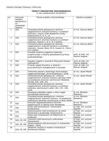 Katedra Geologii Złożowej i Górniczej TEMATY PROJEKTÓW INŻYNIERSKICH w roku akademickim 2016/2017 Lp. 1 Kierunek studiów stacjonarny ch piewszego stopnia GiG 2 GiG 3 GiG 4 GiG 5 GiG 6 GiG 7 GiG 8 GiG 9 GiG 10 GiG 11 12 13 14 15 16 17 18 GiG GiG GiG GiG GiG GiG, IŚ, OŚ GiG, IŚ, OŚ GiG, IŚ, OŚ Temat projektu inżynierskiego Opiekun projektu Charakterystyka geologiczno-złożowa węglonośnych utworów karbonu w profilach otworów z rejonu KWK Bogdanka (LZW): Kolechowice-4, 5, 6, 13. Charakterystyka geologiczno-złożowa węglonośnych utworów karbonu w profilach otworów: Rybnik-1, R-2 i R-3 (GZW) Charakterystyka geologiczno-złożowa węglonośnych utworów karbonu w profilach otworów: Suszec Stary IG-9, Suszec-4, i Wyry137 (GZW) Związek stopnia uwęglenia materiału organicznego z historią geotektoniczną fliszu podhalańskiego. dr inż. Dariusz Botor Kopalny węgiel w utworach fliszowych Karpat Zachodnich Twardy węgiel brunatny w złożach i przyrodniczych wystąpieniach w Europie. prof. dr hab. inż. Marian Wagner prof. dr hab. inż. Marian Wagner Tektonika obszaru złożowego Anna kopalni węgla kamiennego „Anna-Rydułtowy”, GZW Charakterystyka geologiczna i złożowa węglonośnych utworów karbonu górnego GZW na podstawie otworów wiertniczych Bolesław Śmiały 246, 249, 251 Charakterystyka geologiczno-złożowa węglonośnych utworów karbonu w profilach otworów wiertniczych Lublin 120, 127, 129, LZW Korelacja pokładów węgla w złożu węgla brunatnego Szczerców. Charakterystyka geologiczna i złożowa węglonośnych utworów miocenu na podstawie wybranych otworów wiertniczych w złożu Gubin Kierunki zagospodarowania terenów pogórniczych w rejonie Łuku Mużakowa Złoże wód mineralnych i leczniczych Krzeszowice. Wykorzystanie wód mineralnych ze złoża Piwniczna w przemyśle rozlewniczym. Złoże wód mineralnych na Matecznym w Krakowie. Chemizm wód leczniczych uzdrowiska Swoszowice Wykorzystanie wód leczniczych w uzdrowisku Rabka - Zdrój Składniki swoiste w wodach mineralnych Rymanowa-Zdróju. dr inż. Jacek Misiak dr inż. Dariusz Botor dr inż. Dariusz Botor prof. dr hab. inż. Marian Wagner dr inż. Jacek Misiak dr inż. Jacek Misiak dr inż. Barbara Bielowicz dr inż. Barbara Bielowicz dr inż. Barbara Bielowicz dr hab. inż. Lucyna Rajchel dr hab. inż. Lucyna Rajchel dr hab. inż. Lucyna Rajchel dr hab. inż. Lucyna Rajchel dr hab. inż. Lucyna Rajchel dr hab. inż. Lucyna Rajchel 19 20 21 22 23 GiG, IŚ, OŚ GiG, IŚ, OŚ GiG, IŚ, OŚ GiG, IŚ, OŚ GiG 24 GiG 25 26 27 28 29 30 GiG GiG GiG GiG GiG GiG 31 38 39 40 41 dr hab. inż. Lucyna Rajchel dr hab. inż. Lucyna Rajchel Dr inż. Tomasz Toboła Pijalnie wód mineralnych w uzdrowisku Krynica Zdrój. Petrologia soli miodowej w stropie Na1 w rejonie chodnika Ps-3 złoże Bądzów Petrologiczna charakterystyka brekcji anhydrytowo – ilastej na kontakcie Na1-A1g w otworze technicznym nr 2 złoża Bądzów (LGOM) Rozprzestrzenienie brekcji anhydrytowo – ilastej w rejonie chodnika Ps-3 złoża Bądzów (LGOM). Petrologiczna charakterystyka soli kamiennej z otw. Ra10 G-27 złoża Bądzów (LGOM). Analiza wycieków w kopalni soli Bochnia Charakterystyka litologiczna złoża soli bocheńskiej Charakterystyka gipsów mioceńskich w Górkach k / Wislicy Zastosowanie analizy skupień dla poszczególnych typów litofacjalnych soli mioceńskich Dr inż. Tomasz Toboła Dr inż. Tomasz Toboła Dr inż. Tomasz Toboła Dr inż. Tomasz Toboła Dr inż. Helena Pitera Dr inż. Krzysztof Bukowski Dr inż. Krzysztof Bukowski GiG Model prognozy zwierciadła wód podziemnych w obrębie wyrobiska kopalni kruszyw metodami Dr inż. Janusz Magiera GIS GiG Ocena statusu terenów złóż odkrywkowych w planie zagospodarowania gminy Oświęcim (metodą GIS) GiG Analiza zmian wyrobisk kopalni wapieni na S od Kielc w czasie ostatnich 20- lat, z Dr inż. Janusz Magiera wykorzystaniem obrazów teledetekcyjnych OŚ, IŚ Kamieniołom a krajobraz – studium widoczności Dr inż. Janusz Magiera (metodami GIS) GiG Charakterystyka surowcowa Wietnamu GiG Występowanie rud Nb-Ta w Afryce Centralnej GiG Analiza mineralogiczna osadów rzecznych z rejonu Travnika, Bośnia GiG Złoża chromitów w Europie GiG Profil geochemiczny złoża rud miedzi ZG Rudna GiG Złoża surowców mineralnych w Górach Świętokrzyskich 34 37 Tężnia solankowa w Wieliczce GiG 33 36 dr hab. inż. Lucyna Rajchel dr hab. inż. Lucyna Rajchel Budowa geobazy danych historycznych kamieniołomów i odsłonięć piaskowców godulskich na Pogórzu Lanckorońskim (ze zbiorów Pracowni Surowców Skalnych) 32 35 Chemizm szczaw ze źródła Jan A, JanB i Jan C w Krynicy Występowanie solanek termalnych w Ustroniu Śląskim Dr inż. Janusz Magiera Dr inż. Janusz Magiera Prof. dr hab. inż. Adam Piestrzyński Prof. dr hab. inż. Adam Piestrzyński Prof. dr hab. inż. Adam Piestrzyński Prof. dr hab. inż. Adam Piestrzyński Prof. dr hab. inż. Adam Piestrzyński Dr hab. inż. Jadwiga Pieczonka 42 43 44 45 46 GiG GiG GiG GiG GiG 47 GiG 48 GiG 49 GiG 50 GiG 51 GiG 52 GiG 53 GiG 55 56 Złoża rud Sn i W w Afryce Centralnej Potencjał miedzowy Europy - historyczny ws. dzisiejszy stan i prognozy na przyszłość. Minerały rudne w konkrecjach syderytowych utworów środkowej Jury w rejonie Częstochowy. Antymonowa mineralizacja Dolnego Śląska. Dr hab. inż Jadwiga Pieczonka Dr hab. inż Jadwiga Pieczonka Dr hab. inż Jadwiga Pieczonka Dr hab. inż Jadwiga Pieczonka Dr hab. Jarosław Pršek Dr hab. Jarosław Pršek Dr hab. Jarosław Pršek Charakterystyka miedziowej mineralizacje w okolicach Miedzianki (Miedzianka-Ciechanowice- Dr hab. Jarosław Mniszków). Pršek GiG 54 Profil geochemiczny złoża rud miedzi OZG Polkowice-Sieroszowice Badania mineralogiczne limonitów z jaskini Schronisko, w Łączkach III, Dolina Będkowska Analiza mineralogiczna osadów rzecznych z rejonu Travnika, Bośnia GiG GiG GiG Złota mineralizacja na obszarze PilichowiceNielesno. Charak