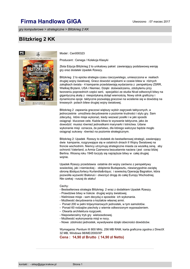Firma Handlowa GIGA Utworzono : 07 marzec 2017 gry komputerowe > strategiczne > Blitzkrieg 2 KK Blitzkrieg 2 KK Model : Cen000323 Producent : Cenega / Kolekcja Klasyki Złota Edycja Blitzkrieg 2 to unikatowy pakiet zawierający podstawową wersję gry oraz dodatek Upadek Rzeszy. Blitzkrieg 2 to epicka strategia czasu rzeczywistego, umieszczona w realiach drugiej wojny światowej. Gracz dowodzi wojskami w czasie bitew w różnych zakątkach świata - 4 kampanie przedstawiają wydarzenia z perspektywy ZSRR, Wielkiej Brytanii, USA i Niemiec. Dzięki doświadczeniu, zdobytemu przy tworzeniu poprzednich części serii, specjaliści ze studia Nival odtworzyli bitwy na gigantyczną skalę z niespotykaną dotąd wiernością. Nowy silnik graficzny i dynamiczne opcje taktyczne pozwalają graczowi na wcielenie się w dowódcę na krwawych polach bitew drugiej wojny światowej. Blitzkrieg 2 zapewnia graczowi większy wybór zagrywek taktycznych, a jednocześnie umożliwia decydowanie o poziomie trudności i stylu gry. Sam zdecyduj, które misje wykonać, kiedy wezwać posiłki i w jaki sposób osiągnąć kluczowe cele. Każda bitwa to wyzwanie taktyczne, jako że dowodzić musisz również jednostkami marynarki i lotnictwa. Udane wykonanie misji oznacza, że państwo, dla którego walczysz będzie mogło osiągnąć sukcesy również na poziomie strategicznym. Blitzkrieg 2: Upadek Rzeszy to dodatek do bestsellerowej strategii, zawierający dwie kampanie, rozgrywające się w ostatnich dniach II Wojny Światowej na froncie wschodnim. Niemcy utrzymują strategiczne miasta za wszelką cenę, aby ochronić Vaterland, a Armia Czerwona bezustannie naciera i jest coraz bliżej Berlina. Wiosną roku 1945 toczyły się najcięższe bitwy w całej drugiej wojnie. Upadek Rzeszy przedstawia ostatnie dni wojny zarówno z perspektywy sowieckiej, jak i niemieckiej - oblężenie Budapesztu, niewiarygodnie zaciętą obronę „fortecy Kurlandia” i sowiecką Operację Bagration, która pozwoliła wyzwolić Białoruś i otworzyć drogę do całej Europy Wschodniej. Nie czekaj - ruszaj do ataku! Cechy: - Bestsellerowa strategia Blitzkrieg 2 wraz z dodatkiem Upadek Rzeszy. - Prawdziwe bitwy w trakcie drugiej wojny światowej. - Nieliniowe misje - sam decyduj o sposobie ich wykonania. - Możliwość decydowania o kształcie własnej armii. - Ponad 200 w pełni trójwymiarowych jednostek, w tym samolotów. - Ponad 60 rodzajów piechoty z wiernie odtworzonym wyposażeniem. - Otwarta architektura rozgrywki. - Niepowtarzalny tryb gry wieloosobowej. - Możliwość wykonywania misji w nocy. - Nowe zdolności jednostek, wywoływane dzięki obecności dowódców. Wymagania: Pentium III 800 MHz, 256 MB RAM, karta graficzna zgodna z DirectX 32 MB, Windows 98/ME/2000/XP Cena : 14,90 zł Brutto ( 14,90 zł Netto) kontakt : - [email protected] Strona 1