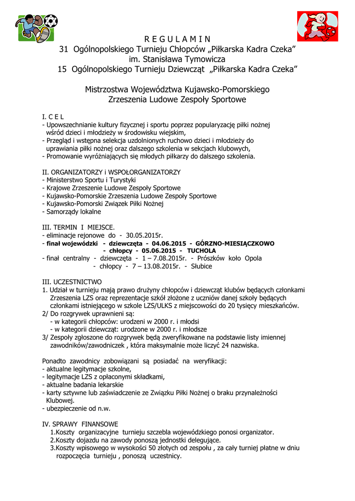 REGULAMIN 31 Ogólnopolskiego Turnieju Chłopców „Piłkarska Kadra Czeka” im. Stanisława Tymowicza 15 Ogólnopolskiego Turnieju Dziewcząt „Piłkarska Kadra Czeka” Mistrzostwa Województwa Kujawsko-Pomorskiego Zrzeszenia Ludowe Zespoły Sportowe I. C E L - Upowszechnianie kultury fizycznej i sportu poprzez popularyzację piłki nożnej wśród dzieci i młodzieży w środowisku wiejskim, - Przegląd i wstępna selekcja uzdolnionych ruchowo dzieci i młodzieży do uprawiania piłki nożnej oraz dalszego szkolenia w sekcjach klubowych, - Promowanie wyróżniających się młodych piłkarzy do dalszego szkolenia. II. ORGANIZATORZY i WSPOŁORGANIZATORZY - Ministerstwo Sportu i Turystyki - Krajowe Zrzeszenie Ludowe Zespoły Sportowe - Kujawsko-Pomorskie Zrzeszenia Ludowe Zespoły Sportowe - Kujawsko-Pomorski Związek Piłki Nożnej - Samorządy lokalne III. TERMIN I MIEJSCE. - eliminacje rejonowe do - 30.05.2015r. - finał wojewódzki - dziewczęta - 04.06.2015 - GÓRZNO-MIESIĄCZKOWO - chłopcy - 05.06.2015 - TUCHOLA - finał centralny - dziewczęta - 1 – 7.08.2015r. - Prószków koło Opola - chłopcy - 7 – 13.08.2015r. - Słubice III. UCZESTNICTWO 1. Udział w turnieju mają prawo drużyny chłopców i dziewcząt klubów będących członkami Zrzeszenia LZS oraz reprezentacje szkół złożone z uczniów danej szkoły będących członkami istniejącego w szkole LZS/ULKS z miejscowości do 20 tysięcy mieszkańców. 2/ Do rozgrywek uprawnieni są: - w kategorii chłopców: urodzeni w 2000 r. i młodsi - w kategorii dziewcząt: urodzone w 2000 r. i młodsze 3/ Zespoły zgłoszone do rozgrywek będą zweryfikowane na podstawie listy imiennej zawodników/zawodniczek , która maksymalnie może liczyć 24 nazwiska. Ponadto zawodnicy zobowiązani są posiadać na weryfikacji: - aktualne legitymacje szkolne, - legitymacje LZS z opłaconymi składkami, - aktualne badania lekarskie - karty sztywne lub zaświadczenie ze Związku Piłki Nożnej o braku przynależności Klubowej. - ubezpieczenie od n.w. IV. SPRAWY FINANSOWE 1.Koszty organizacyjne turnieju szczebla wojewódzkiego ponosi organizator. 2.Koszty dojazdu na zawody ponoszą jednostki delegujące. 3.Koszty wpisowego w wysokości 50 złotych od zespołu , za cały turniej płatne w dniu rozpoczęcia turnieju , ponoszą uczestnicy. IV.REGULAMIN ROZGRYWEK W rozgrywkach obowiązują przepisy i postanowienia wydane przez PZPN dla kategorii juniora młodszego oraz ustalenia zawarte w niniejszym regulaminie. 1. Czas gry – 2 x 40 minut /lub krócej/ z 10 minutową przerwą 2. Ubiór to stroje jednolite dla całej drużyny, obuwie piłkarskie z wyłączeniem wkrętów oraz obowiązkowo ochraniacze piłkarskie, zgodnie z przepisami PZPN. 3. Boisko – zweryfikowane zgodnie z przepisami PZPN. 4. Piłki nożne nr 5. 5. Na wszystkich szczeblach rozgrywek dozwolona jest zmiana 7 zawodników w tym bramkarz (nie ma zmian powrotnych). 6. Kary wychowawcze – 3, 5, 10 minut oraz wykluczenie w meczu w przypadku otrzymania czerwonej kartki. Otrzymanie czerwonej kartki wyklucza zawodnika z udziału w kolejnym meczu na danym szczeblu rozgrywek. Kary za wyjątkowe niesportowe zachowanie się będą rozpatrywane indywidualnie przez organizatorów. 7. Punktacja: a/ za zwycięstwo - 3 punkty b/ za remis - 1 punkt c/ za przegraną - 0 punktów Kolejność drużyn ustala się wg następujących zasad: a/ liczba zdobytych punktów b/ wynik bezpośredniego meczu / dot. dwóch zainteresowanych drużyn / c/ korzystniejsza różnica bramek d/ większa ilość zdobytych bramek e/ w przypadku równej ilości punktów przez więcej jak dwie drużyny o kolejności decyduje mała tabela pomiędzy zainteresowanymi drużynami. 8. Podczas trwania rozgrywek będą prowadzone następujące klasyfikacje: - drużynowa - najlepszy zawodnik - najlepszy bramkarz - król strzelców 9. System rozgrywek w finale wojewódzkim „każdy z każdym” V. NAGRODY Organizatorzy dla zwycięskich zespołów zapewniają puchary, medale i dyplomy. Mistrz województwa awansuje do finału centralnego. VI. UWAGI KOŃCOWE Organizator nie będzie rozpatrywać protestów dotyczących decyzji podjętych przez sędziów prowadzących zawody. W sprawach nie ujętych w regulaminie rozstrzyga organizator. ZGŁOSZENIA DRUŻYN DO UDZIAŁU W TURNIEJU WOJEWÓDZKIM NALEŻY DOKONAĆ W NIEPRZEKRACZALNYM TERMINIE DO DNIA 25 KWIETNIA 2015r DROGĄ ELEKTRONICZNĄ NA ADRES: [email protected] W oparciu o zgłoszenia dokonany zostanie terytorialny podział na grupy oraz ustalone zostaną miejsca i terminy przeprowadzenia turniejów rejonowych. Do zainteresowanych zespołów przesłany zostanie stosowny komunikat. Ze sportowym pozdrowieniem Organizatorzy