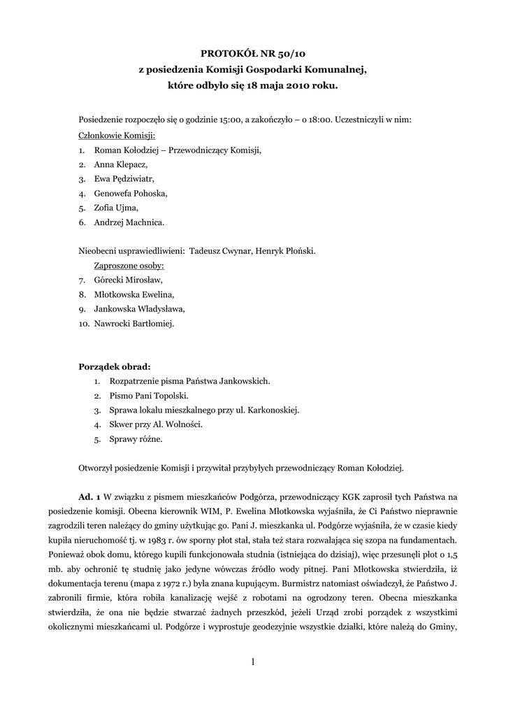 PROTOKÓŁ NR 50/10 z posiedzenia Komisji Gospodarki Komunalnej, które odbyło się 18 maja 2010 roku. Posiedzenie rozpoczęło się o godzinie 15:00, a zakończyło – o 18:00. Uczestniczyli w nim: Członkowie Komisji: 1. Roman Kołodziej – Przewodniczący Komisji, 2. Anna Klepacz, 3. Ewa Pędziwiatr, 4. Genowefa Pohoska, 5. Zofia Ujma, 6. Andrzej Machnica. Nieobecni usprawiedliwieni: Tadeusz Cwynar, Henryk Płoński. Zaproszone osoby: 7. Górecki Mirosław, 8. Młotkowska Ewelina, 9. Jankowska Władysława, 10. Nawrocki Bartłomiej. Porządek obrad: 1. Rozpatrzenie pisma Państwa Jankowskich. 2. Pismo Pani Topolski. 3. Sprawa lokalu mieszkalnego przy ul. Karkonoskiej. 4. Skwer przy Al. Wolności. 5. Sprawy różne. Otworzył posiedzenie Komisji i przywitał przybyłych przewodniczący Roman Kołodziej. Ad. 1 W związku z pismem mieszkańców Podgórza, przewodniczący KGK zaprosił tych Państwa na posiedzenie komisji. Obecna kierownik WIM, P. Ewelina Młotkowska wyjaśniła, że Ci Państwo nieprawnie zagrodzili teren należący do gminy użytkując go. Pani J. mieszkanka ul. Podgórze wyjaśniła, że w czasie kiedy kupiła nieruchomość tj. w 1983 r. ów sporny płot stał, stała też stara rozwalająca się szopa na fundamentach. Ponieważ obok domu, którego kupili funkcjonowała studnia (istniejąca do dzisiaj), więc przesunęli płot o 1,5 mb. aby ochronić tę studnię jako jedyne wówczas źródło wody pitnej. Pani Młotkowska stwierdziła, iż dokumentacja terenu (mapa z 1972 r.) była znana kupującym. Burmistrz natomiast oświadczył, że Państwo J. zabronili firmie, która robiła kanalizację wejść z robotami na ogrodzony teren. Obecna mieszkanka stwierdziła, że ona nie będzie stwarzać żadnych przeszkód, jeżeli Urząd zrobi porządek z wszystkimi okolicznymi mieszkańcami ul. Podgórze i wyprostuje geodezyjnie wszystkie działki, które należą do Gminy, 1 tym bardziej że dzierżawiąc ów grunt od Gminy, płaciła podatek. Radny P. Machnica spytał, czy jest to początek prostowania planu na tej ulicy czy tylko ważny jest odcinek dotyczący P. Jankowskich? Burmistrz odpowiedział, ze będzie rozpoczęty proces projektowania całej drogi (kiedy? nie wiadomo). P. Pohoska z kolei spytała czy są dowody pisemne na pertraktacje z P. Jankowskimi? P. Młotkowska odpowiedziała, że nie ma. Komisja na temat tej sprawy postanowiła jak we wnioskach. Ad. 2 Odnośnie pisma, z jakim zwróciła się mieszkanka dzielnicy Krzaczyna ul. (...) o braku drogi i dojazdu do domu, który został wybudowany, członkowie komisji byli na wizji w tym miejscu. Okazało się, że dom stoi, ale nie ma przyzwoitego dojazdu do niego. Po analizie, jaką przeprowadził Przewodniczący KGK, okazało się, że dom jest jeszcze nie odebrany przez nadzór, Państwo Ci nie są tam zameldowani, więc na razie nie ma podstaw do drogi. Ad. 3 Członkowie KGK zwrócili uwagę po raz drugi na urocze niegdyś miejsce, jakim jest skwer „pod kasztanami” przy ul. Wolności. Obecnie skwer ten został przeistoczony w parking. Stoi na nim non-stop 3-5 samochodów, jeżdżą po trawniku. Komisja składa odpowiedni wniosek w tej sprawie. Ad. 4 W sprawach różnych P. Pohoska pytała o termin zakończenia robót przez firmę SKANSKA przy ul. Wiejskiej i Kowalskiej. Burmistrz odpowiedział, że spodziewa się zakończenia do 6-go czerwca, gdyż tradycyjnie będą jechać kolarze, ale do końca lipca mają być zakończone roboty drogowe, natomiast chodniki będzie robił później Urząd Miejski. Radna Ujma zwróciła uwagę na wyrwę w murze oporowym na wysokości Wiejska 18. P. Nawrocki zapisał obiecał, że zrobi. P. Kołodziej pytał, kiedy będzie naprawa cząstkowa dróg w Krzaczynie? Burmistrz - „obecnie jest umowa z firmą, która będzie robić ul. Sienkiewicza”. P. Kołodziej upomniał się również o protokół z inwentaryzacji mieszkań w domach 100% będących własnością gminy. P. Burmistrz odpowiedział, że nie odebrała tej inwentaryzacji Dyrektor ZEZK-u. Radna P. Klepacz stwierdziła, że nowo wybudowana ulica Batorego jest niszczona przez samochody wysokotonażowe. Komisja zadecydowała jak we wnioskach. Ostatnim elementem w sprawach różnych były skargi mieszkańców z budynku przy ul. Wiejskiej 40 na istniejącą tam w budynku firmę. Tak jak we wnioskach. Na tym posiedzenie zakończono. Wnioski Komisji: 1. Komisja Gospodarki Komunalnej wnioskuje do Pana Burmistrza, aby w przypadku projektowania drogi na Podgórze, Urząd Miejski w Kowarach dokonał wyprostowania planu geodezyjnego dla całego ciągu tej ulicy, a nie tak jak obecnie, jednych tylko mieszkańców tj. (...) P. J. 2. Odnośnie pisma P. Topolski KGK nie podjęła żadnej decyzji, gdyż dom jest nie odebrany przez nadzór, nikt nie jest tam zameldowany. 3. W związku z zaniedbaniami w utrzymaniu porządku na skwerze przy ul. Wolności „pod kasztanami”, który pełni aktualnie rolę parkingu, KGK wnioskuje o przywrócenie skweru do stanu, jaki być powinien. 4. KGK wnioskuje do P. Burmistrza, aby przyjrzał się sprawie działalności gospodarczej lokatora w budynku przy ul. Wiejskiej 40. Mimo interwencji zarządcy (ZEZK, budynek jest wspólnotą), 2 mieszkaniec w dalszym ciągu prowadzi swoją działalność w mieszkaniu i na strychu zakłócając spokój pozostałym lokatorom. Budynek jest wielorodzinny. Protokołowała: Przewodniczący Zofia Ujma Komisji Gospodarki Komunalnej 3