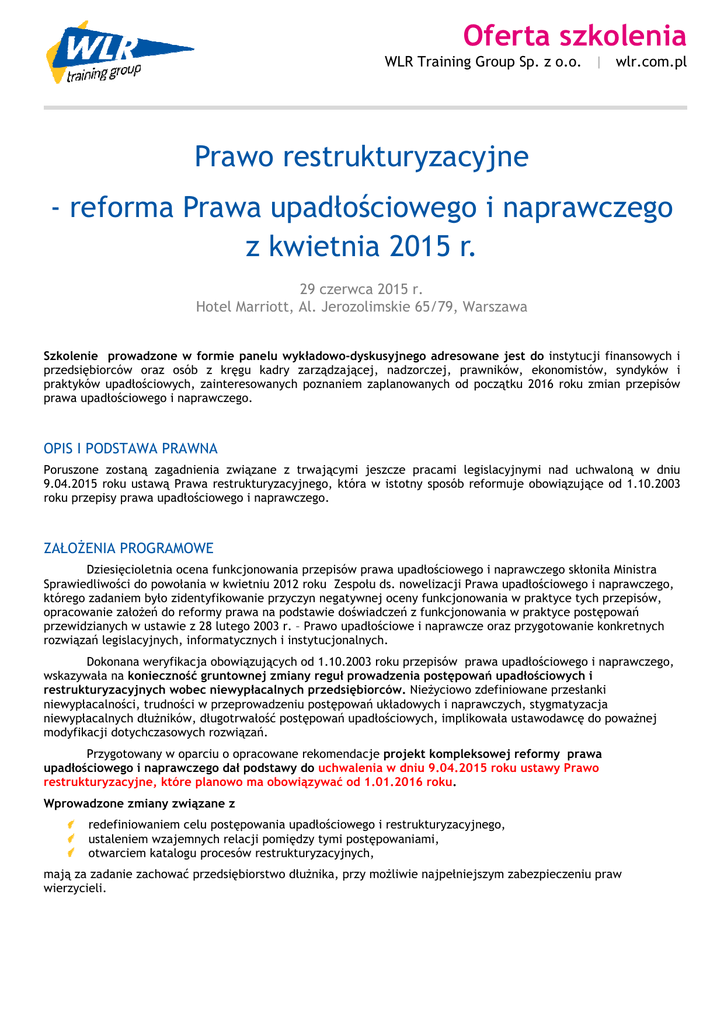 Oferta szkolenia WLR Training Group Sp. z o.o. | wlr.com.pl Prawo restrukturyzacyjne - reforma Prawa upadłościowego i naprawczego z kwietnia 2015 r. 29 czerwca 2015 r. Hotel Marriott, Al. Jerozolimskie 65/79, Warszawa Szkolenie prowadzone w formie panelu wykładowo-dyskusyjnego adresowane jest do instytucji finansowych i przedsiębiorców oraz osób z kręgu kadry zarządzającej, nadzorczej, prawników, ekonomistów, syndyków i praktyków upadłościowych, zainteresowanych poznaniem zaplanowanych od początku 2016 roku zmian przepisów prawa upadłościowego i naprawczego. OPIS I PODSTAWA PRAWNA Poruszone zostaną zagadnienia związane z trwającymi jeszcze pracami legislacyjnymi nad uchwaloną w dniu 9.04.2015 roku ustawą Prawa restrukturyzacyjnego, która w istotny sposób reformuje obowiązujące od 1.10.2003 roku przepisy prawa upadłościowego i naprawczego. ZAŁOŻENIA PROGRAMOWE Dziesięcioletnia ocena funkcjonowania przepisów prawa upadłościowego i naprawczego skłoniła Ministra Sprawiedliwości do powołania w kwietniu 2012 roku Zespołu ds. nowelizacji Prawa upadłościowego i naprawczego, którego zadaniem było zidentyfikowanie przyczyn negatywnej oceny funkcjonowania w praktyce tych przepisów, opracowanie założeń do reformy prawa na podstawie doświadczeń z funkcjonowania w praktyce postępowań przewidzianych w ustawie z 28 lutego 2003 r. – Prawo upadłościowe i naprawcze oraz przygotowanie konkretnych rozwiązań legislacyjnych, informatycznych i instytucjonalnych. Dokonana weryfikacja obowiązujących od 1.10.2003 roku przepisów prawa upadłościowego i naprawczego, wskazywała na konieczność gruntownej zmiany reguł prowadzenia postępowań upadłościowych i restrukturyzacyjnych wobec niewypłacalnych przedsiębiorców. Nieżyciowo zdefiniowane przesłanki niewypłacalności, trudności w przeprowadzeniu postępowań układowych i naprawczych, stygmatyzacja niewypłacalnych dłużników, długotrwałość postępowań upadłościowych, implikowała ustawodawcę do poważnej modyfikacji dotychczasowych rozwiązań. Przygotowany w oparciu o opracowane rekomendacje projekt kompleksowej reformy prawa upadłościowego i naprawczego dał podstawy do uchwalenia w dniu 9.04.2015 roku ustawy Prawo restrukturyzacyjne, które planowo ma obowiązywać od 1.01.2016 roku. Wprowadzone zmiany związane z redefiniowaniem celu postępowania upadłościowego i restrukturyzacyjnego, ustaleniem wzajemnych relacji pomiędzy tymi postępowaniami, otwarciem katalogu procesów restrukturyzacyjnych, mają za zadanie zachować przedsiębiorstwo dłużnika, przy możliwie najpełniejszym zabezpieczeniu praw wierzycieli. PROGRAM SZKOLENIA 1. Ocena dotychczasowych rozwiązań w zakresie praktycznego funkcjonowania postępowań naprawczych, układowych i wstępnego zgromadzenia wierzycieli. Identyfikacja przyczyn takiego stanu rzeczy. 2. Podstawowe założenia reformy w zakresie restrukturyzacji przedsiębiorstw. Restrukturyzacja zamiast likwidacji. Skuteczna restrukturyzacja. Prawo upadłościowe nie stygmatyzuje przedsiębiorców. Prostota (odformalizowanie) postępowań. 3. Podstawa prawna i termin wszczęcia postępowań restrukturyzacyjnych i postępowania upadłościowego - nowa definicja niewypłacalności. 4. Przewidywane rodzaje postępowań restrukturyzacyjnych, schemat ich przebiegu i charakterystyka. Podstawy odmowy otwarcia postępowania restrukturyzacyjnego. postępowanie o zatwierdzenie układu przyspieszone postępowanie układowe; postępowanie układowe; postępowanie sanacyjne; układ upadłościowy. 5. Rola i pozycja wierzycieli w postępowaniu restrukturyzacyjnym tryb ustalania spisu wierzytelności, wierzytelności spornych, nowe regulacje dotyczące układu. 6. Omówienie najistotniejszych zmian w Prawie upadłościowym m.in. uproszczenie procedur, przygotowana likwidacja - ostatnia szansa uratowania przedsiębiorstwa i zagrożenia płynące z wykorzystania tej instytucji w celu pokrzywdzenia wierzycieli. 7. Rola, obowiązki i wzajemne relacje pomiędzy organami postępowań restrukturyzacyjnych i upadłościowych. sąd restrukturyzacyjny i upadłościowy, sędzia komisarz, doradca restrukturyzacyjny, syndyk, nadzorca układu, nadzorca sądowy, zarządca, rada wierzycieli, zgromadzenie wierzycieli, itp. 8. Podsumowanie, pytania i dyskusja. HARMONOGRAM 09:45 10:00 11:30 11:45 13:30 14:00 16:00 - 10:00 - 11:30 - 11:45 - 13:30 - 14:00 - 16:00 Rejestracja i przywitanie uczestników Szkolenie Przerwa kawowa Szkolenie Lunch Szkolenie Zakończenie szkolenia PROWADZĄCY Sędzia Janusz Płoch Przewodniczący VIII Wydziału Gospodarczego dla spraw upadłościowych i naprawczych Sądu Rejonowego dla Krakowa – Śródmieścia w Krakowie; Przewodniczący Sekcji Prawa Upadłościowego Instytutu Allerhanda w Krakowie; Przewodniczący powołanego w kwietniu 2012 roku przez Ministra Sprawiedliwości zespołu ekspertów mającego na celu opracowanie rekomendacji do reformy prawa upadłościowego i naprawczego. FORMULARZ ZGŁOSZENIOWY Prosimy przesłać faksem: 22 632 23 72 lub: [email protected] Prawo restrukturyzacyjne - reforma Prawa upadłościowego i naprawczego z kwietnia 2015 r. 29 czerwca 2015 r. Hotel Marriott, Al. Jerozolimskie 65/79, Warszawa Imiona, nazwiska oraz stanowiska uczestników: Nazwa firmy: NIP: Adres firmy: Tel: Fax: Proszę o przesłanie potwierdzenia na mój e-mail Proszę o wystawienie faktury VAT E-mail: Uwagi: Cena uczestnictwa 690 PLN + 23% VAT - koszt udziału jednej osoby UWAGA! W przypadku gdy udział w szkoleniu jest finansowany co najmniej w 70% ze środków publicznych stosujemy stawkę zw VAT Warunki uczestnictwa • • • • • • • • • • • • Cena obejmuje: prelekcje, materiały, certyfikat oraz wyżywienie. Po otrzymaniu zgłoszenia prześlemy Państwu potwierdzenie udziału w szkoleniu oraz fakturę pro forma. Prosimy o dokonanie wpłaty zgodnie z terminem płatności podanym na fakturze proforma. Wpłaty należy dokona