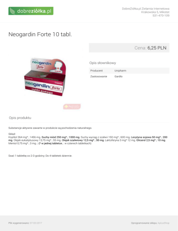 DobreZiółka.pl Zielarnia Internetowa Krakowska 5, Mikstat 531-470-109 Neogardin Forte 10 tabl. Cena: 6,25 PLN Opis słownikowy Producent Unipharm Zastosowanie Gardło Opis produktu Substancje aktywne zawarte w produkcie są pochodzenia naturalnego. Skład: Ksylitol 364 mg* ; 1456 mg. Suchy miód 250 mg* ; 1000 mg. Suchy wyciąg z szałwii 150 mg* ; 600 mg. Lecytyna sojowa 50 mg* ; 200 mg. Olejek eukaliptusowy 13,75 mg* ; 55 mg. Olejek szałwiowy 12,5 mg* ; 50 mg. Laktoferyna 3 mg* 12 mg. Glicerol 2,5 mg* ; 10 mg. Mentol 0,75 mg* ; 3 mg .: (* w jednej tabletce ; w czterech tabletkach) Ssać 1 tabletkę co 2-3 godziny; Do 4 tabletek dziennie. Plik wygenerowano: 07-03-2017 Powered by TCPDF (www.tcpdf.org) Oprogramowanie sklepu: AptusShop